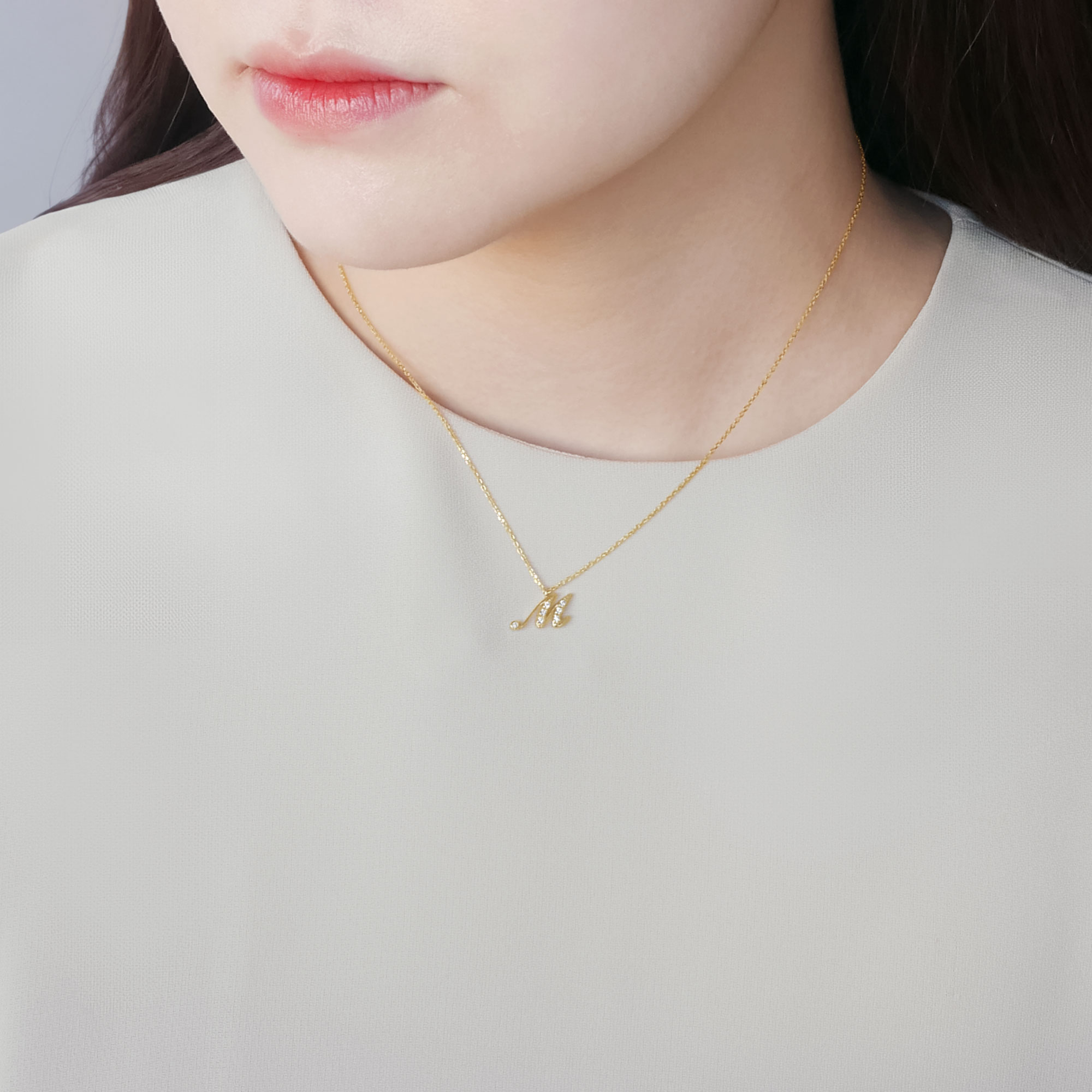 羽ペンのレタリングのような、華やかでエレガントな印象のイニシャルネックレス。