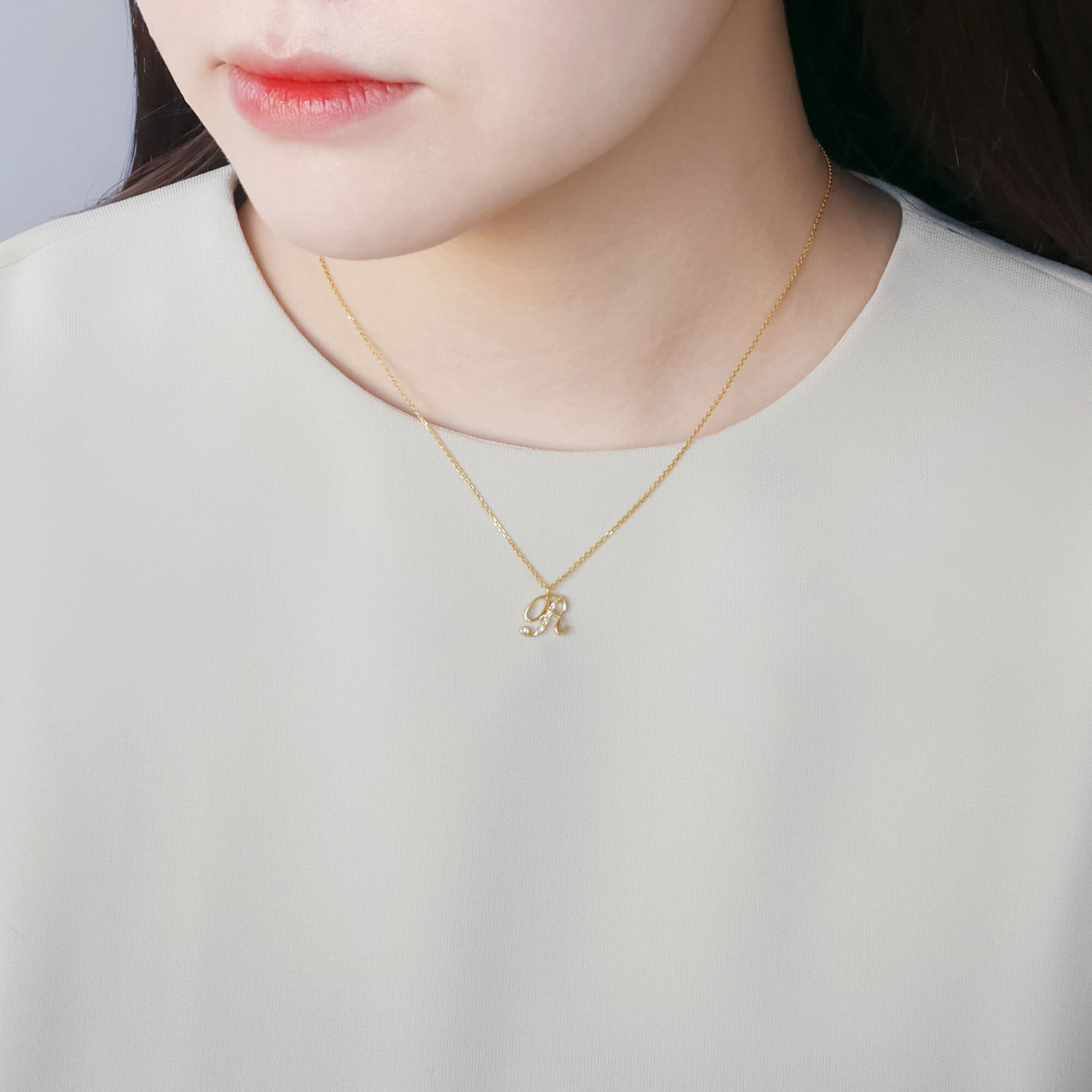 羽ペンのレタリングのような、華やかでエレガントな印象のイニシャルネックレス。