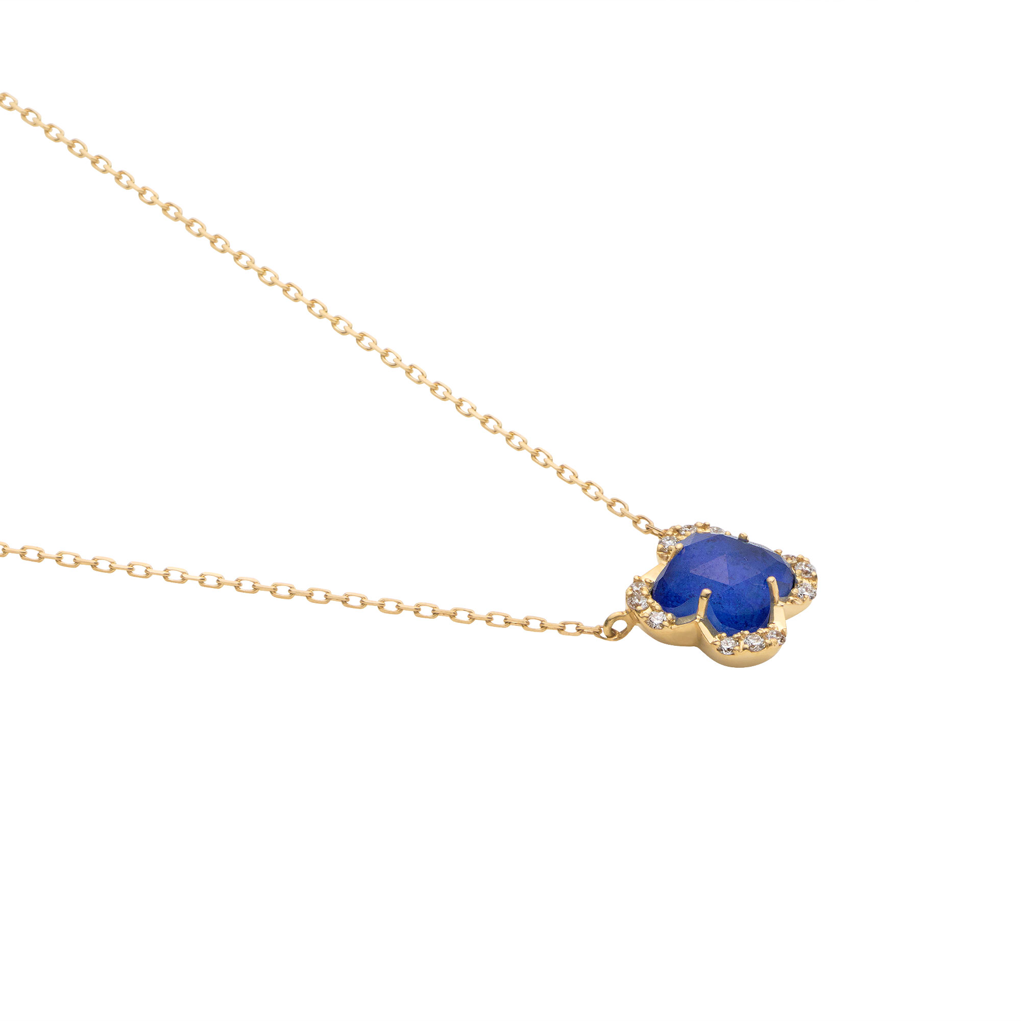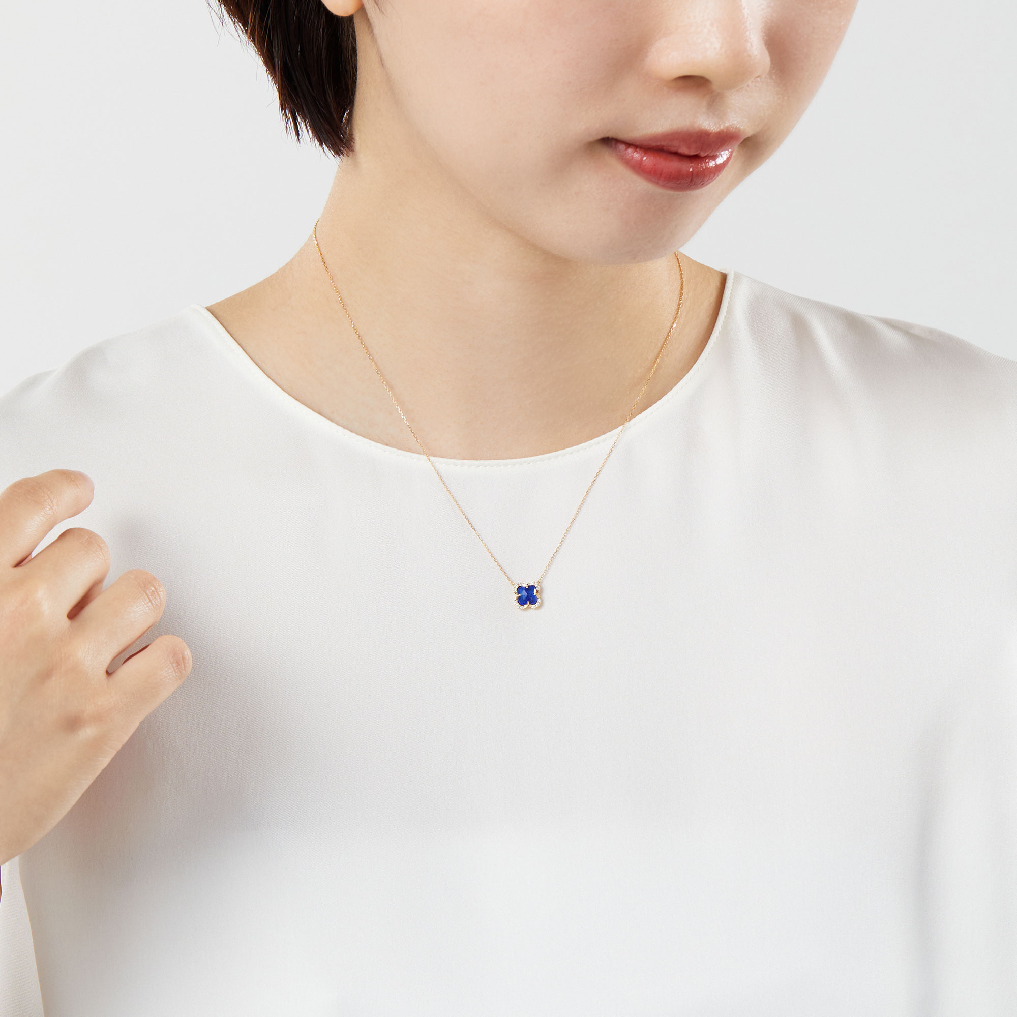ラピスラズリとブルートパーズを組み合わせた色鮮やかなカラーリングで、クローバーを可愛らしく描いたネックレス。