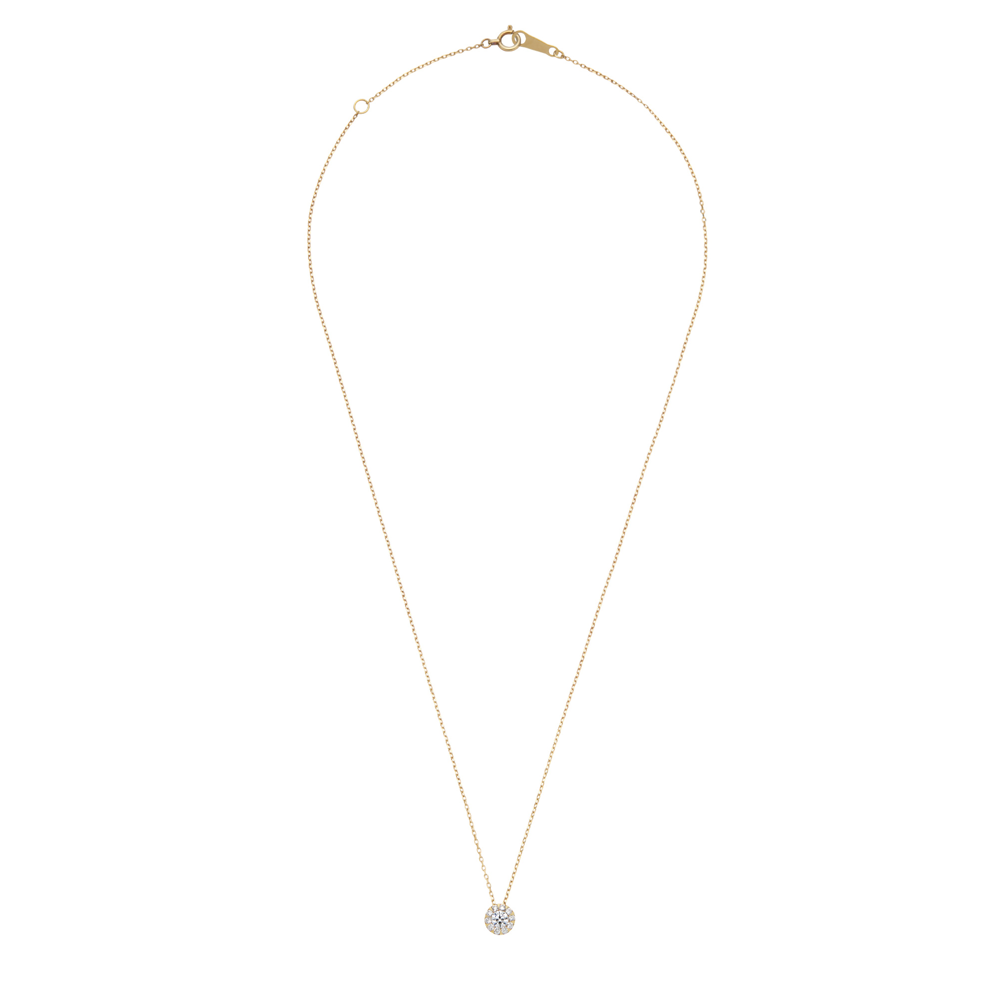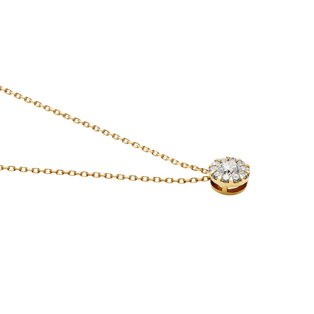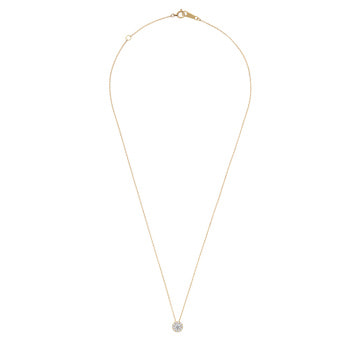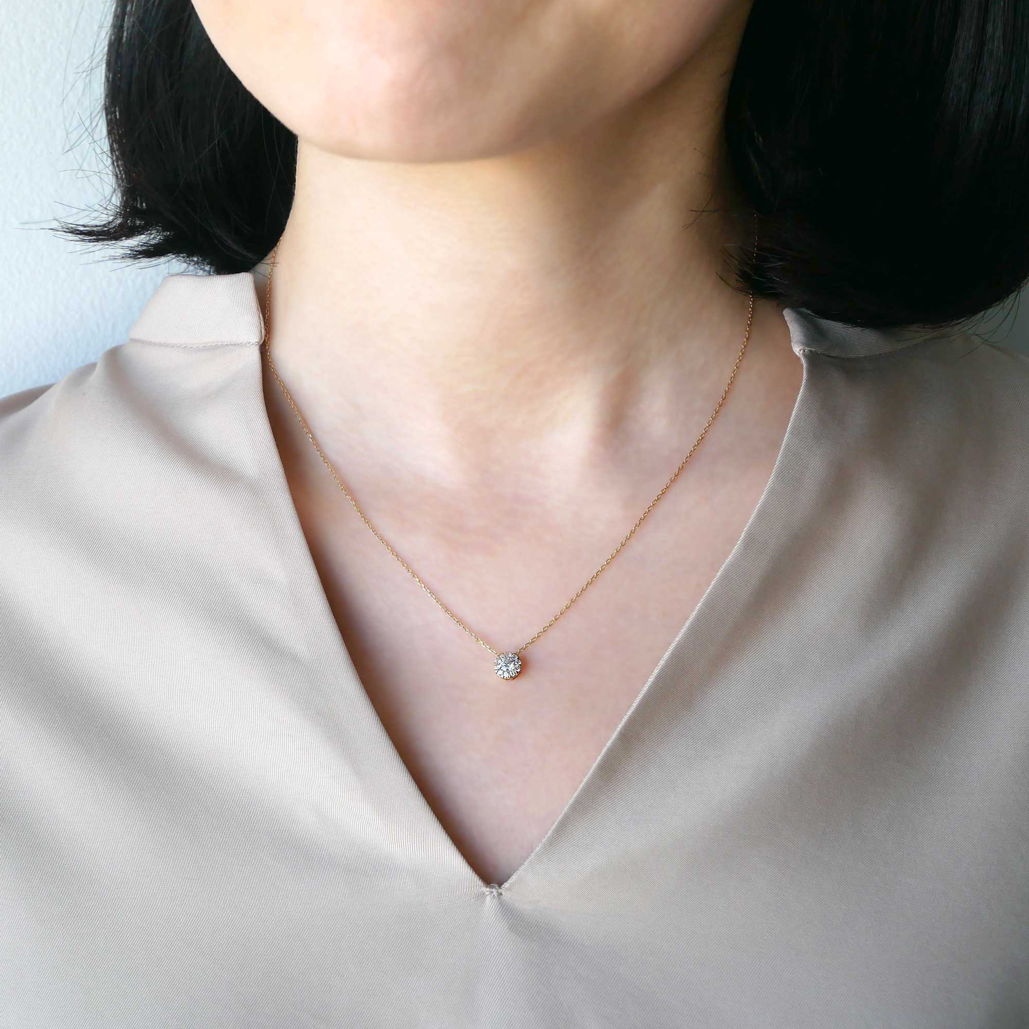 センターのダイヤモンドの周りをフラワーリースのようなメレダイヤモンドで縁取った、存在感のある輝きが魅力のネックレス。