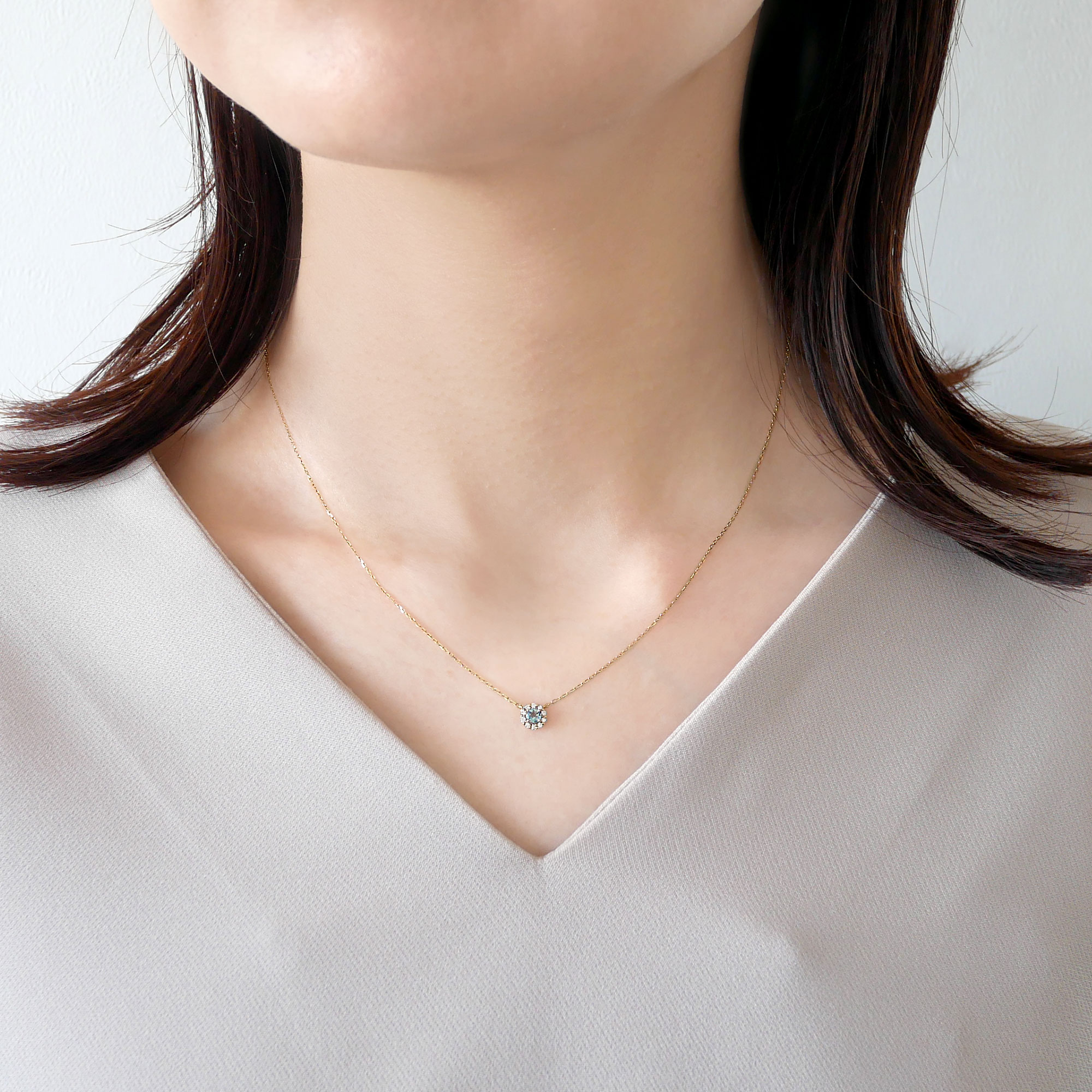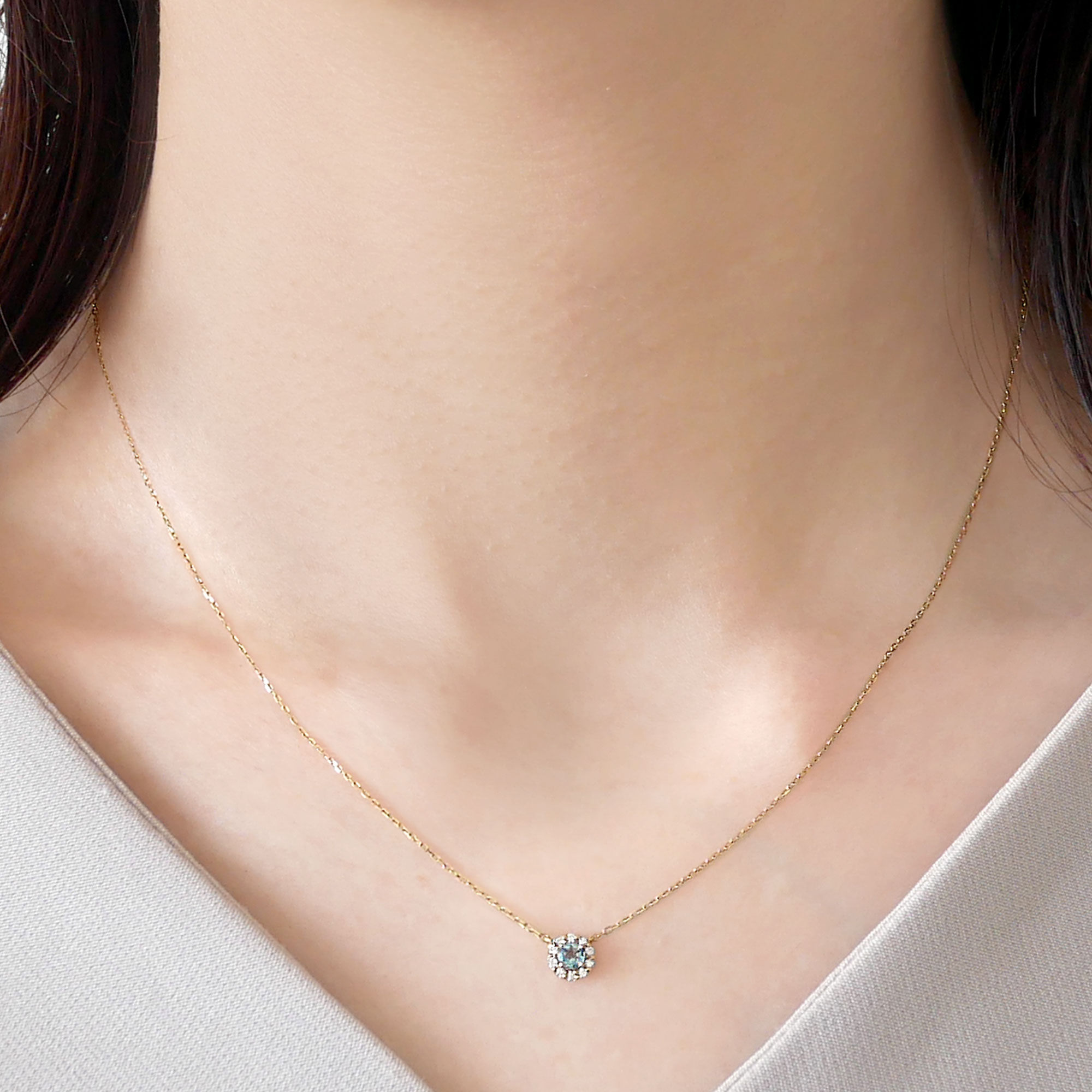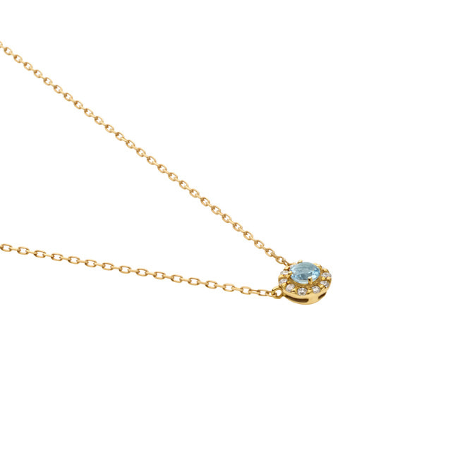 みずみずしく爽やかなアクアマリンをメレダイヤモンドで取り巻いた、さりげなくエレガントなデザインのネックレス。