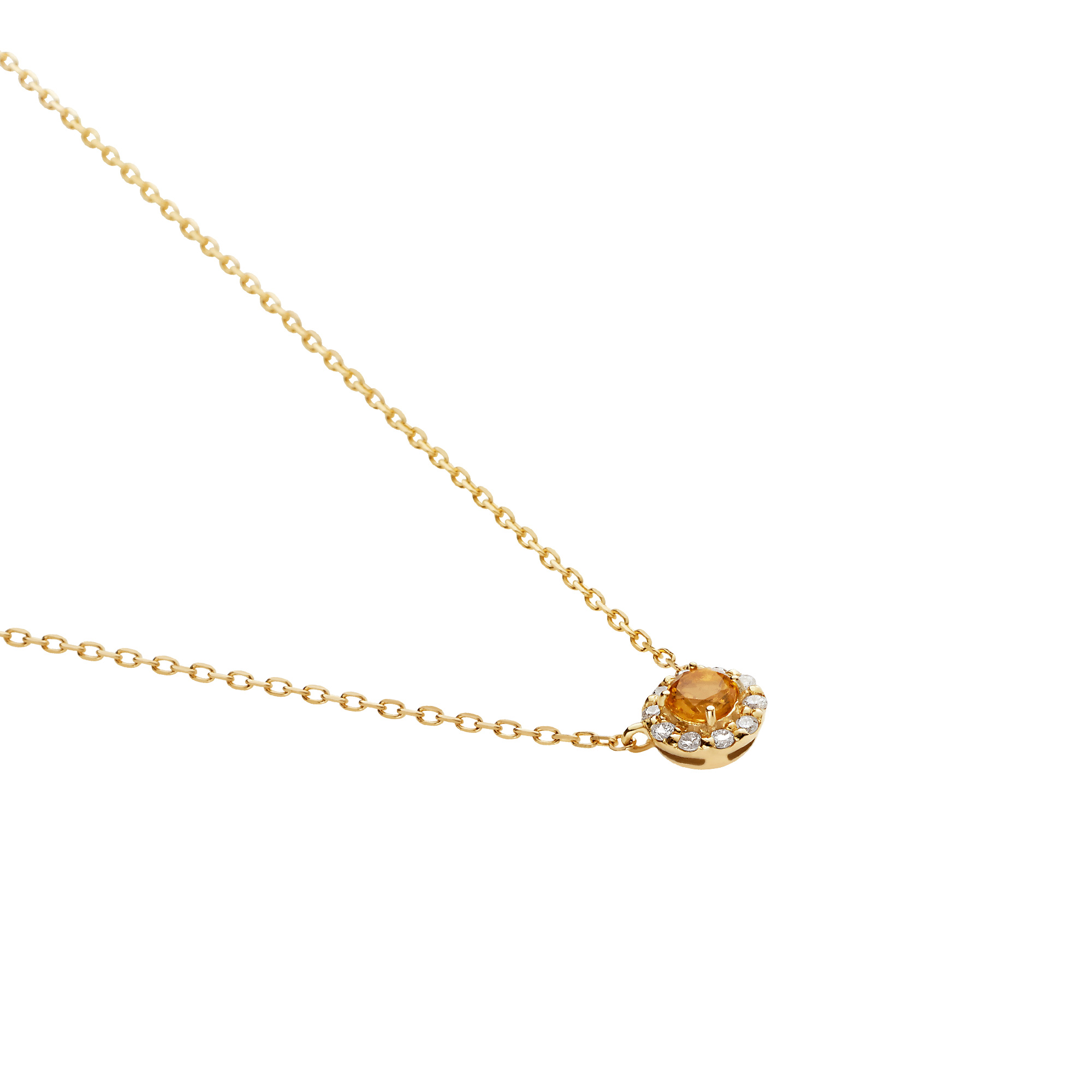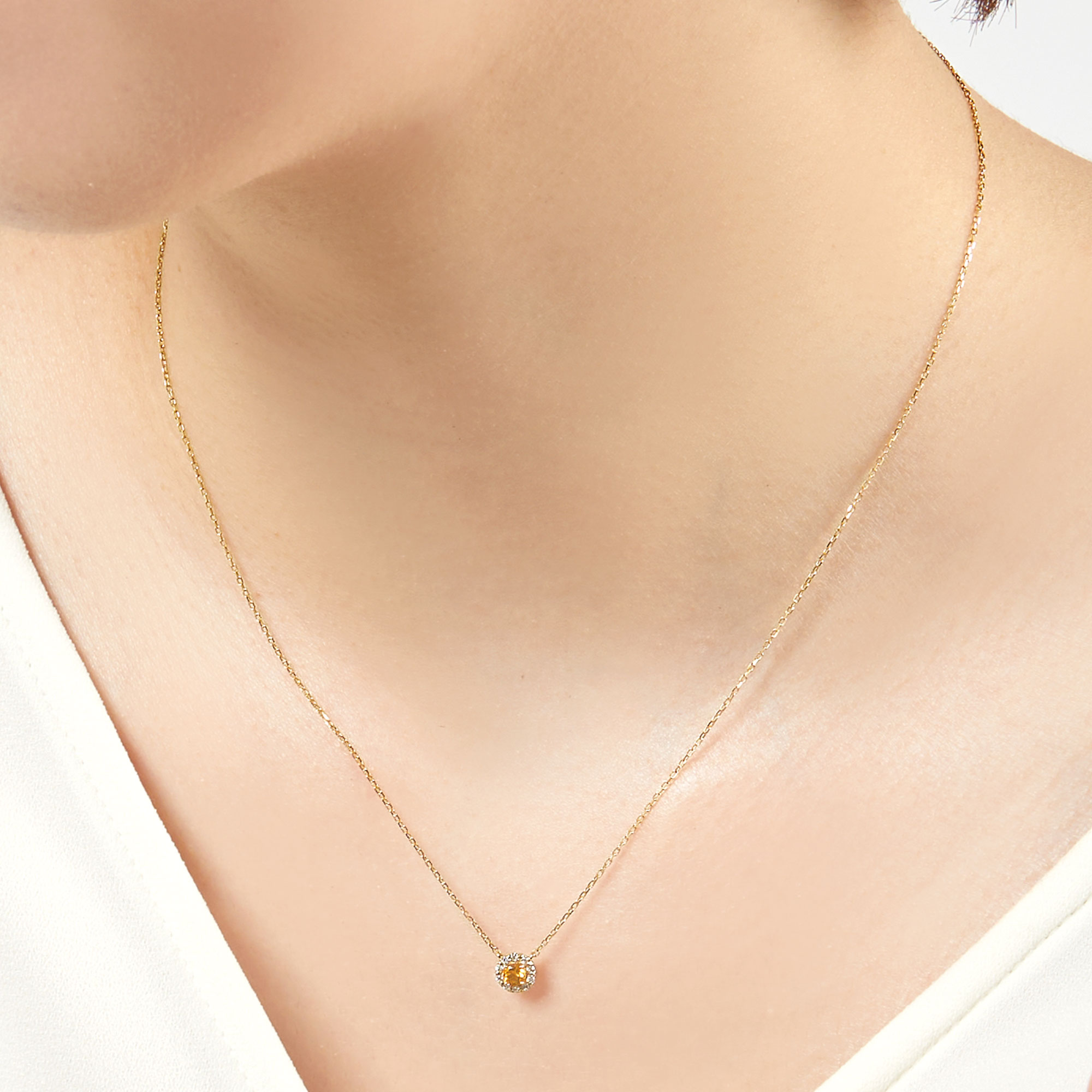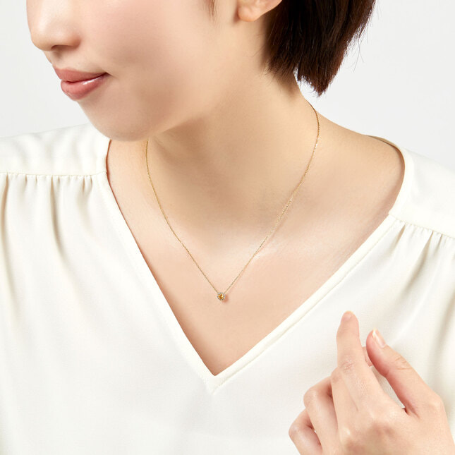 深みのある煌めきが印象的なシトリンをメレダイヤモンドで取り巻いた、さりげなくエレガントなデザインのネックレス。