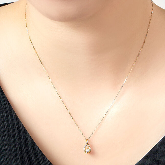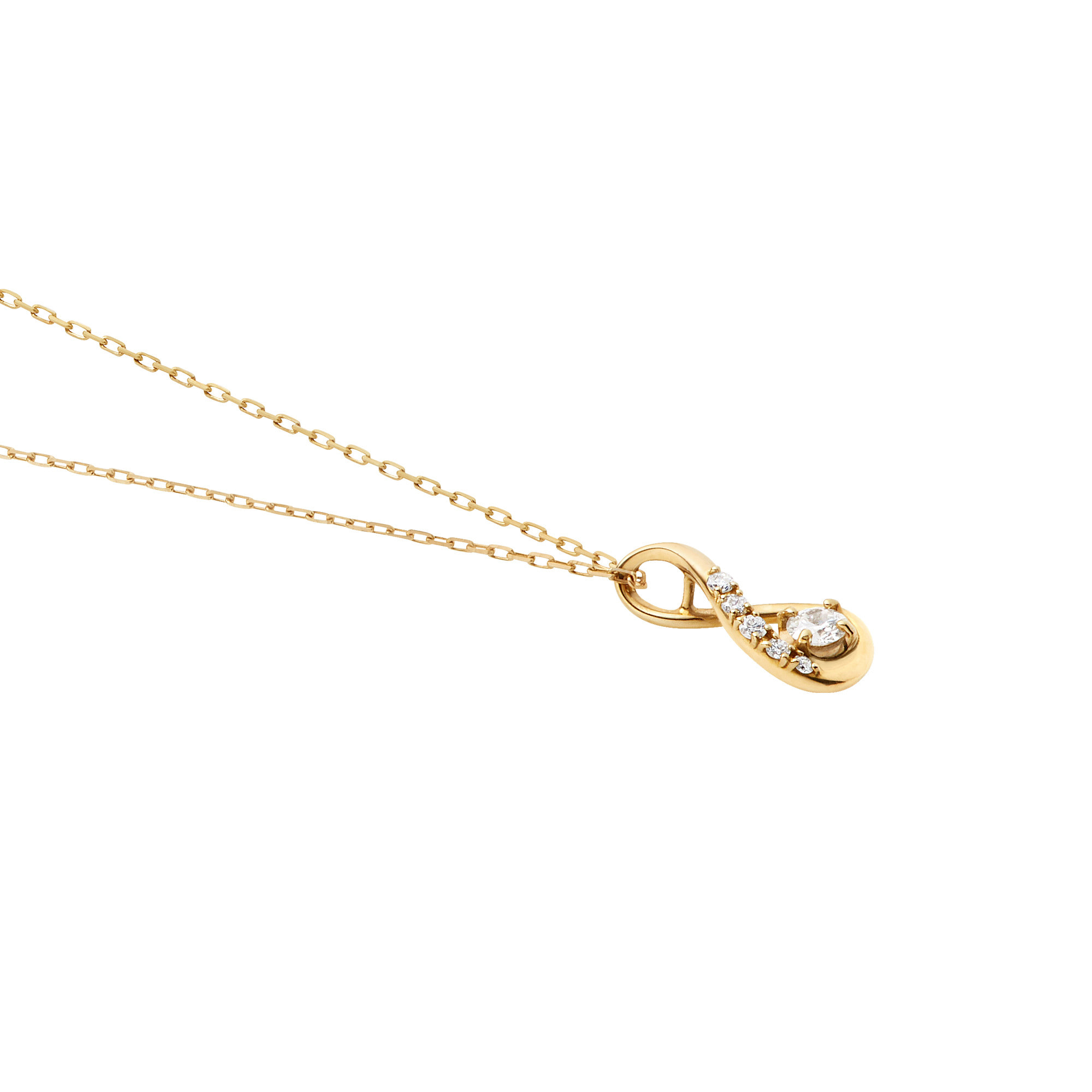 ひねりを加えたイエローゴールドのラインには、アシンメトリーに配されたダイヤモンドがきらめきをプラスして華やかな胸元に。