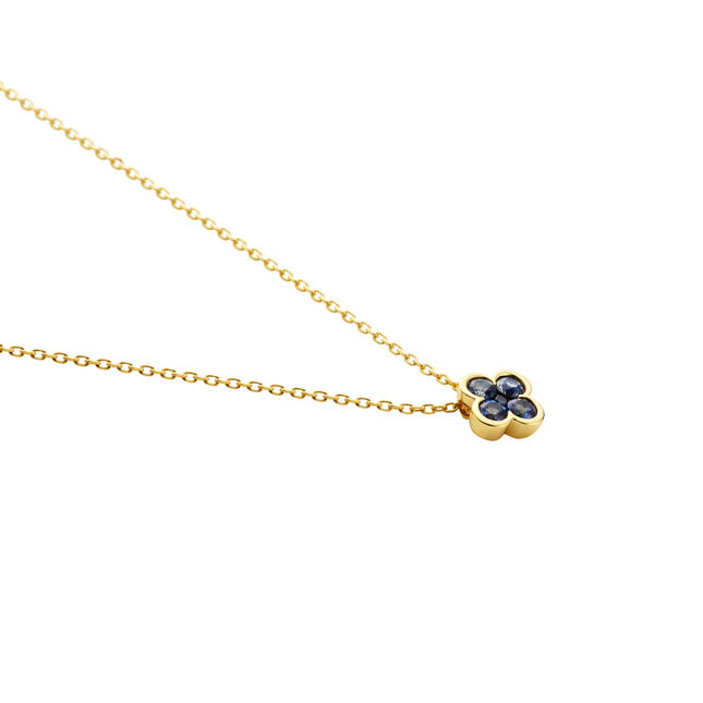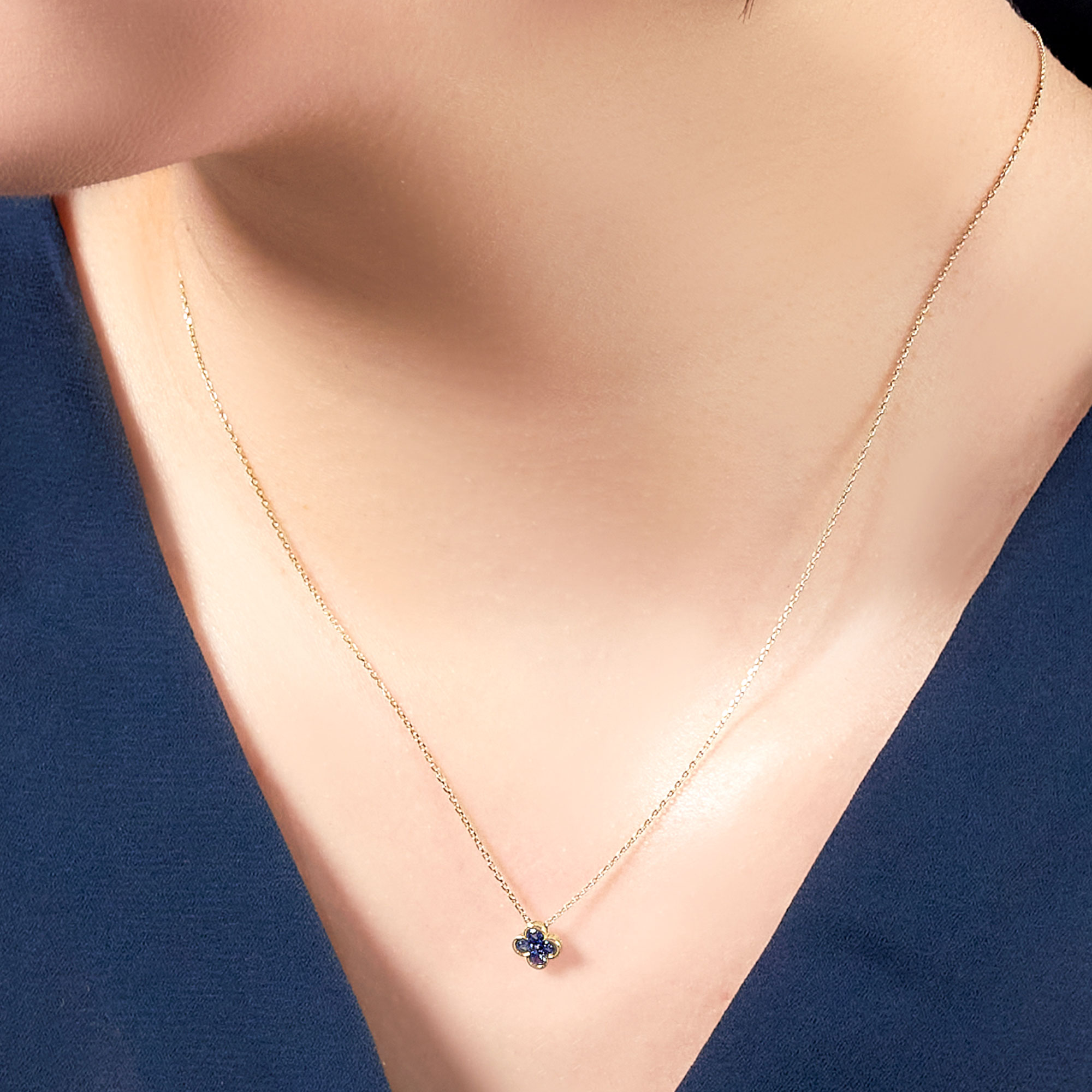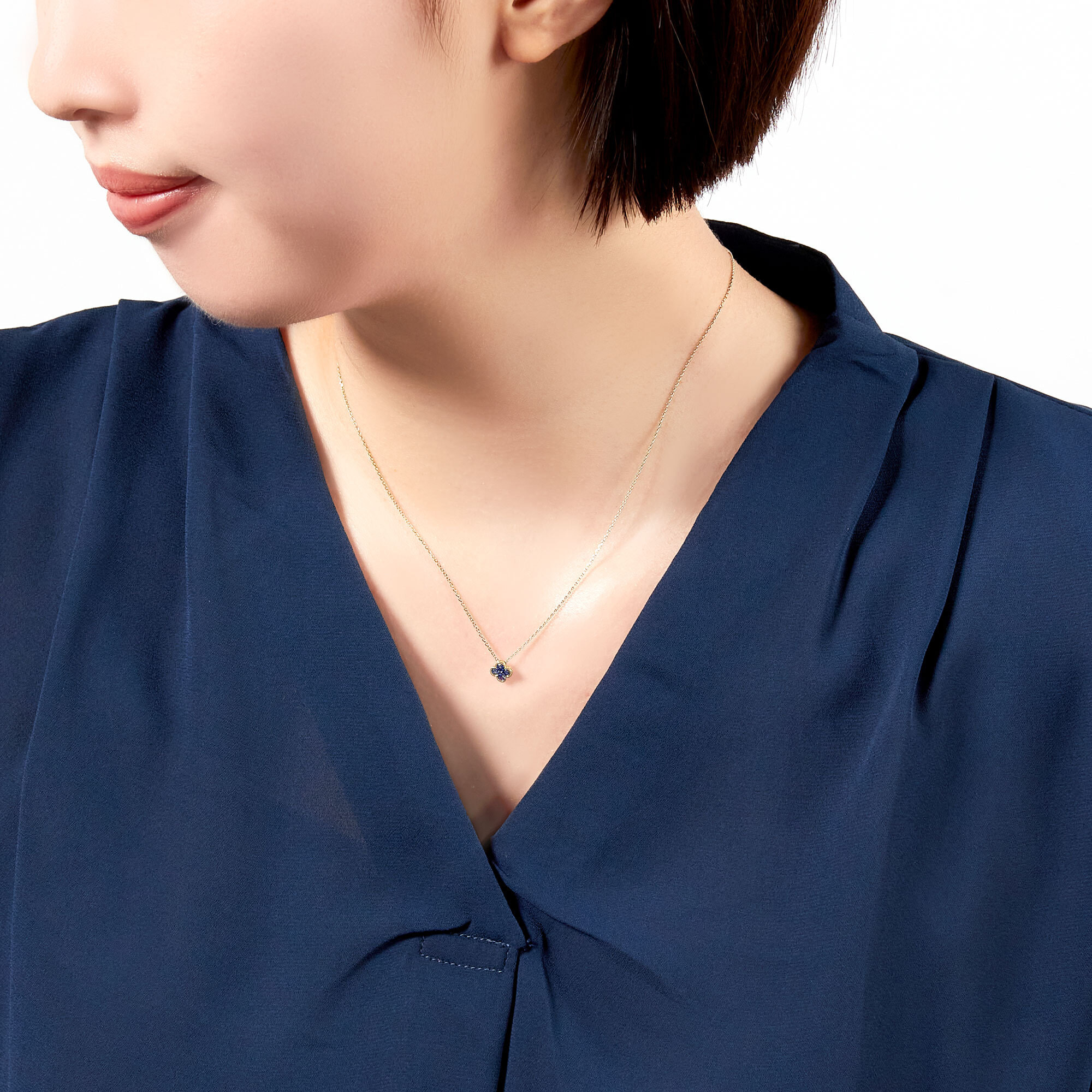 艶やかなイエローゴールドと鮮かなブルーのコントラストが胸元に華やかさをプラスします。