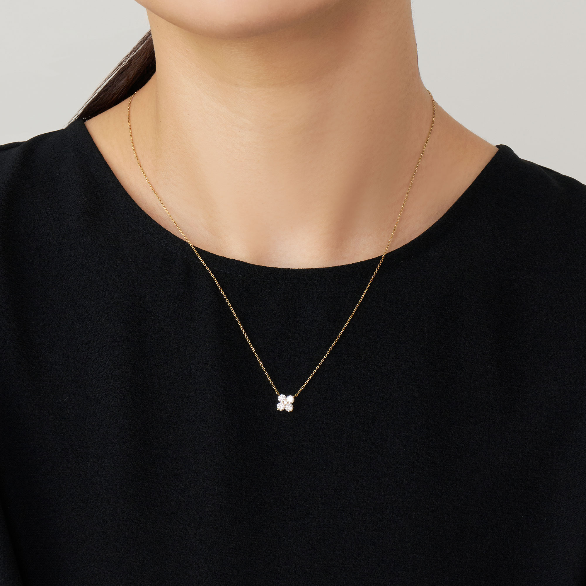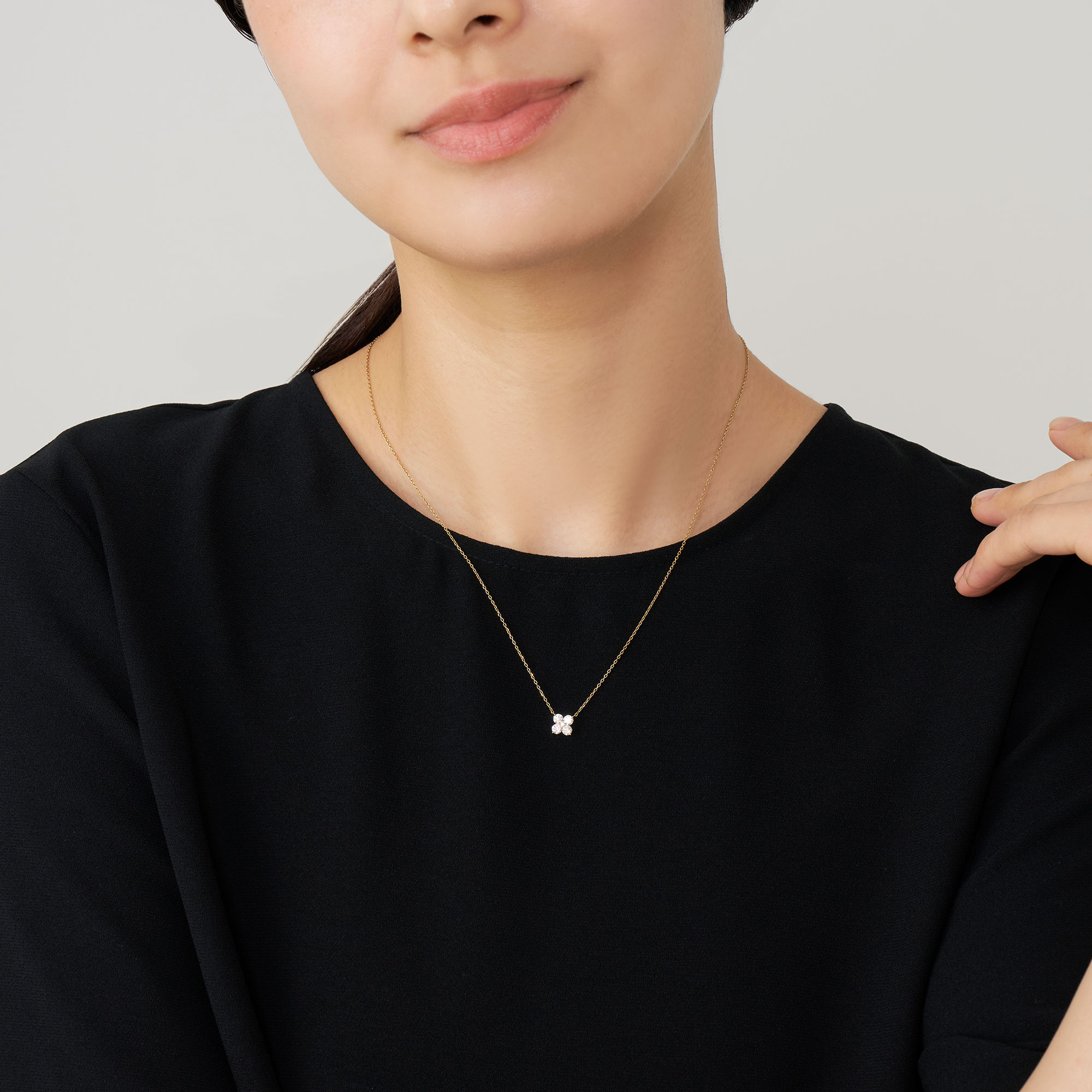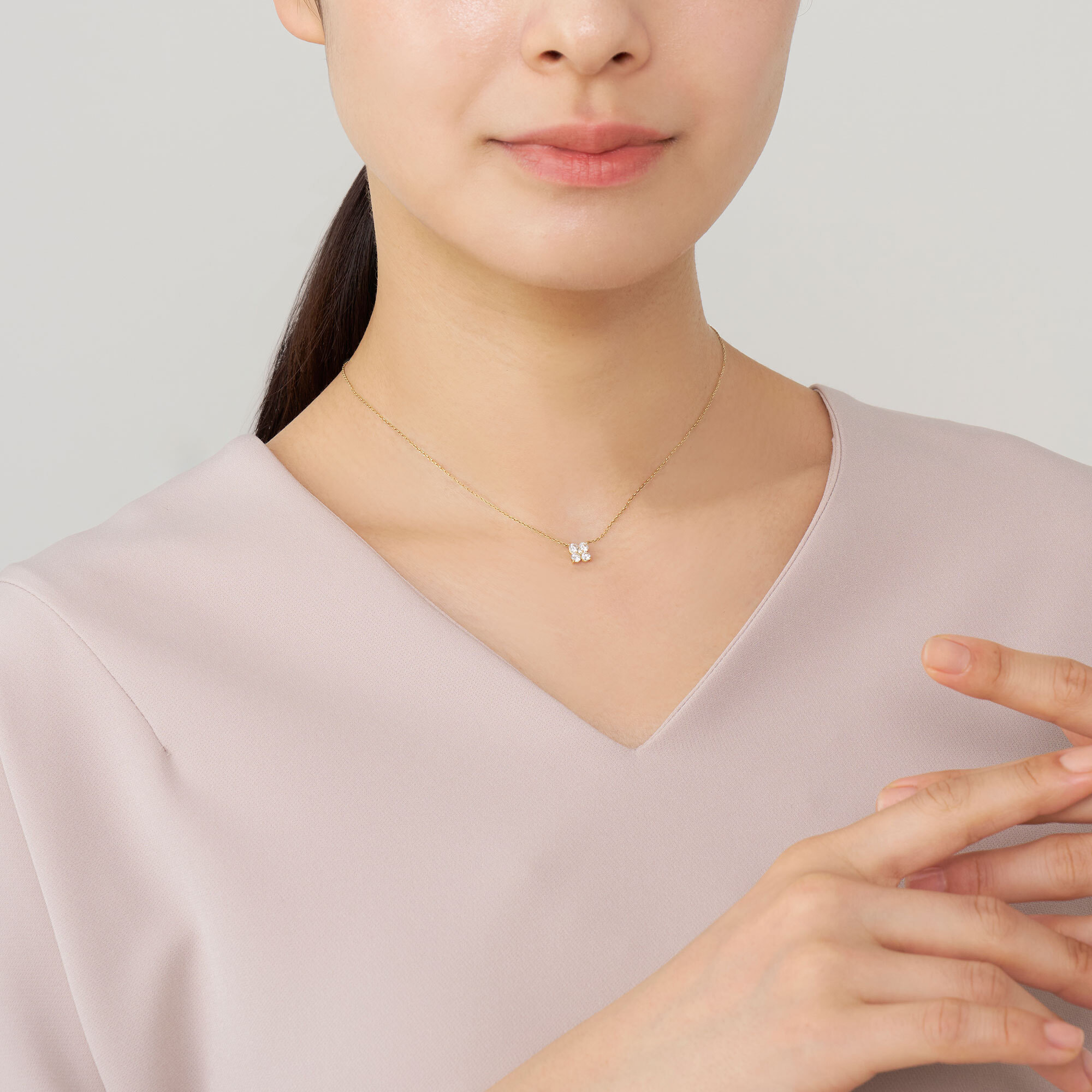 モチーフのフォルムを引き立てる両吊りのアズキチェーンで、ダイヤモンドの輝きがぐっと際立つ、満足度の高いネックレス。