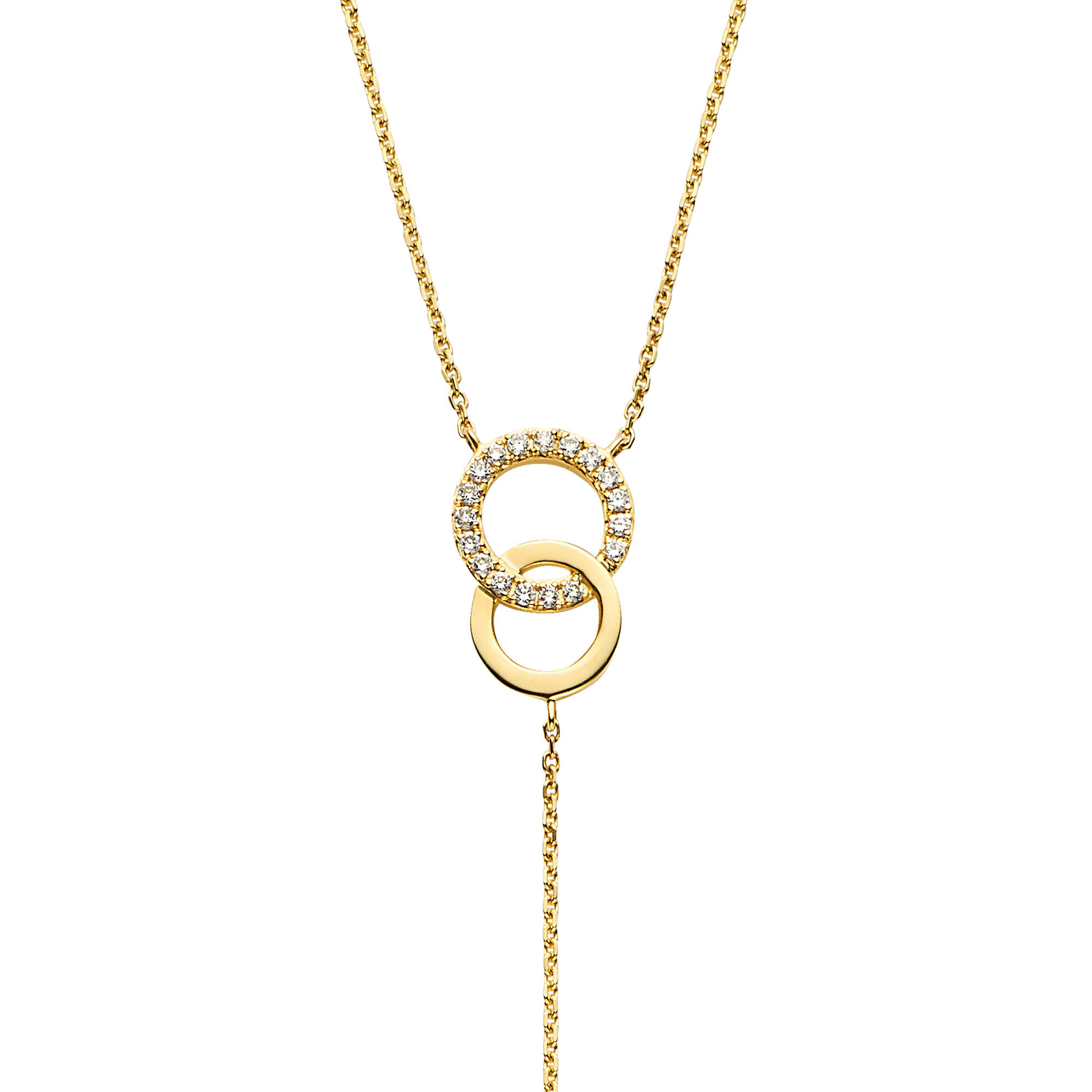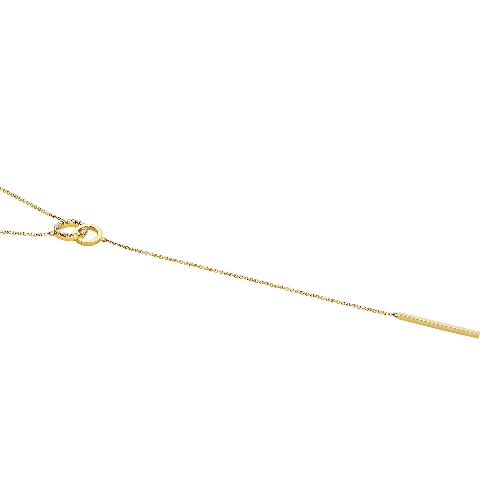 ダイヤモンドのきらめきと、艶めくイエローゴールドのコントラストが美しい、大きさの違う2つのサークルが縦につながった印象的なモチーフ。