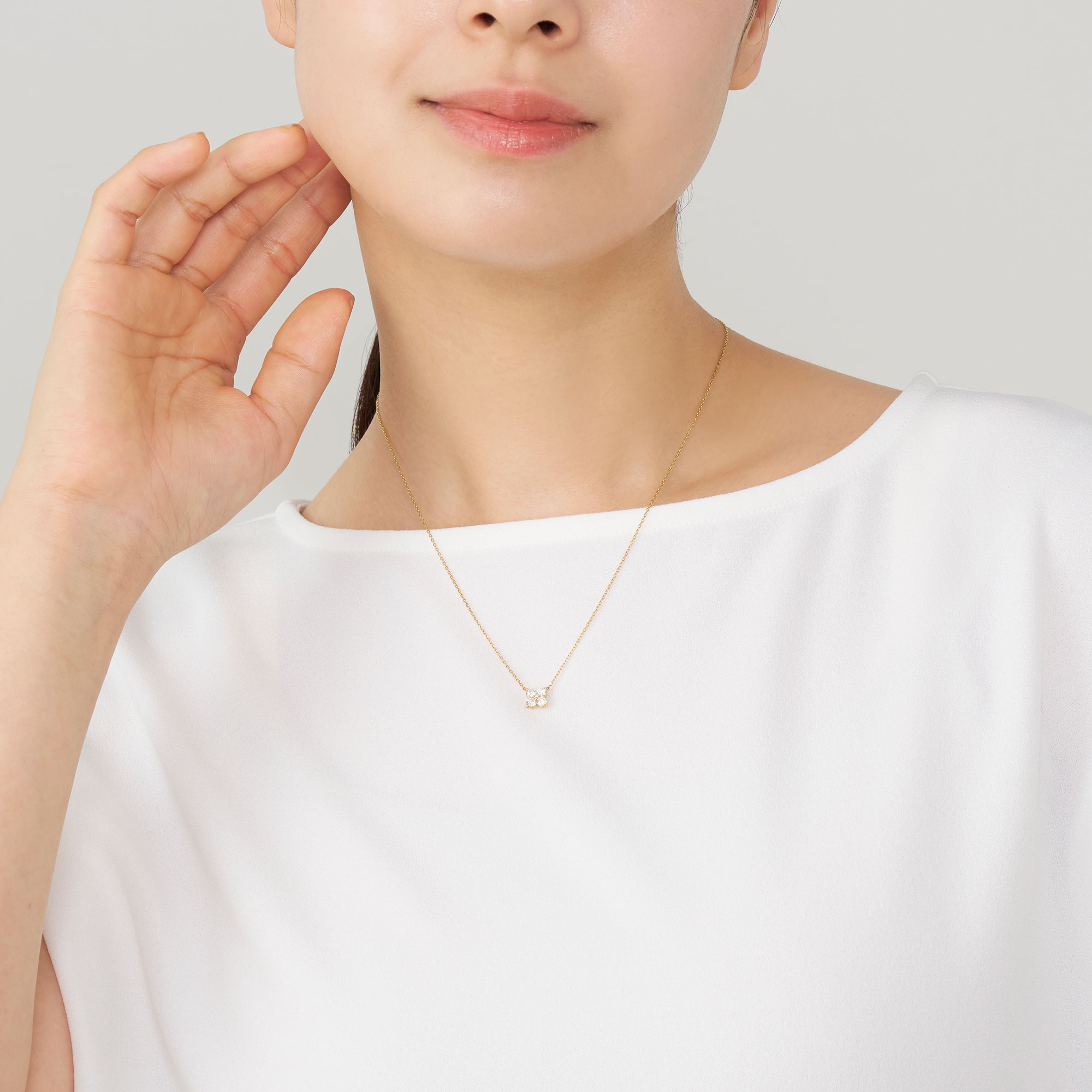 モチーフのフォルムを引き立てる両吊りのアズキチェーンで、ダイヤモンドの輝きがぐっと際立つ、満足度の高いネックレスです。