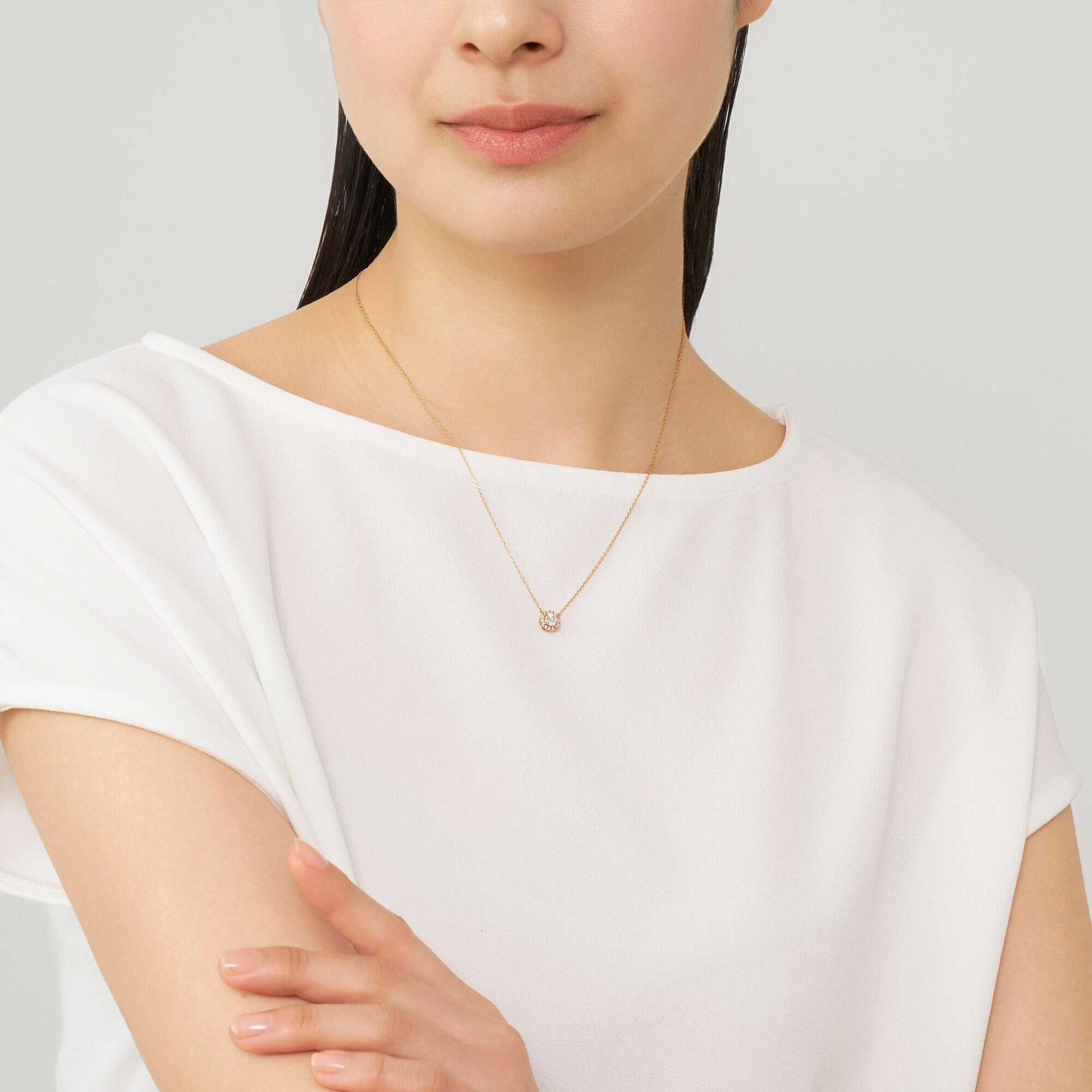 贅沢なダイヤモンドのきらめきが互いを引き立て合い、胸元にみずみずしく優美な輝きが広がります。