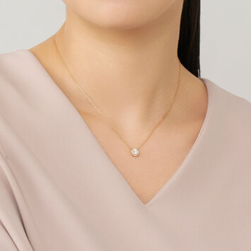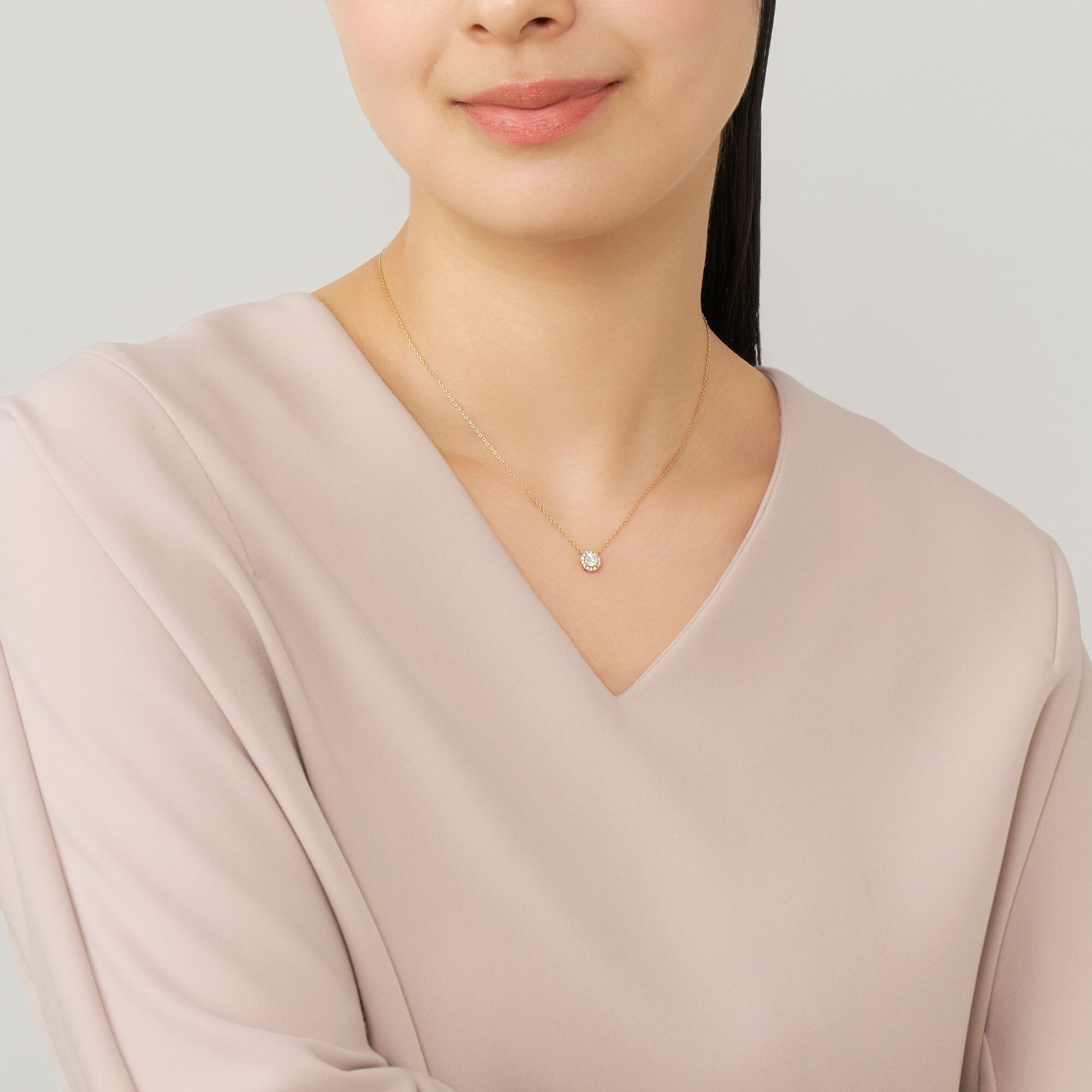 大粒の最高級Dカラー・エクセレントカットのダイヤモンドをメレダイヤモンドで縁取った、エレガントな輝きが魅力のネックレス。