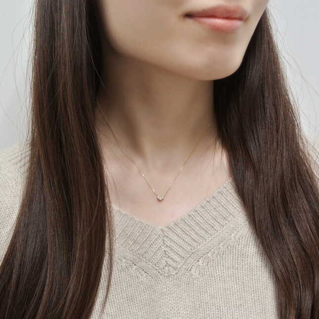 繊細なきらめきのチェーンへとつながる、左右に広いプロポーションは愛らしさを滲ませながらも、モチーフの先端に向かってすっきりと描いたラインで甘さを引き締めています。
