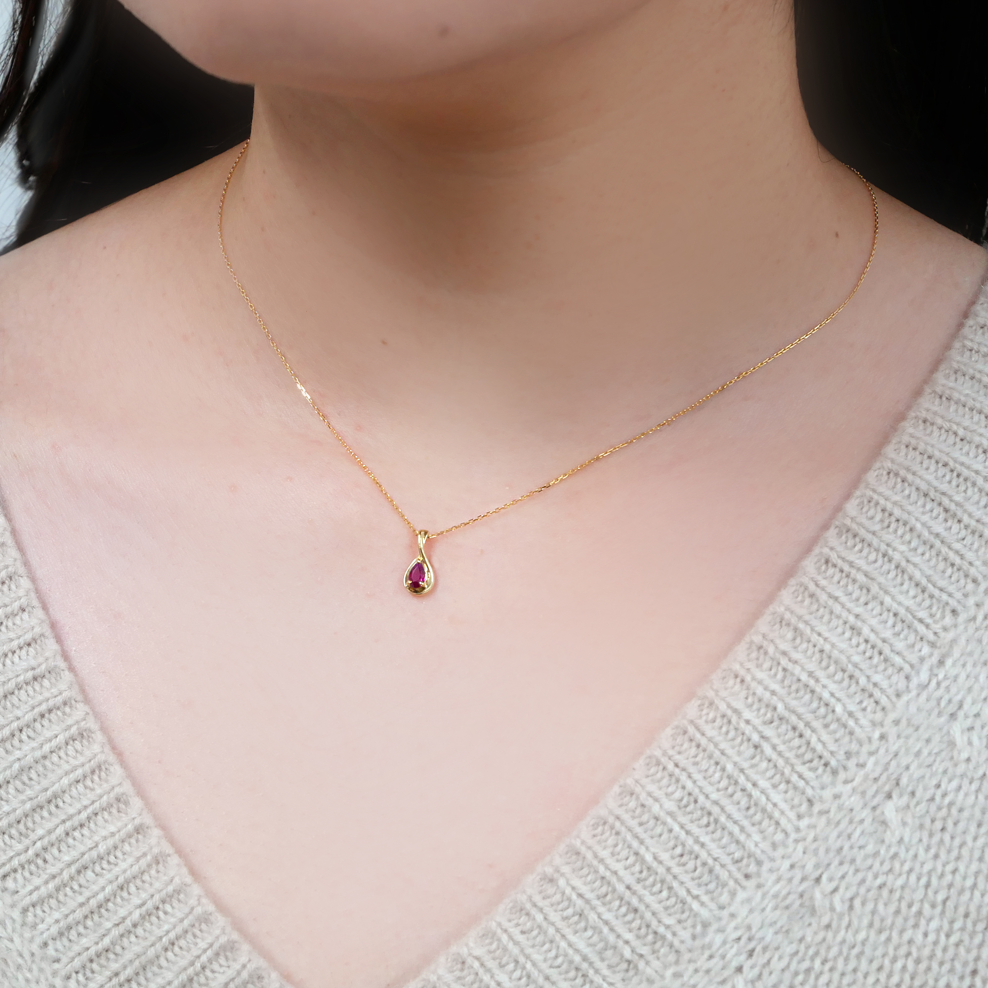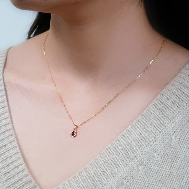 ペアシェイプのルビーをイエローゴールドでぐるっと囲ったネックレス。