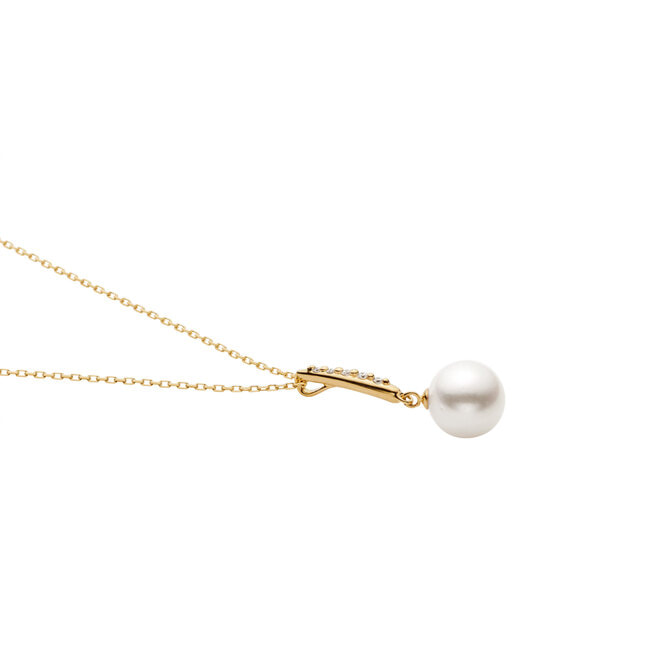 暖かみのあるゴールドと丸く柔らかい印象のアコヤパール、輝くダイヤモンドのラインが繋がり、対比する質感が引き立て合います。