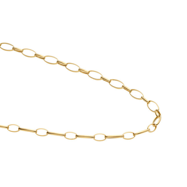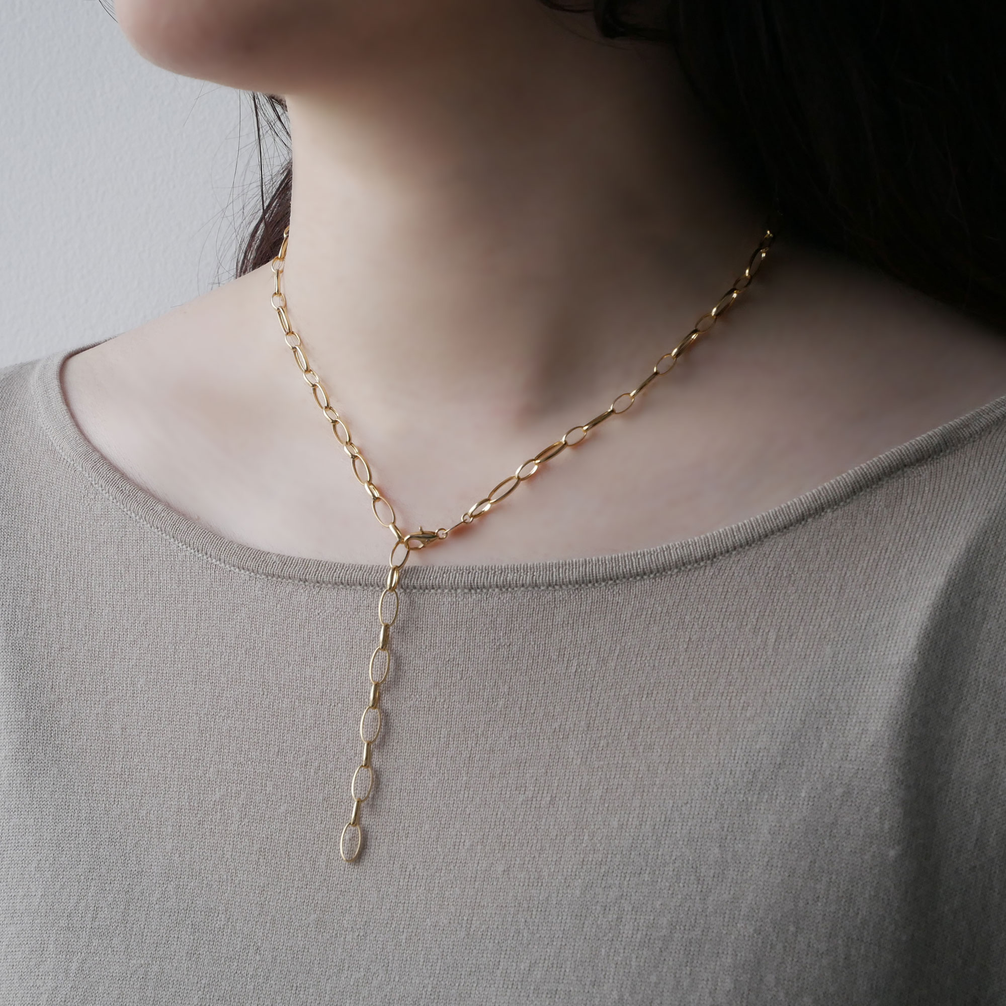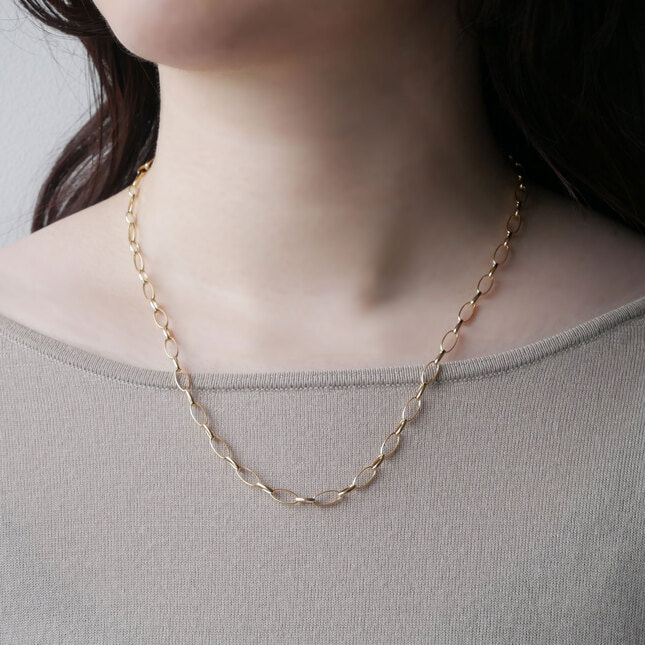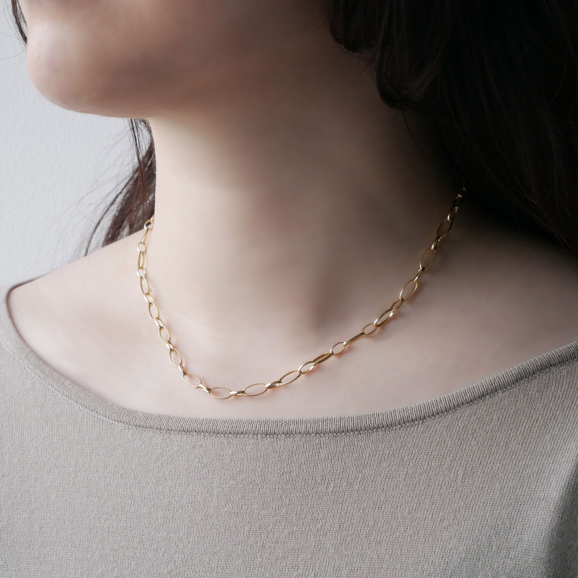 大小のオーバル型パーツを組み合わせたチェーンネックレス。