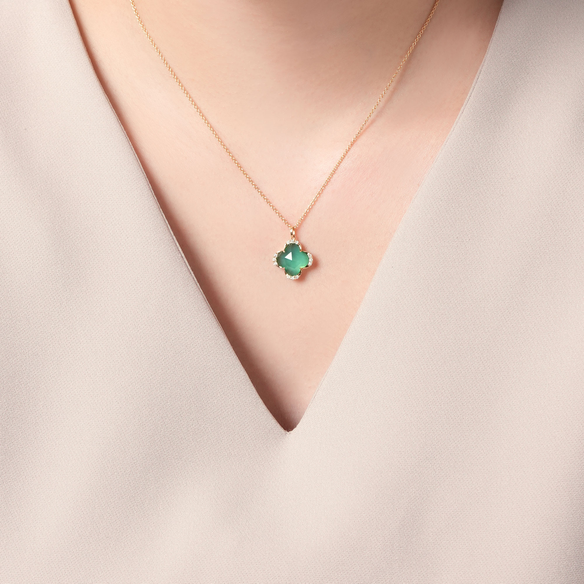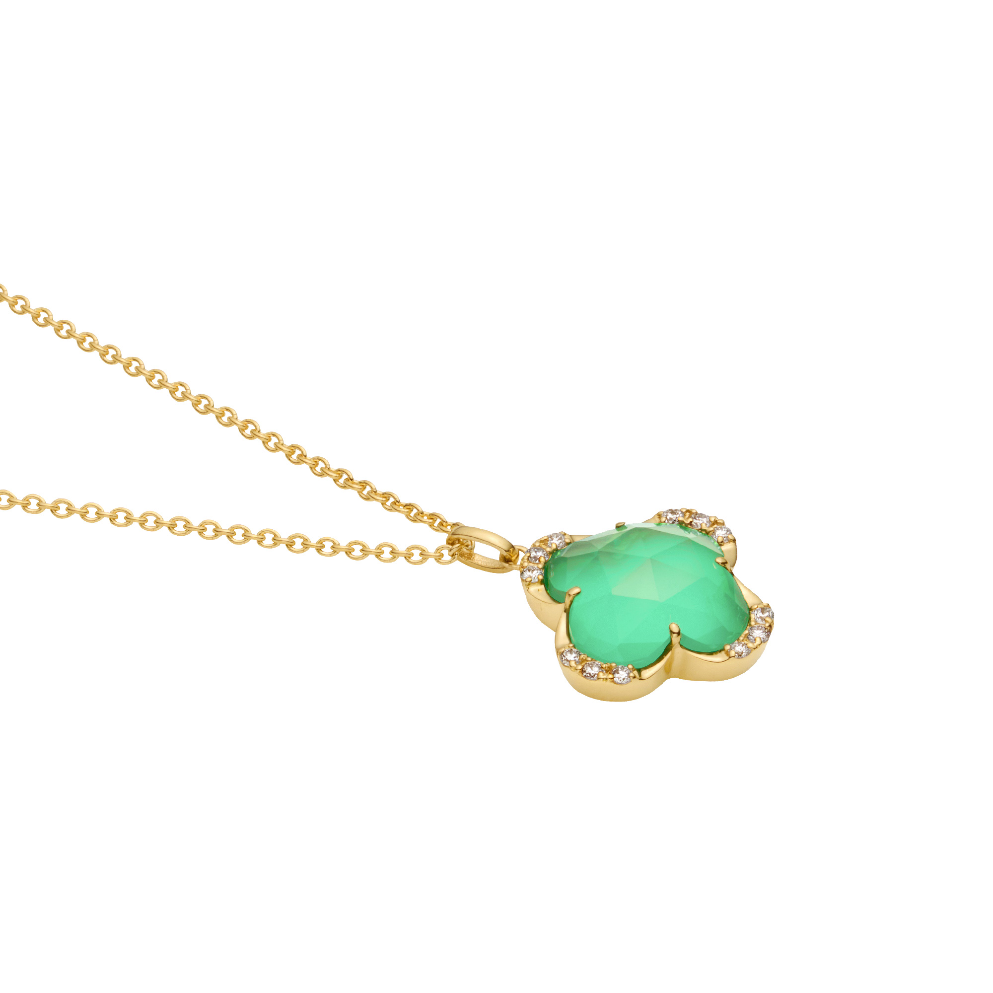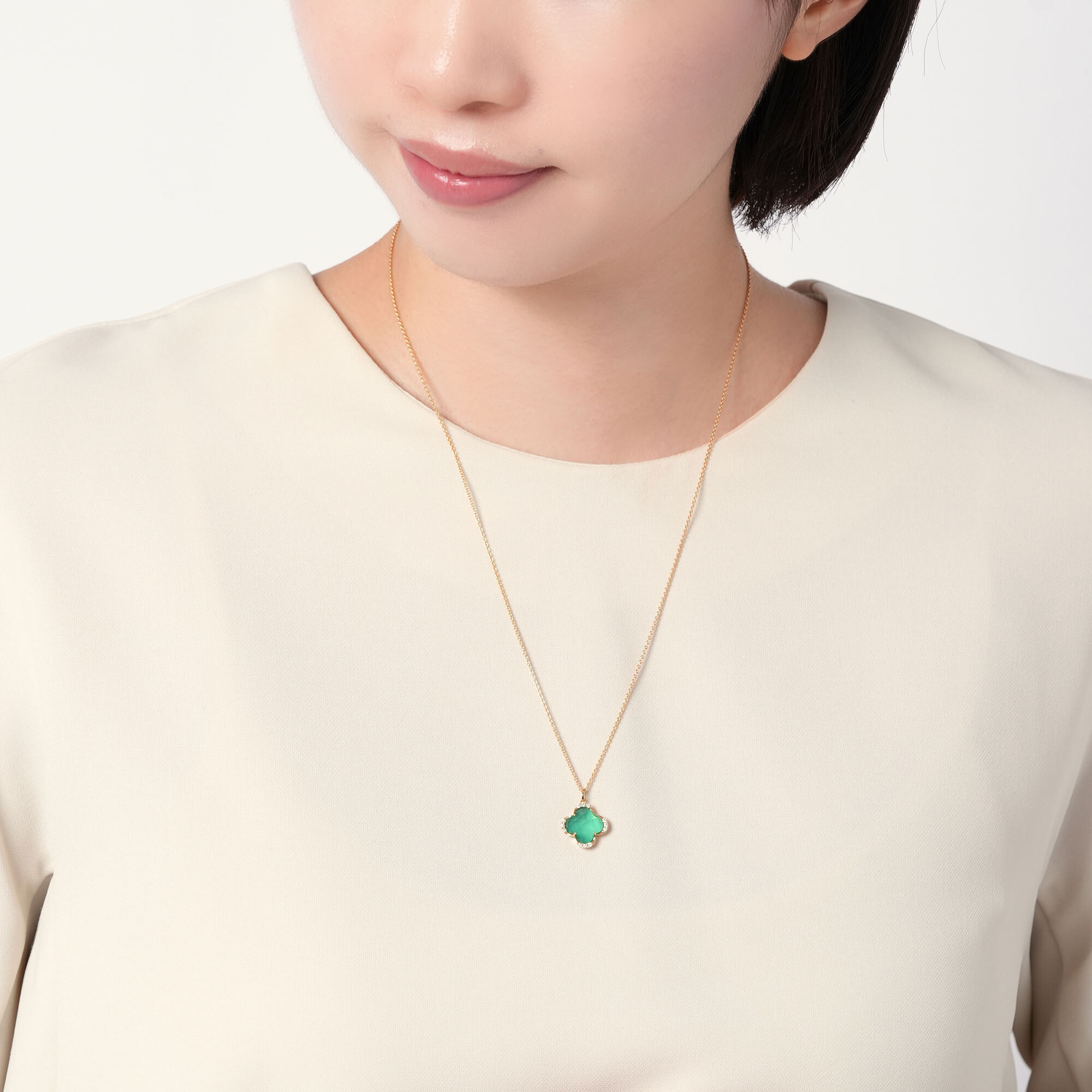 グリーンカルセドニーとクォーツを組み合わせた色鮮やかなカラーリングで、クローバーを可愛らしく描いたネックレス。