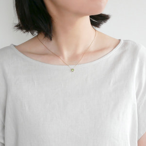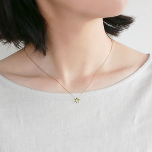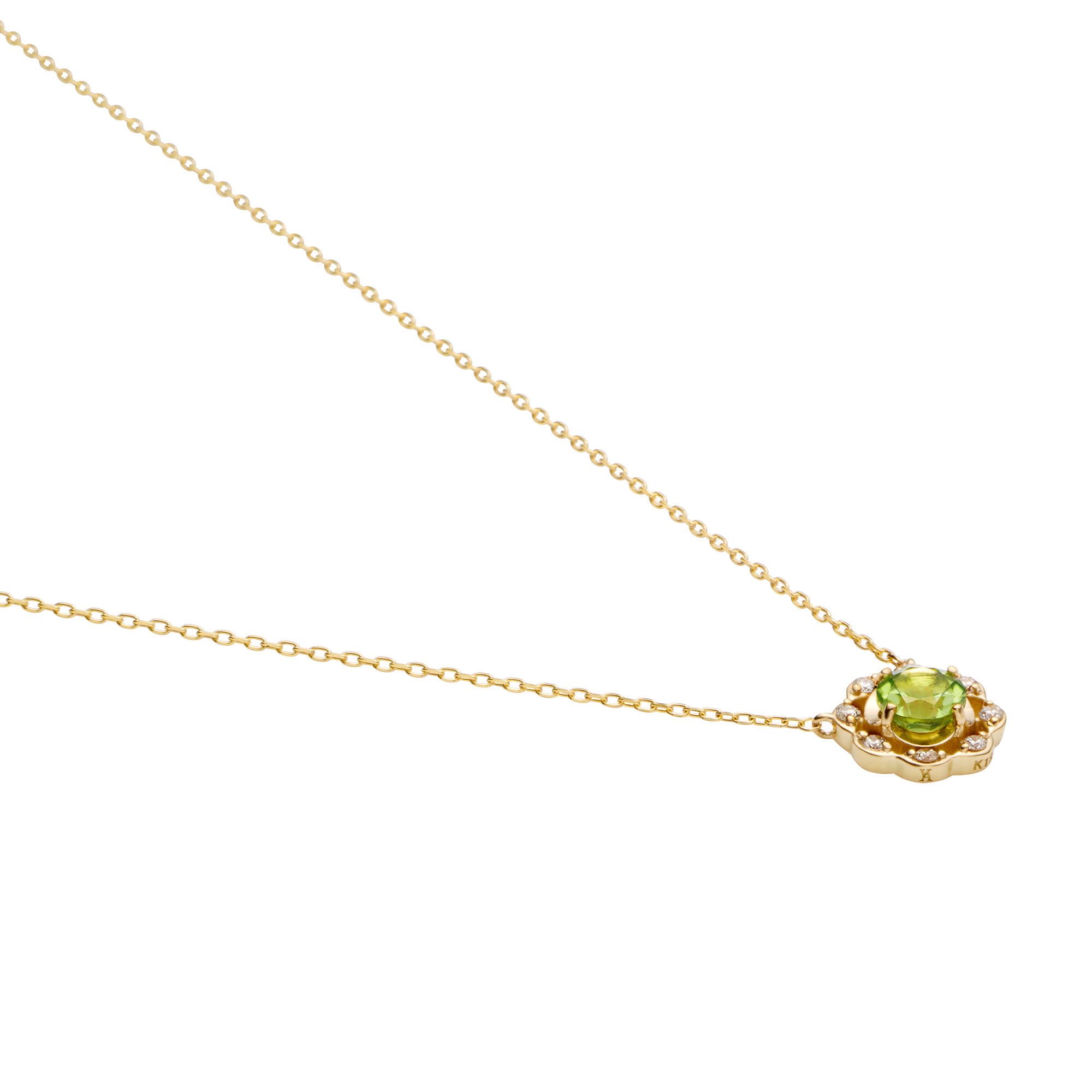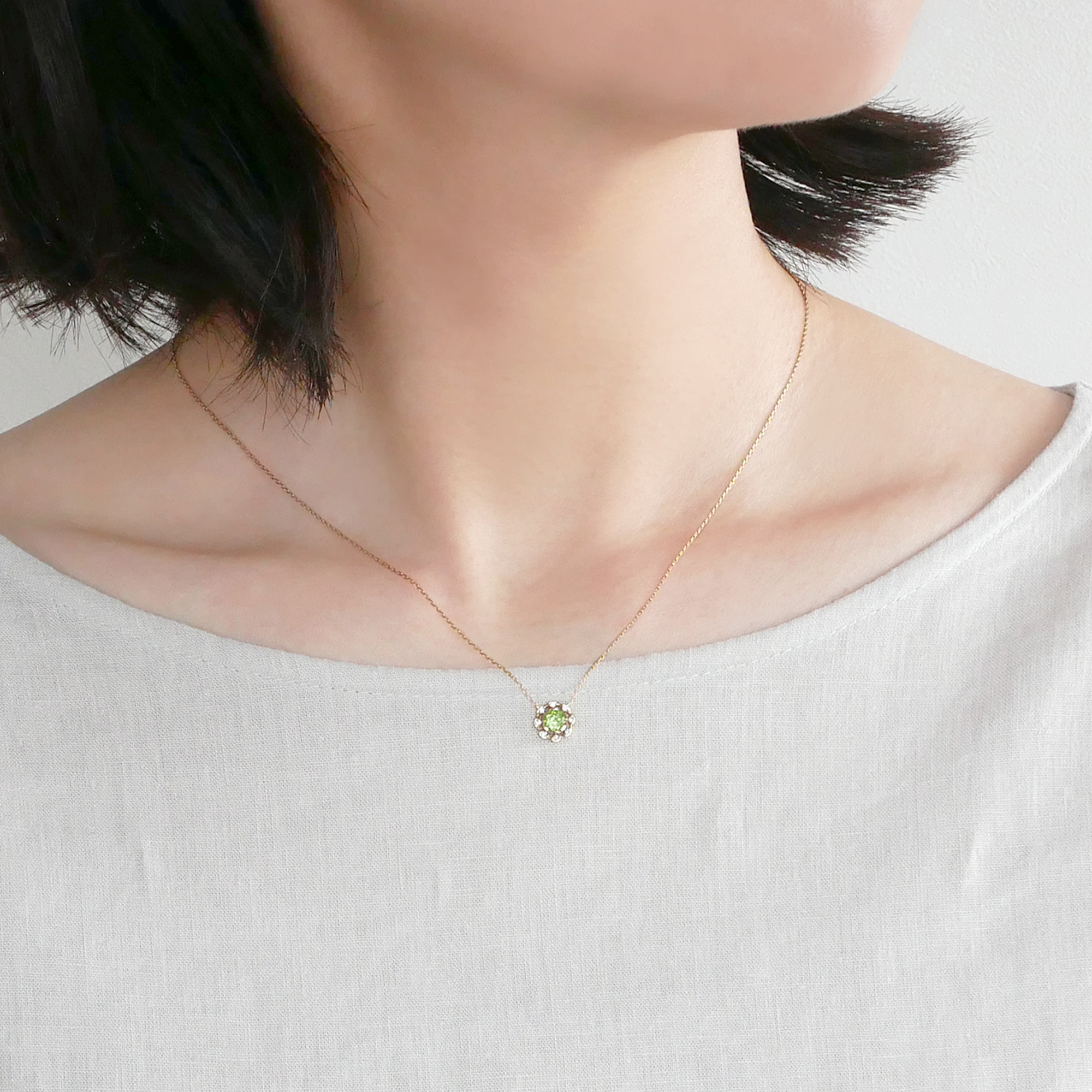 明るいグリーンがきれいなペリドットをきらめくダイヤモンドで取り巻いたネックレス。