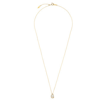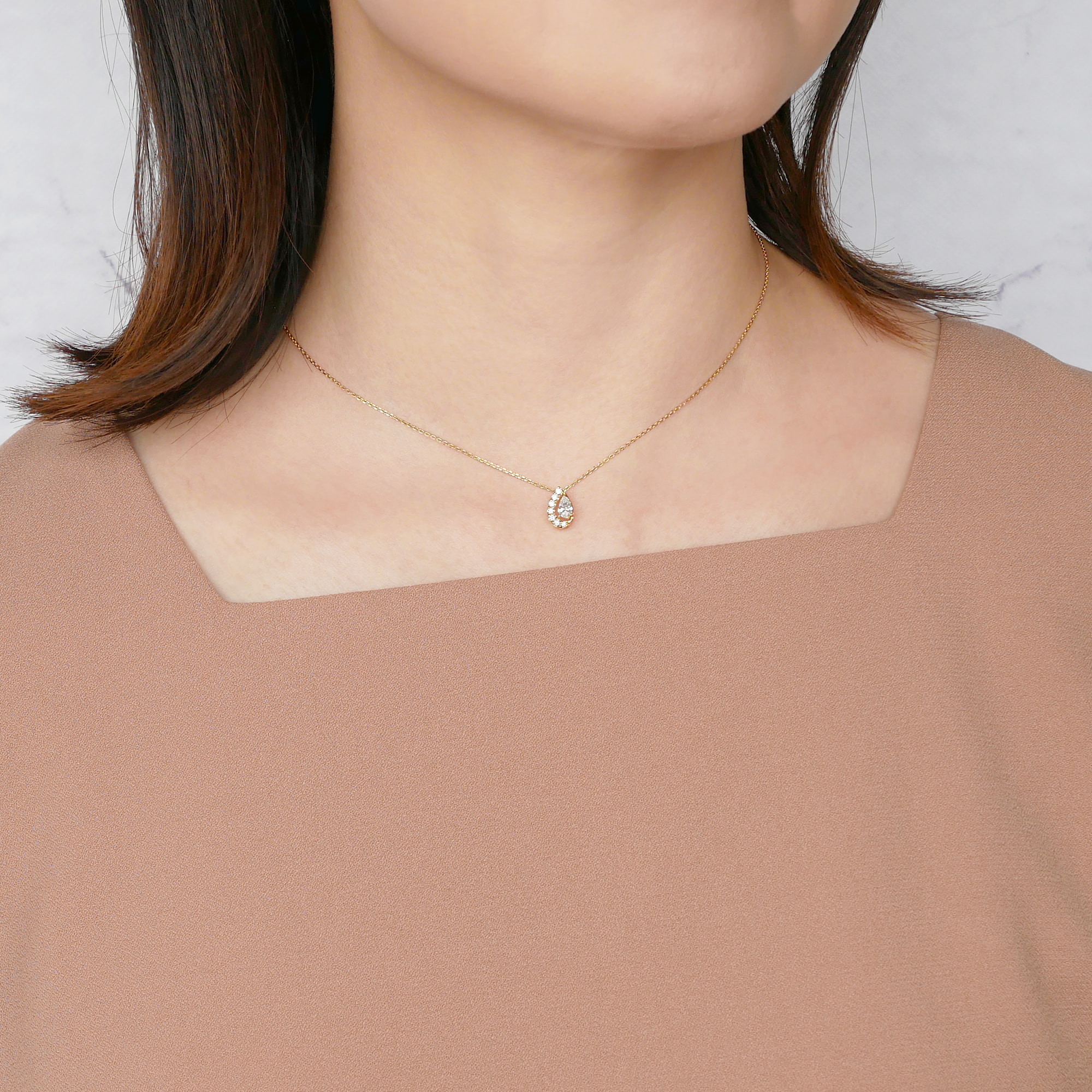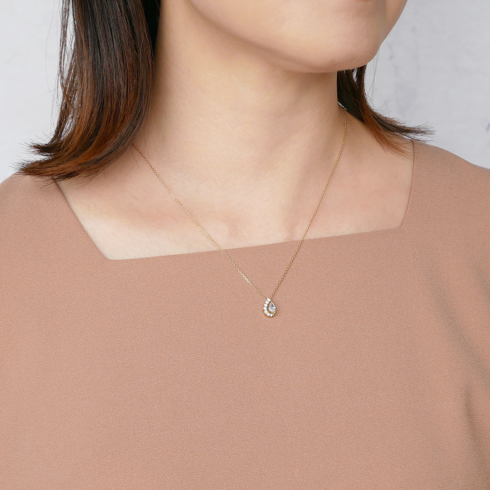 透明感のある煌めきを放つペアシェイプカットダイヤモンドを、繊細なメレダイヤモンドで包み込んだ、潤い溢れる輝きが魅力のネックレス。