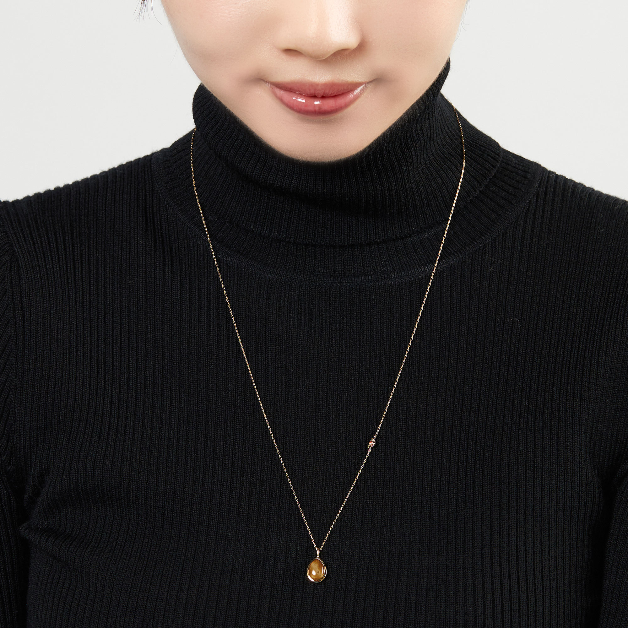 イエローからブラウンの光沢が美しいタイガーアイにクォーツを重ねたダブレットストーンが胸元で輝きます。
