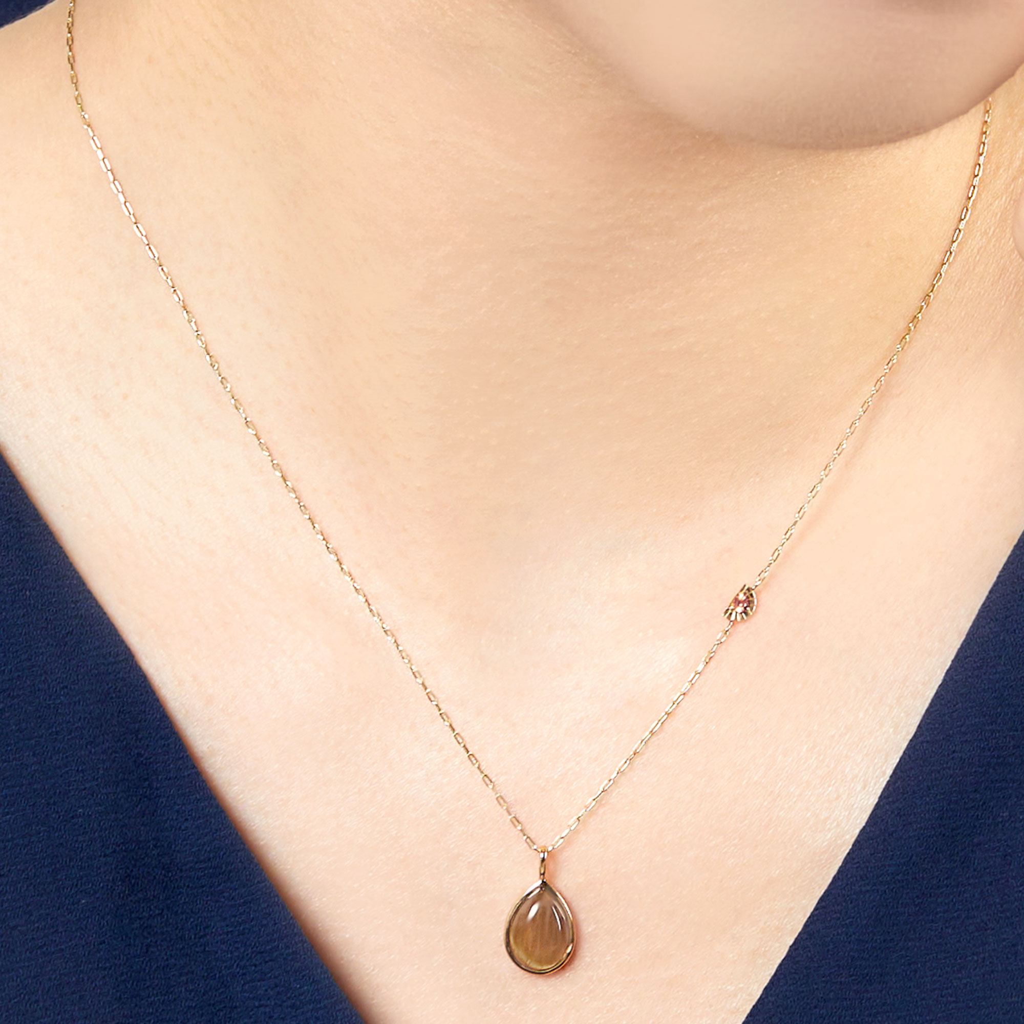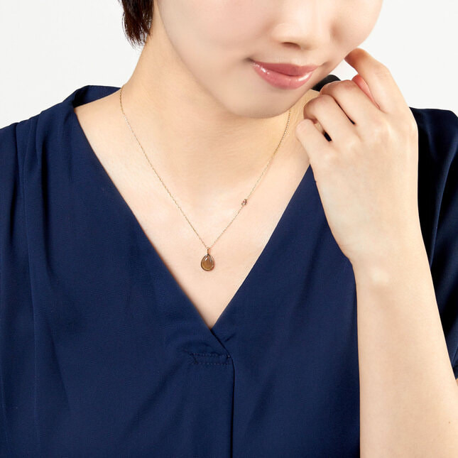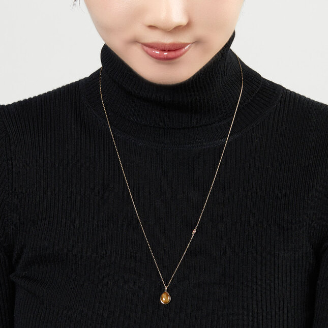 ふっくらとした雫型のフォルムと落ち着いたカラーがリラックスしたムードを醸し出し、ゴールドのチェーンが繊細なきらめきをプラス。