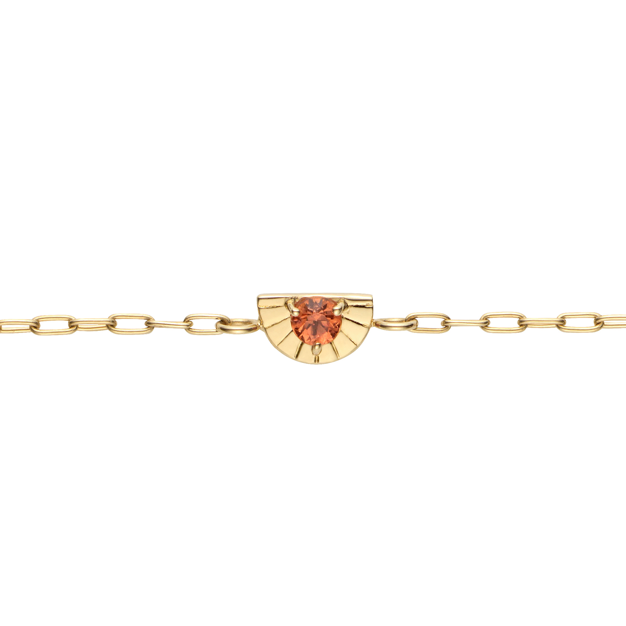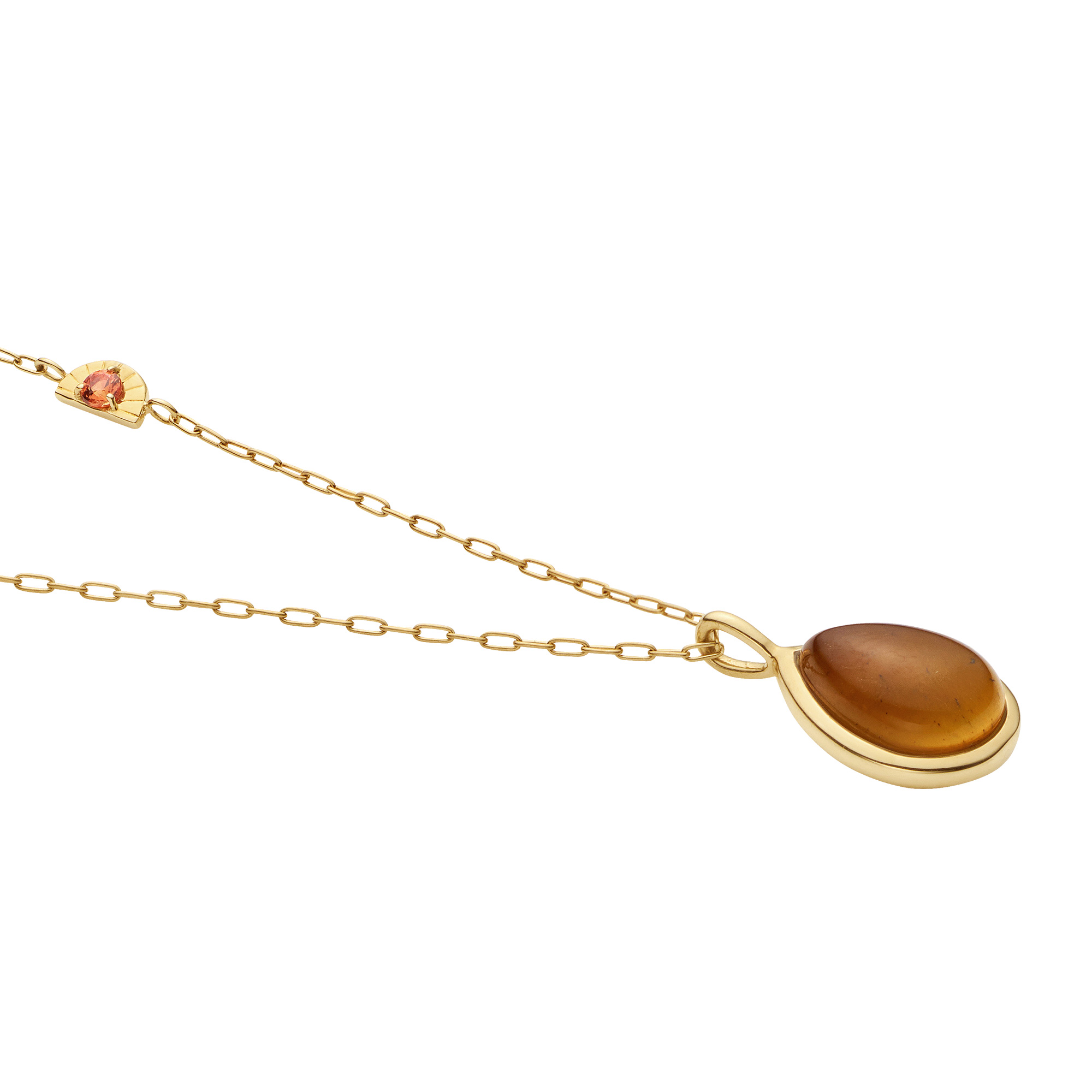 チェーンにあしらった太陽のモチーフの中で、ビビットに輝くオレンジサファイアもコーディネートのアクセントに。
