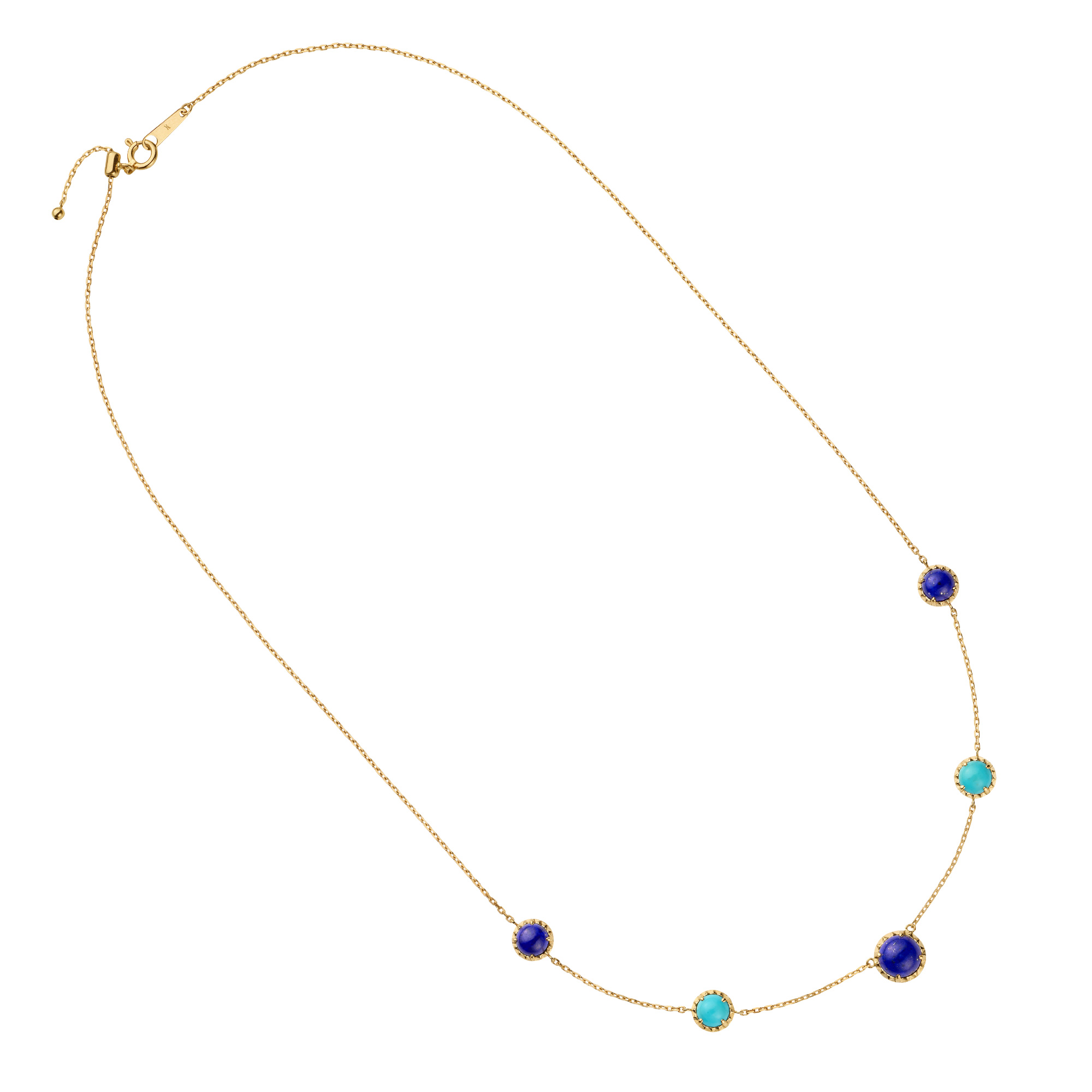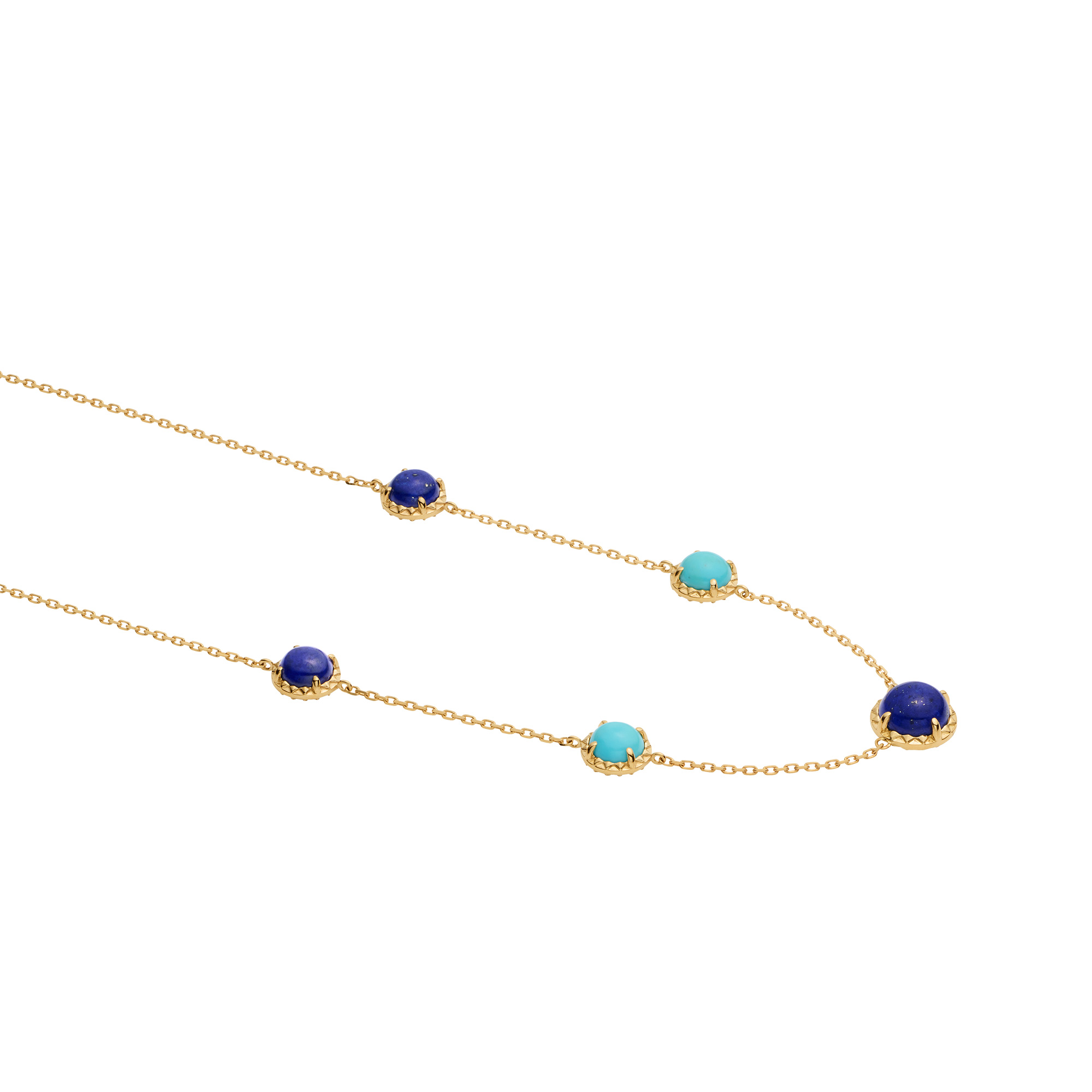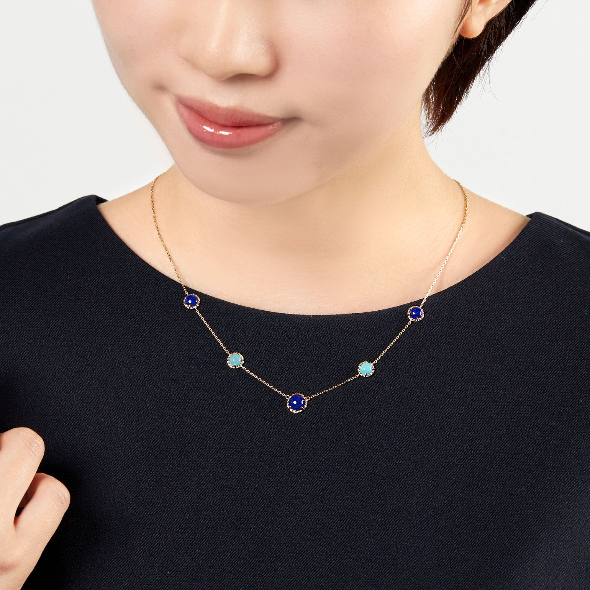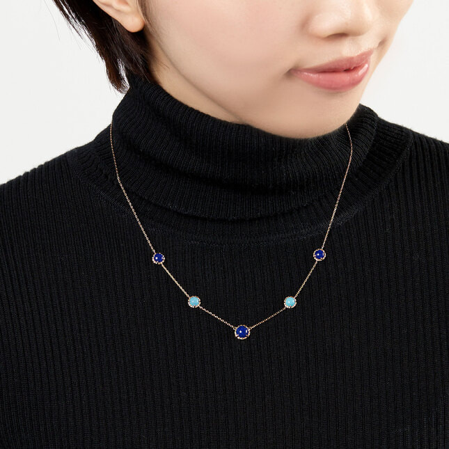 ふっくらと丸く艶やかに磨かれたラピスラズリとターコイズ、それぞれの持つ魅力的なブルーの色合いとコントラストが、空や海、幻想的な風景を思わせ、日常から離れてさまざまな想いを巡らせます。