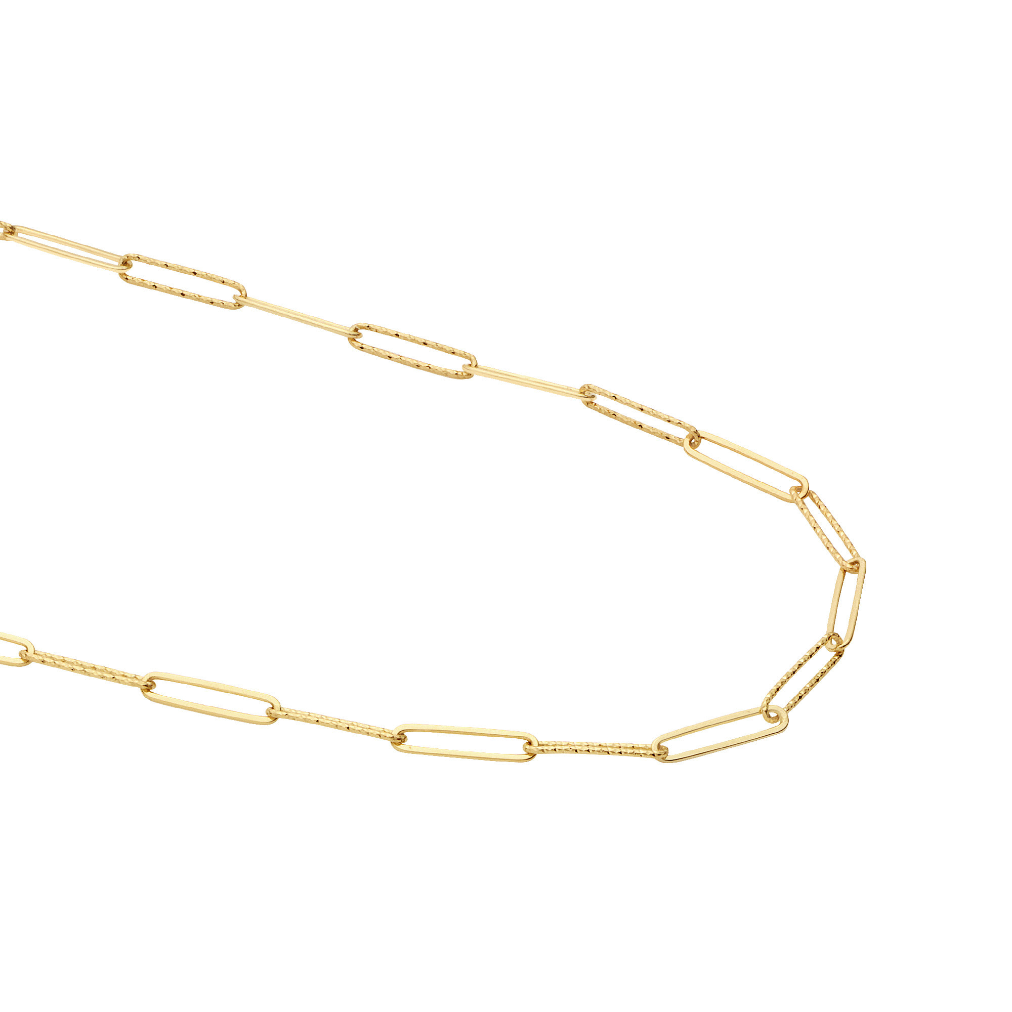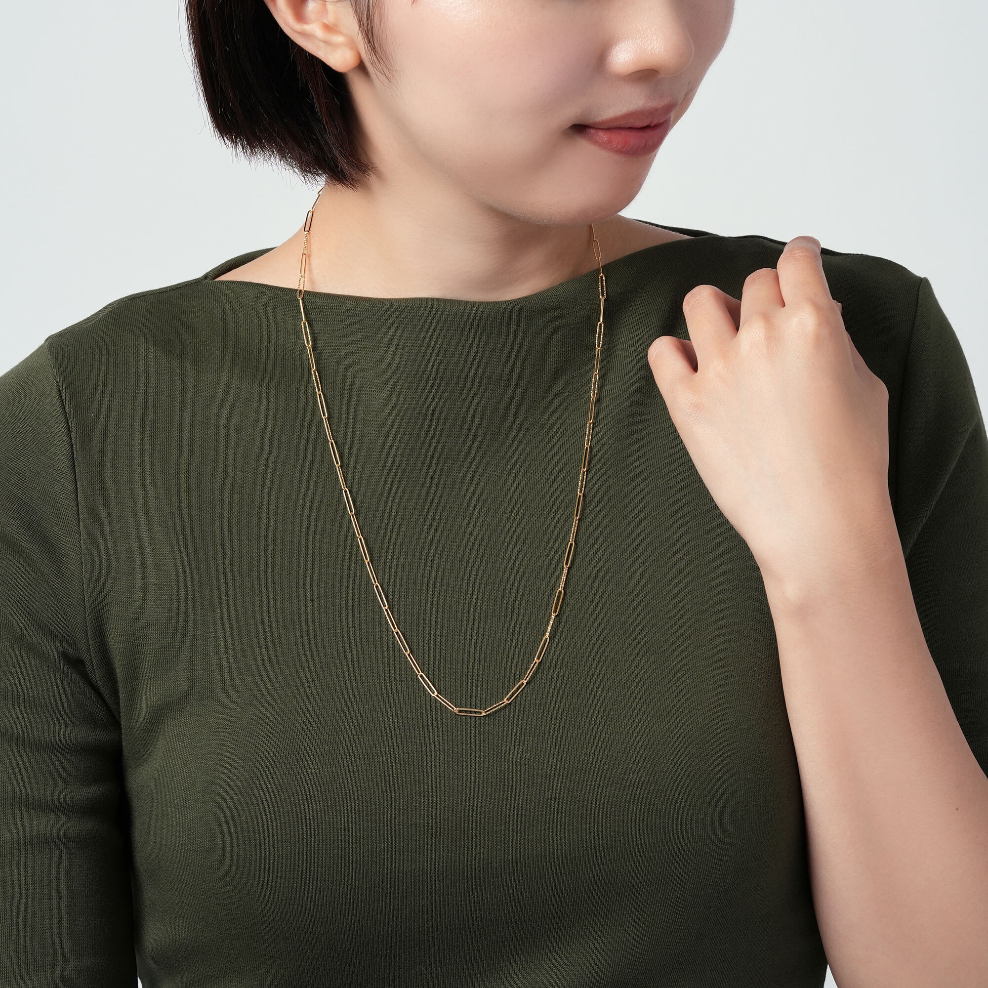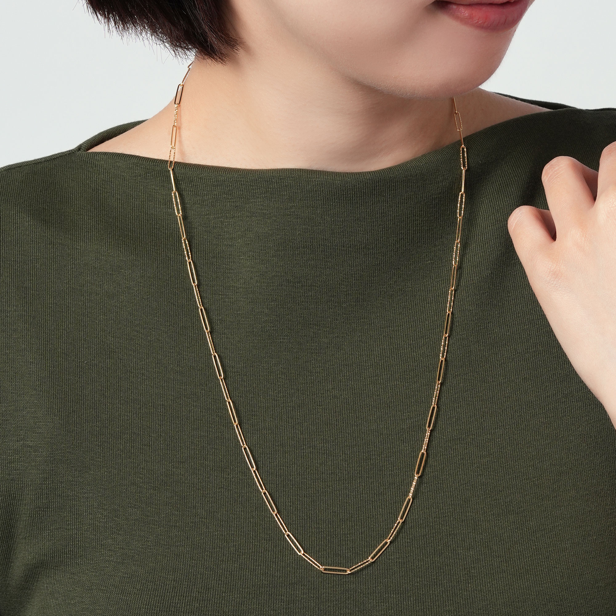チェーンは艶やかに磨かれたコマときらめくカットが施されたコマが交互に組まれ、そのコントラストのある輝きがコーディネートにモダンな雰囲気をプラスします。