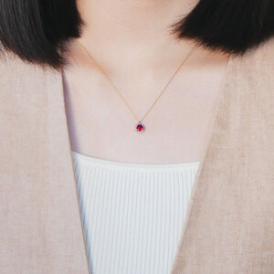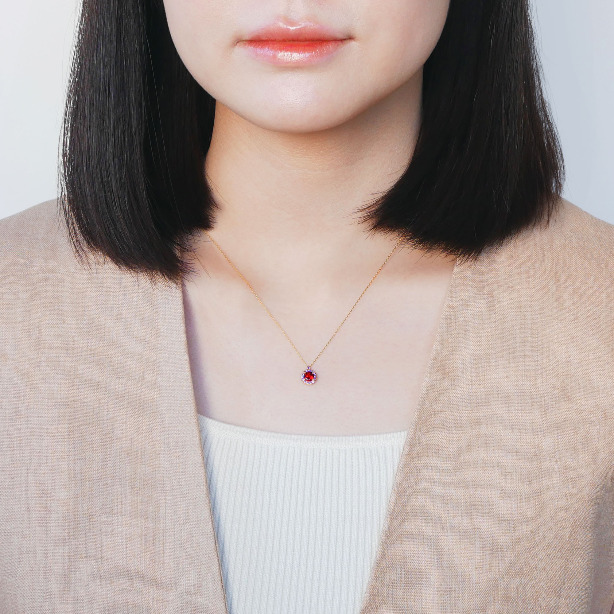 深い赤色のガーネットをアメシストで取り巻いた、インパクトある鮮やかな配色が印象的なネックレス。