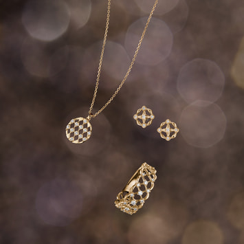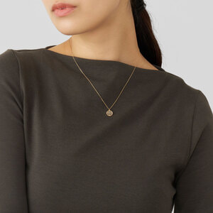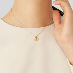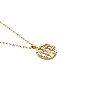 メダル状のトップの中に小さなひし形が並ぶ、グラフィカルな仕立てが魅力的なネックレス。