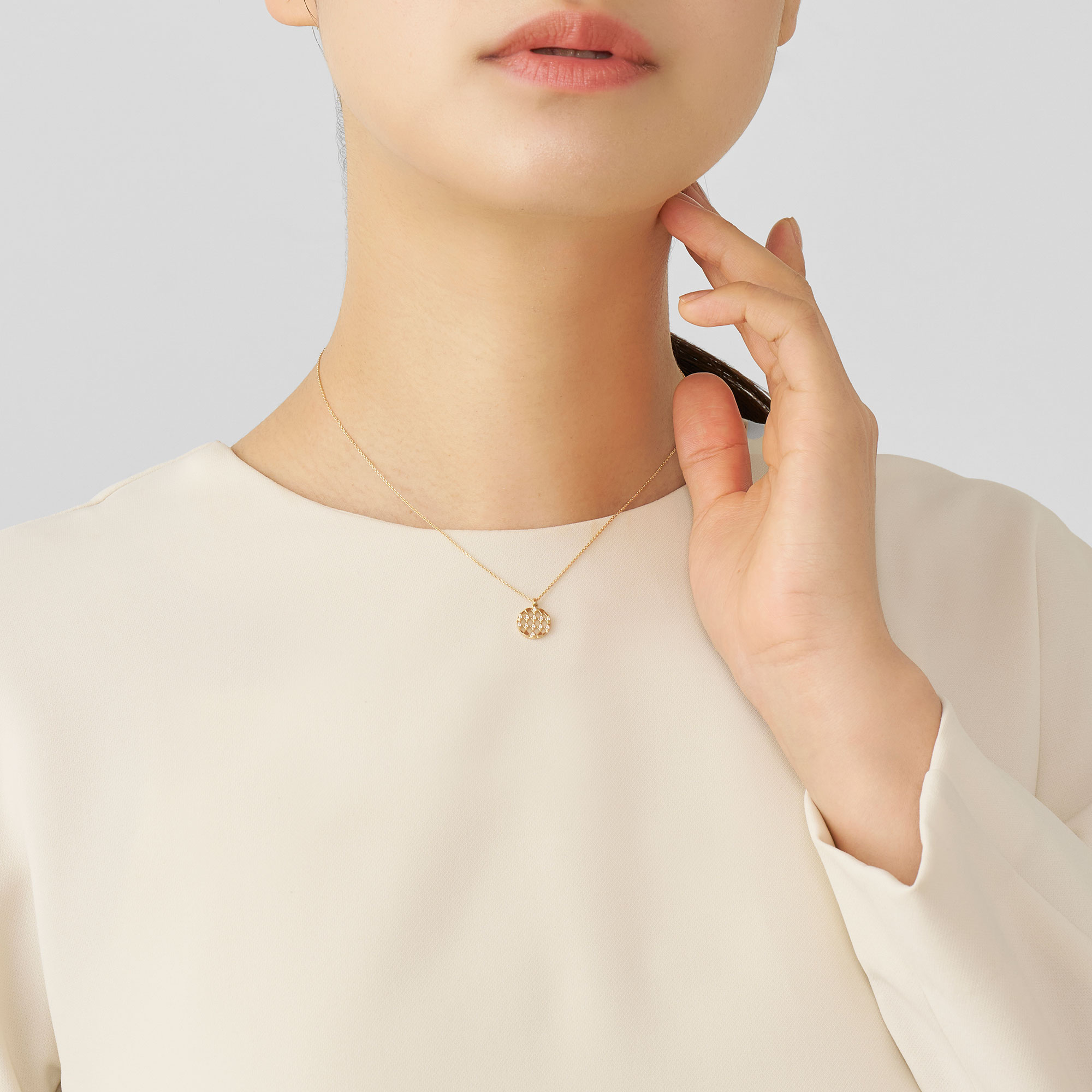 顔まわりを明るく見せてくれるダイヤモンドのきらめきもポイントに。温かみのあるイエローゴールドのカラーが華やかさももたらします。