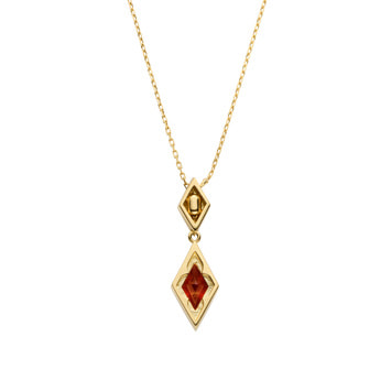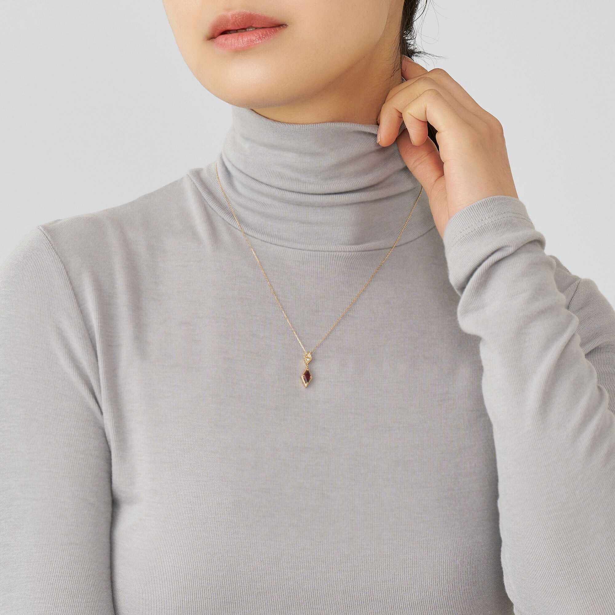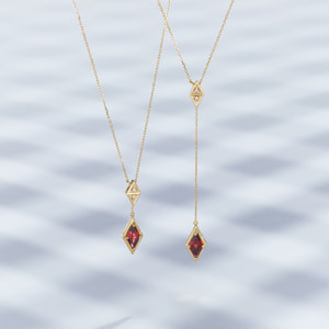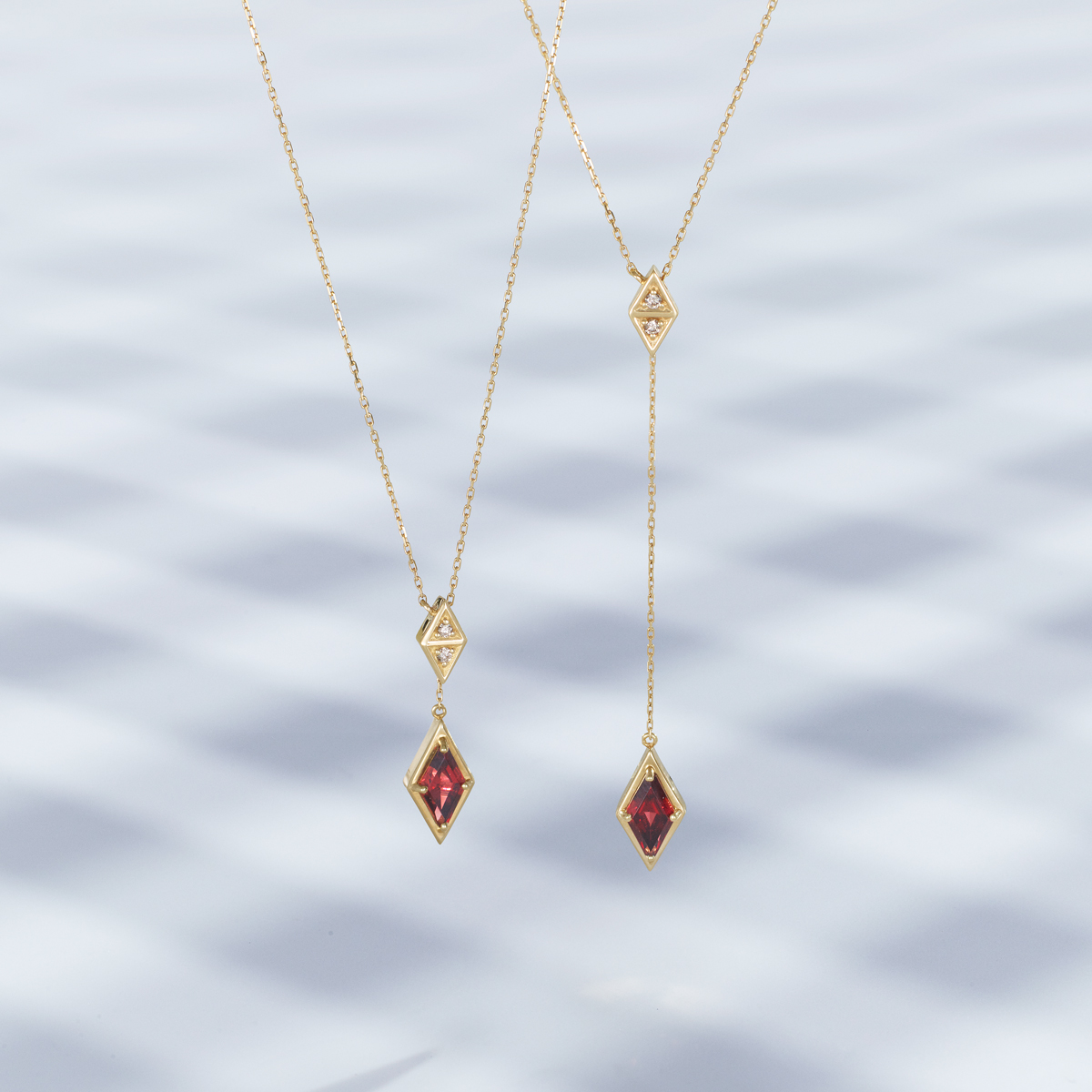 チェーンを長めに下げれば、縦のラインを強調しスタイリングを凛と引き締め、菱形を合わせるように着けるとシルエットを強調し存在感を放ちます。