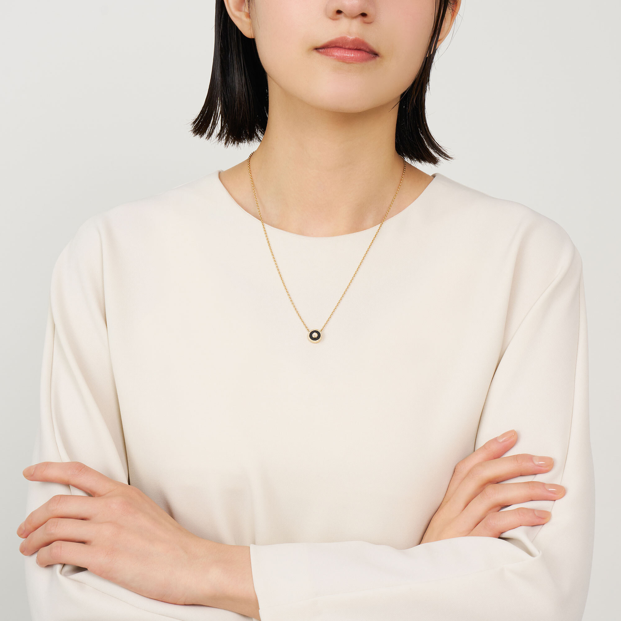 白と黒、コントラストを効かせたネックレスは、胸元にモダンな輝きを放ちます。