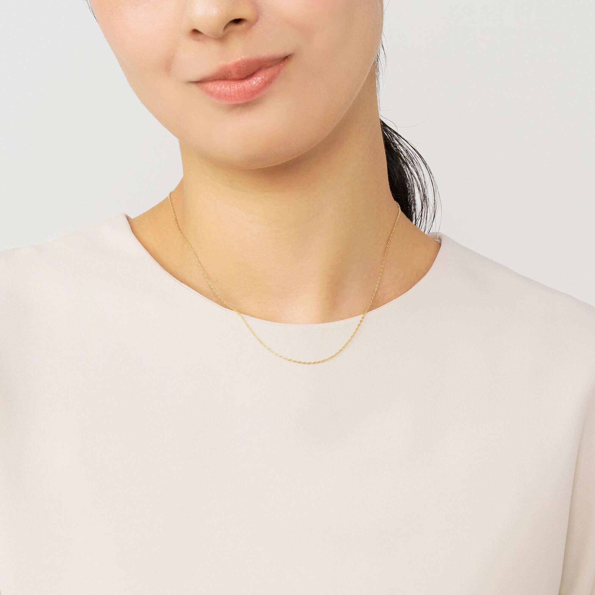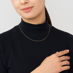 程よい幅感のアズキチェーンはそのまま着けても存在感があり、軽やかさとエレガントなきらめきを合わせ持ちます。