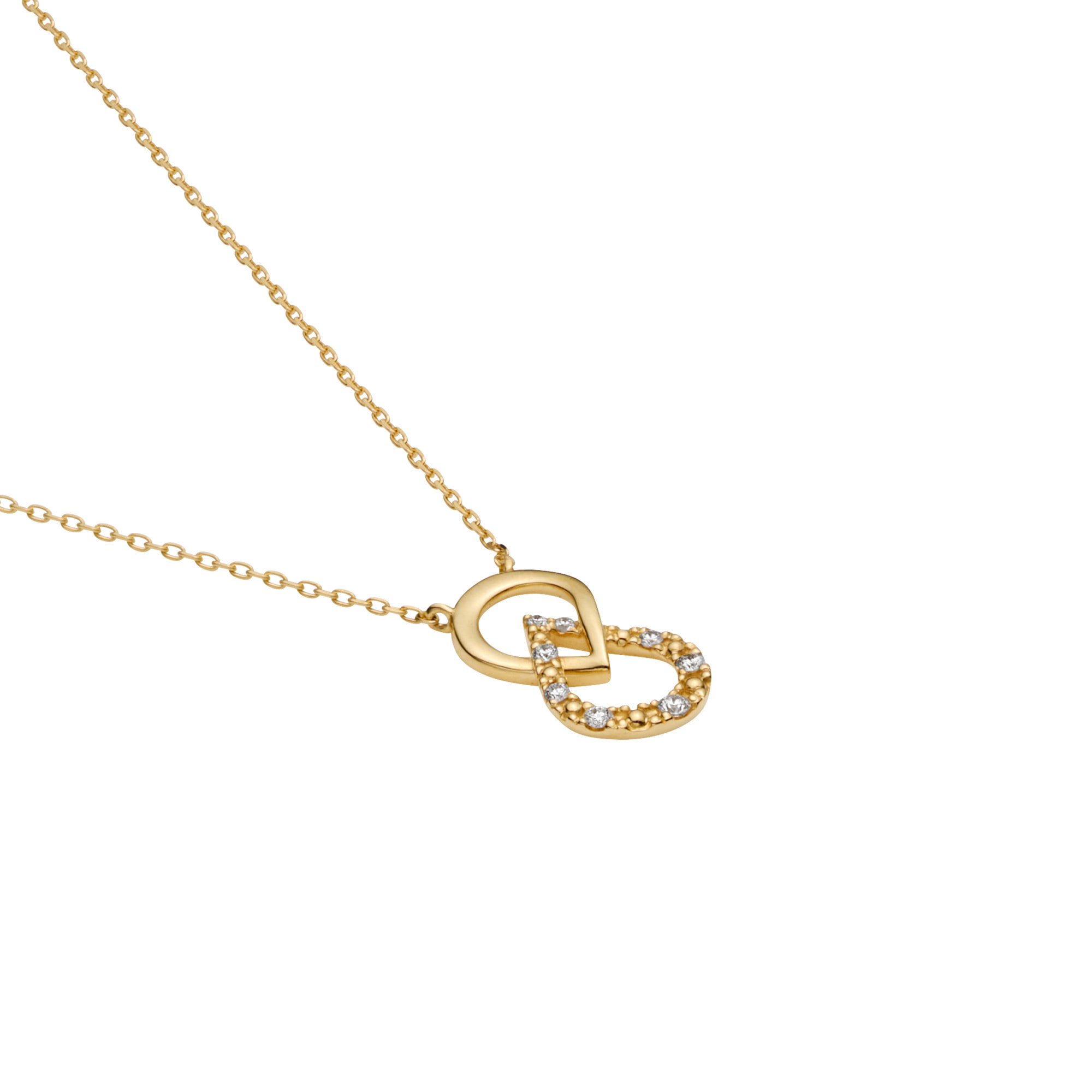 艶やかに磨かれたゴールドと丁寧にセッティングされたダイヤモンド、向かい合う二つの雫が胸元に瑞々しい輝きをもたらすネックレス。
