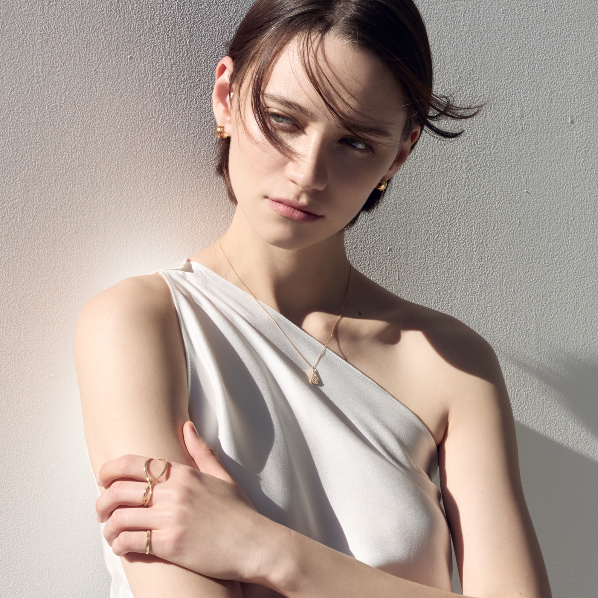 空間を持たせた軽やかなデザインと、みずみずしいダイヤモンドの輝きがスタイリングに明るさと華やかさをもたらすアイテムです。