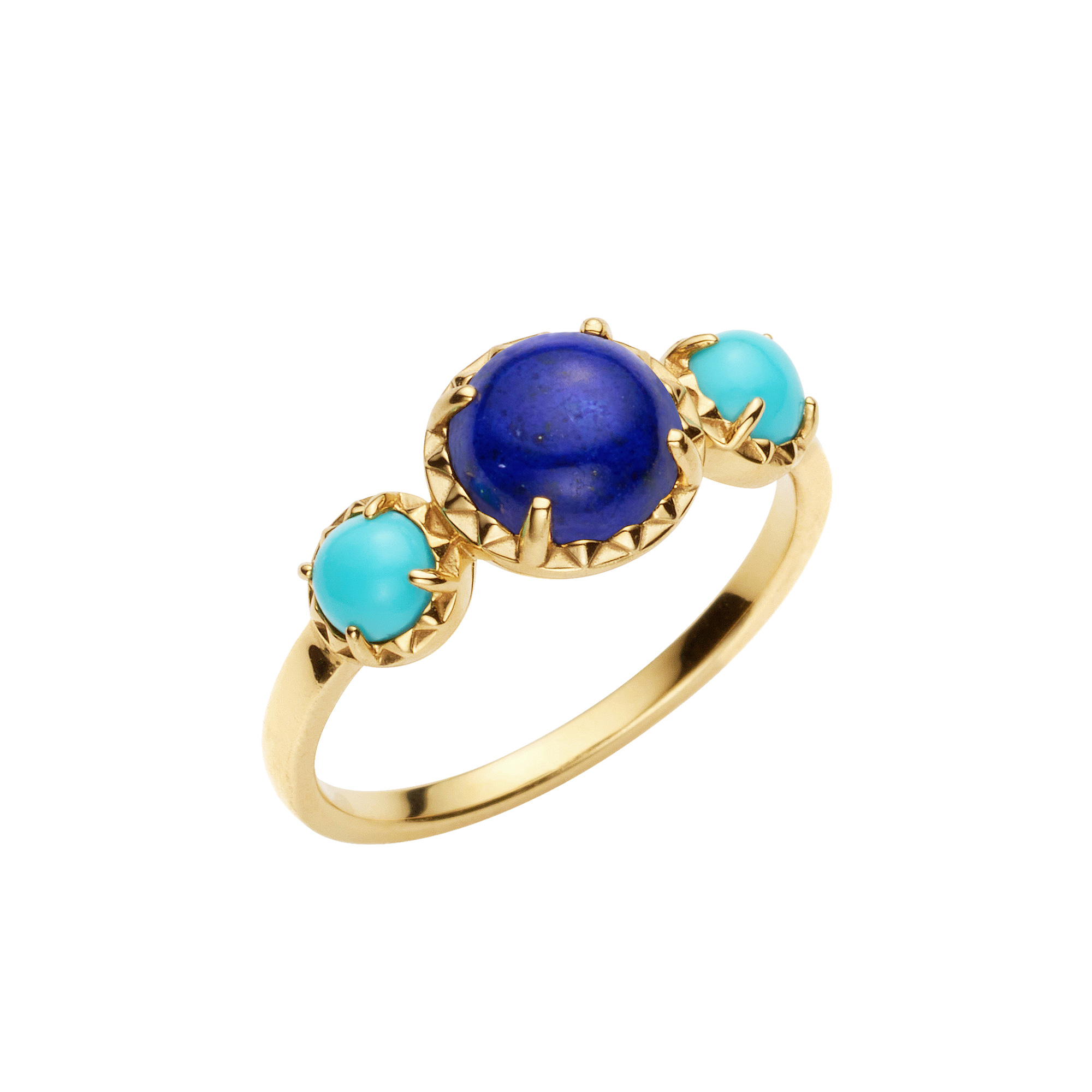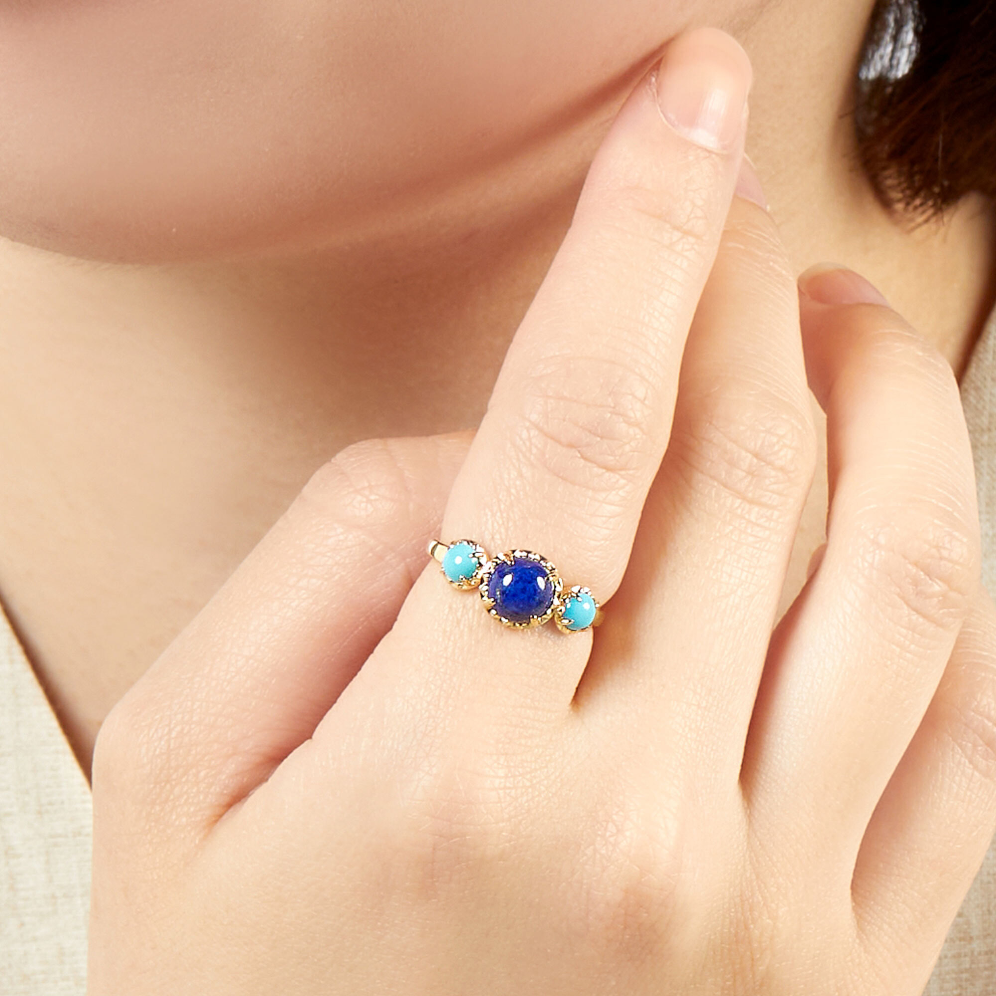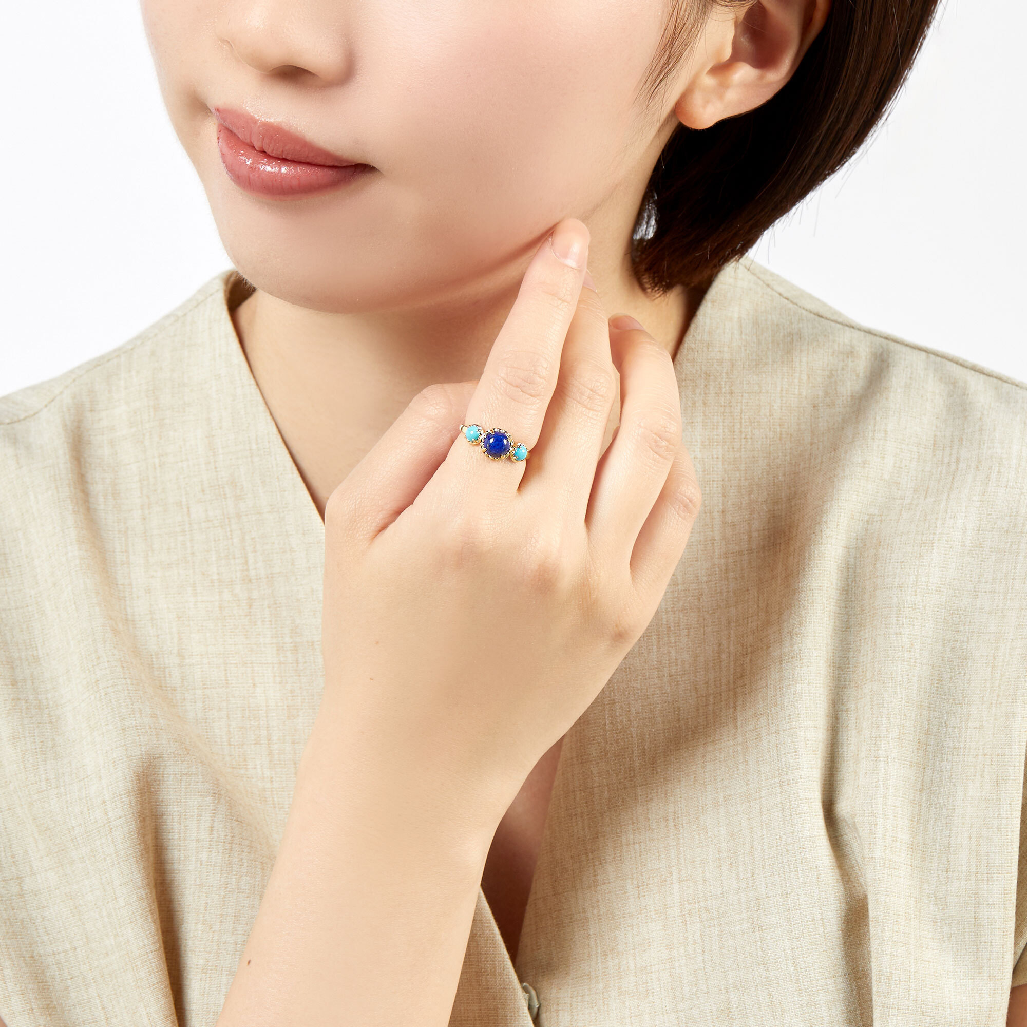 ラピスラズリの紺碧のブルーとターコイズの鮮やかな色合いが印象的なリング。