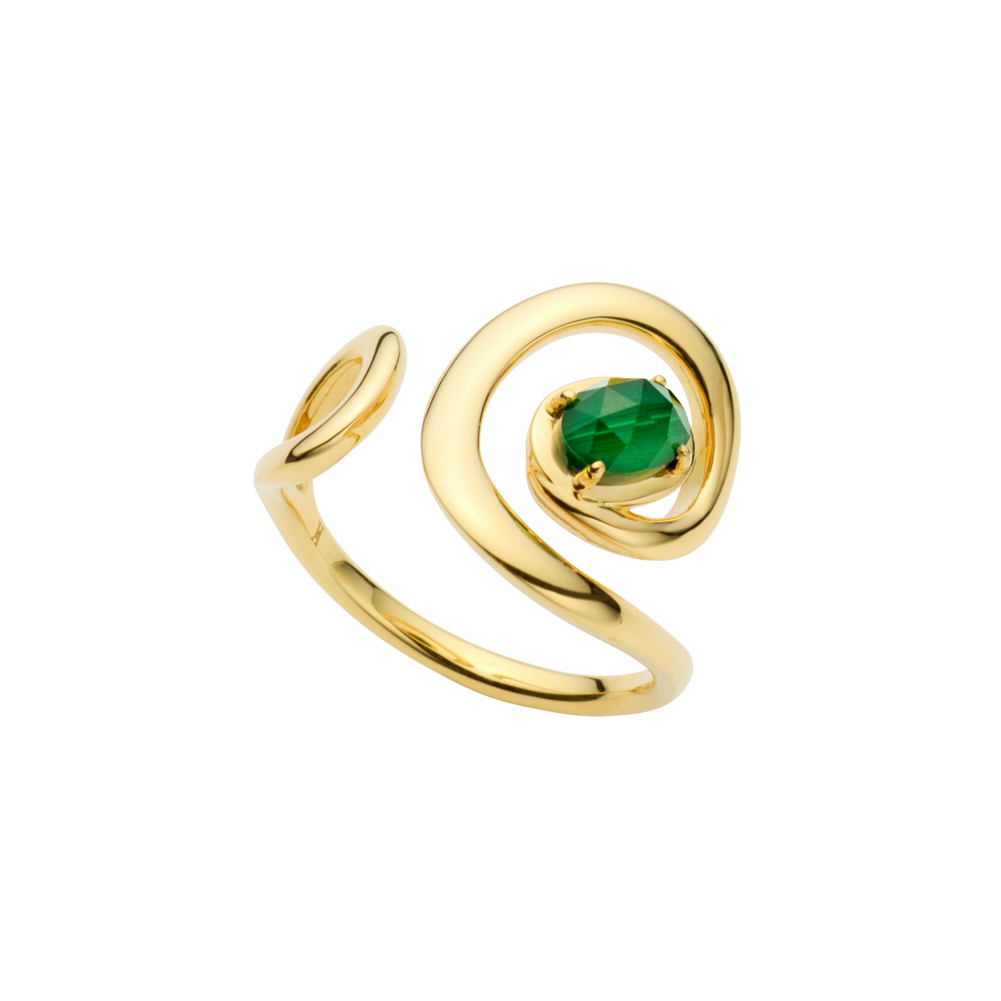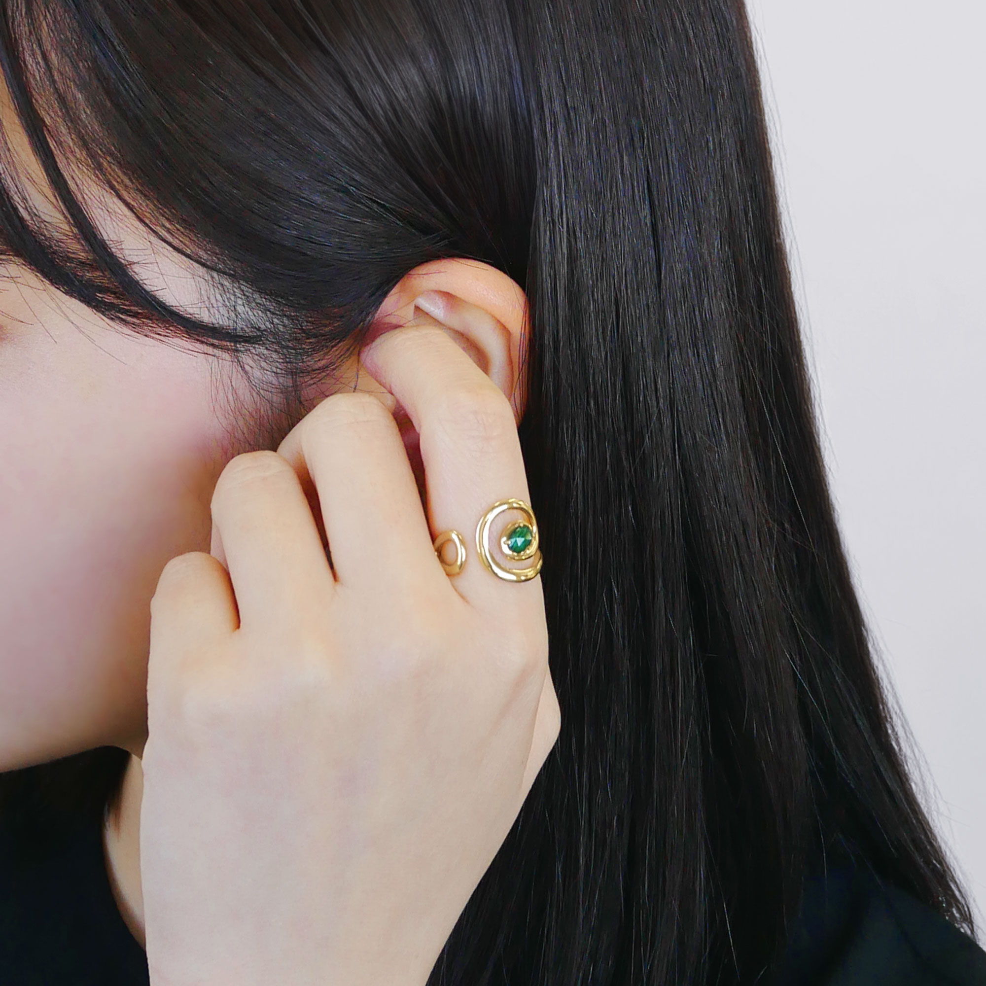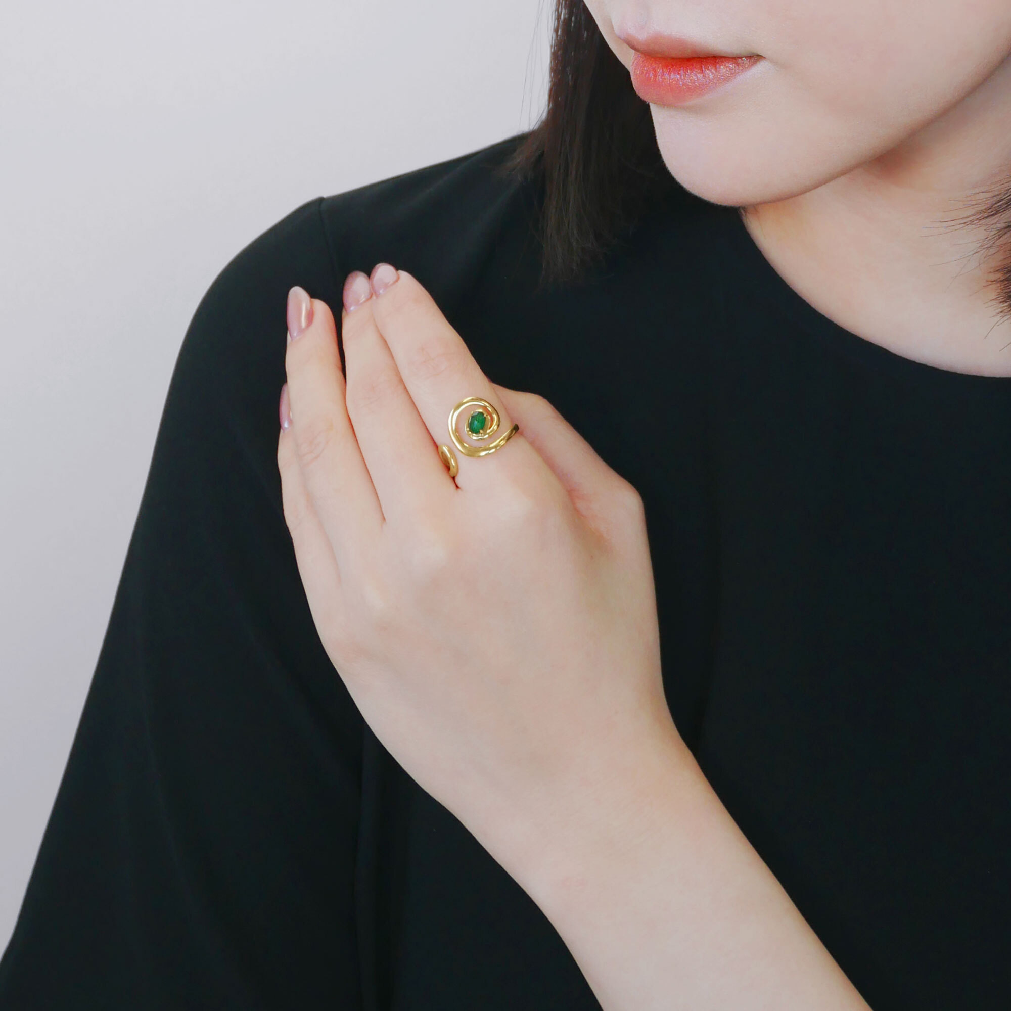 植物の蔓のように細く伸びやかなラインが螺旋を描き、グリーンの石を包み込みます。立体感のあるフォルムは手元に表情を与えてくれます。