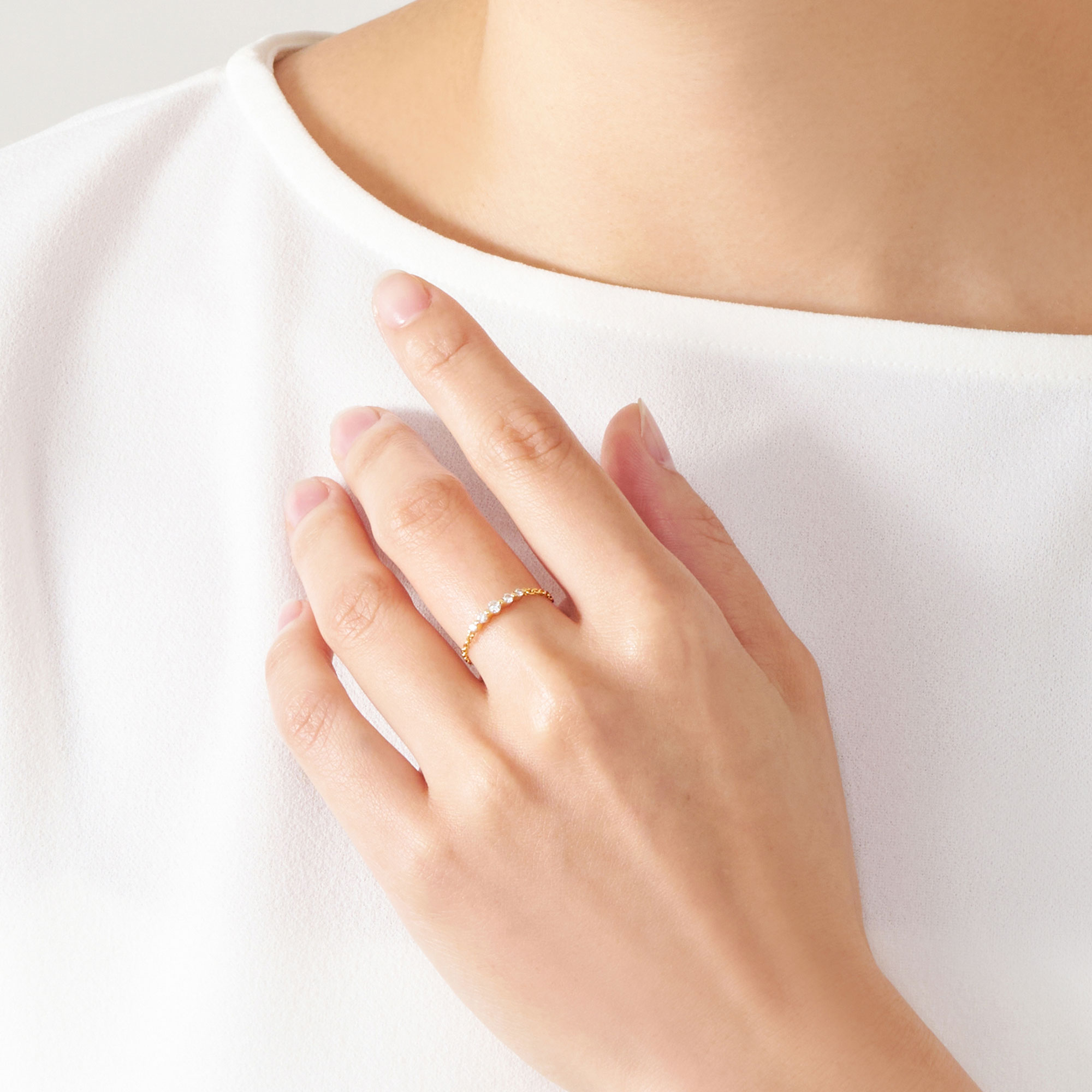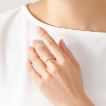 着用の際は、チェーンがねじれていない状態で指を入れ、トップが転がらないよう全体的に少しずつ、指の根元の方におろしていってください。