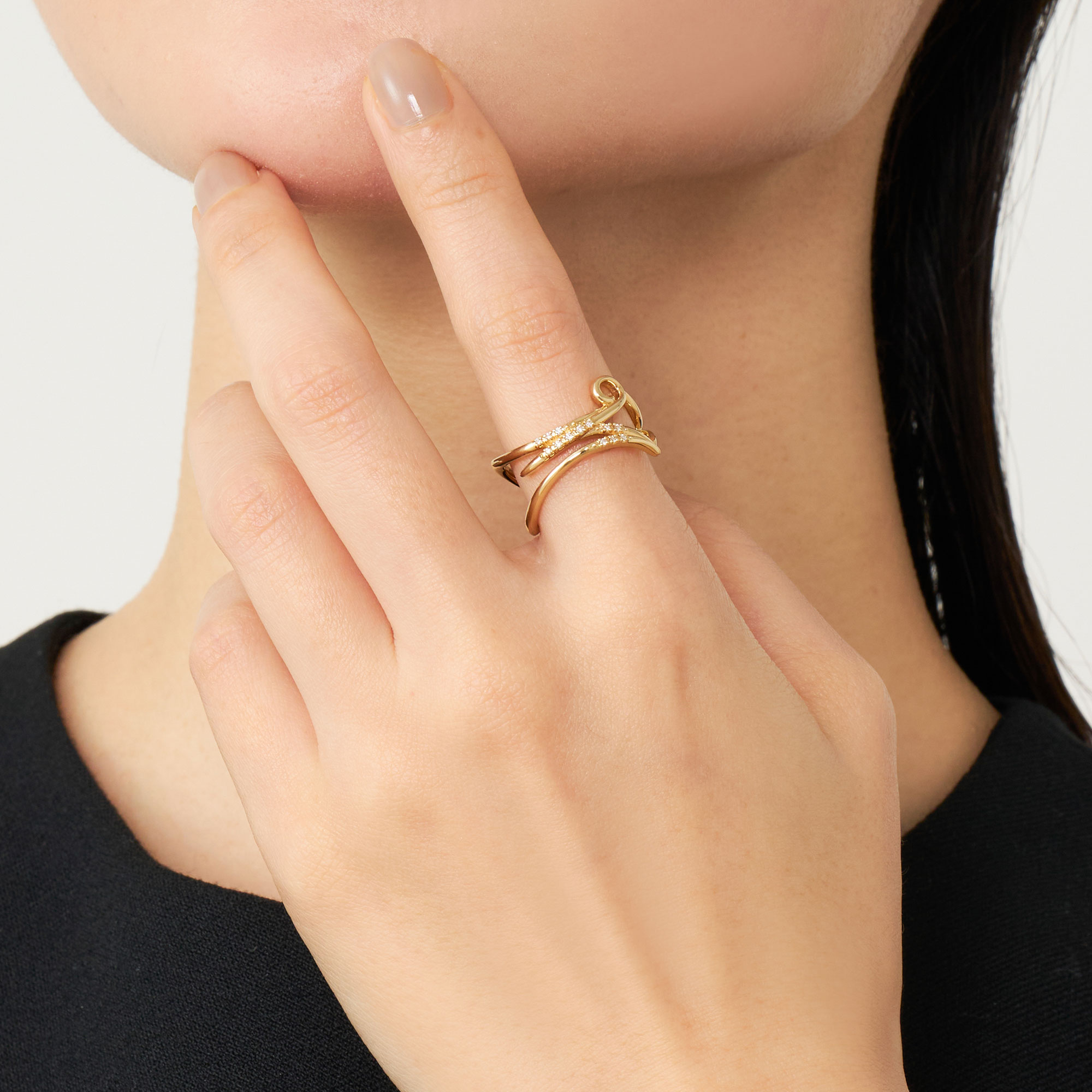 音色豊かな楽器のように、ダイヤモンドを纏った弦を指に巻き付けたようなフォルムが特徴のイニシャルリング。