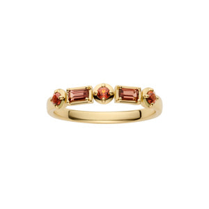 ガーネットとダイヤモンドの煌めきと、イエローゴールドのグラフィカルな模様がモダンなセットリング。