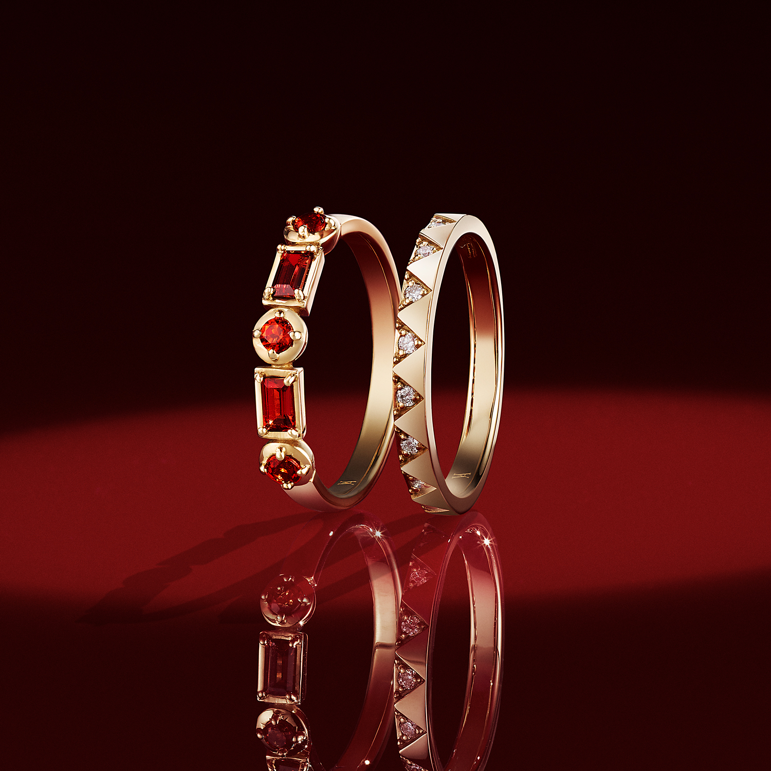 ガーネットのリングに寄り添うのは、三角のカットが繰り返すダイヤモンドリング。