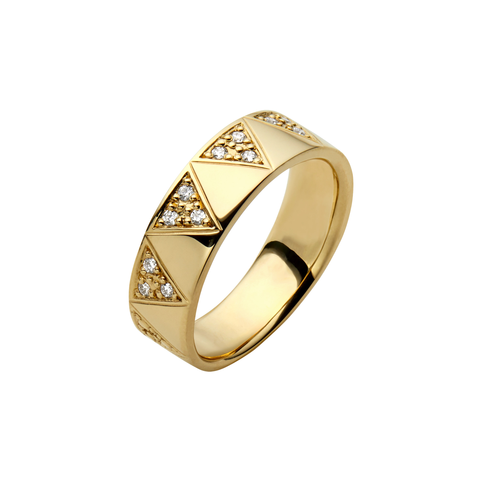 リングの表面に三角形のパターンが繰り返すエッジの効いたデザイン。
