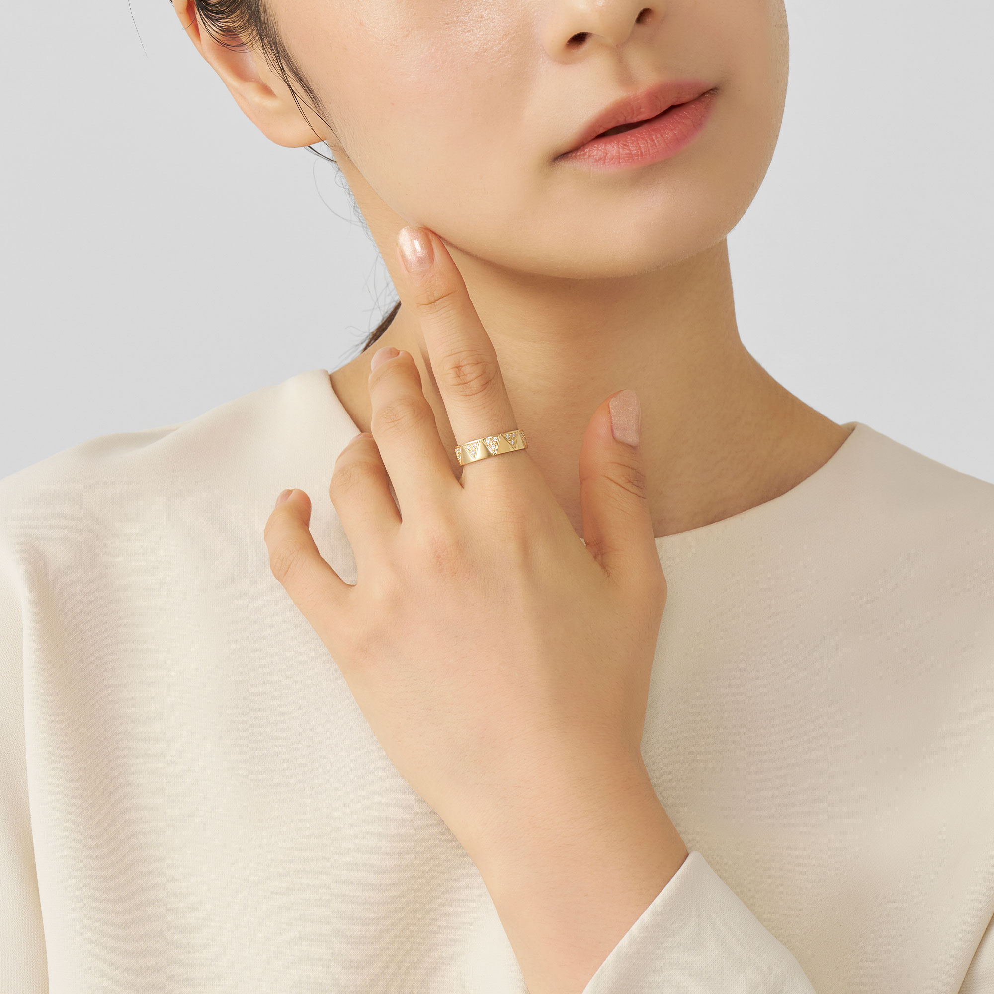 幅広の平打ちのフォルムは存在感がありながら、他のリングと重ね付けすることで手元によりボリューム感を与えてくれます。