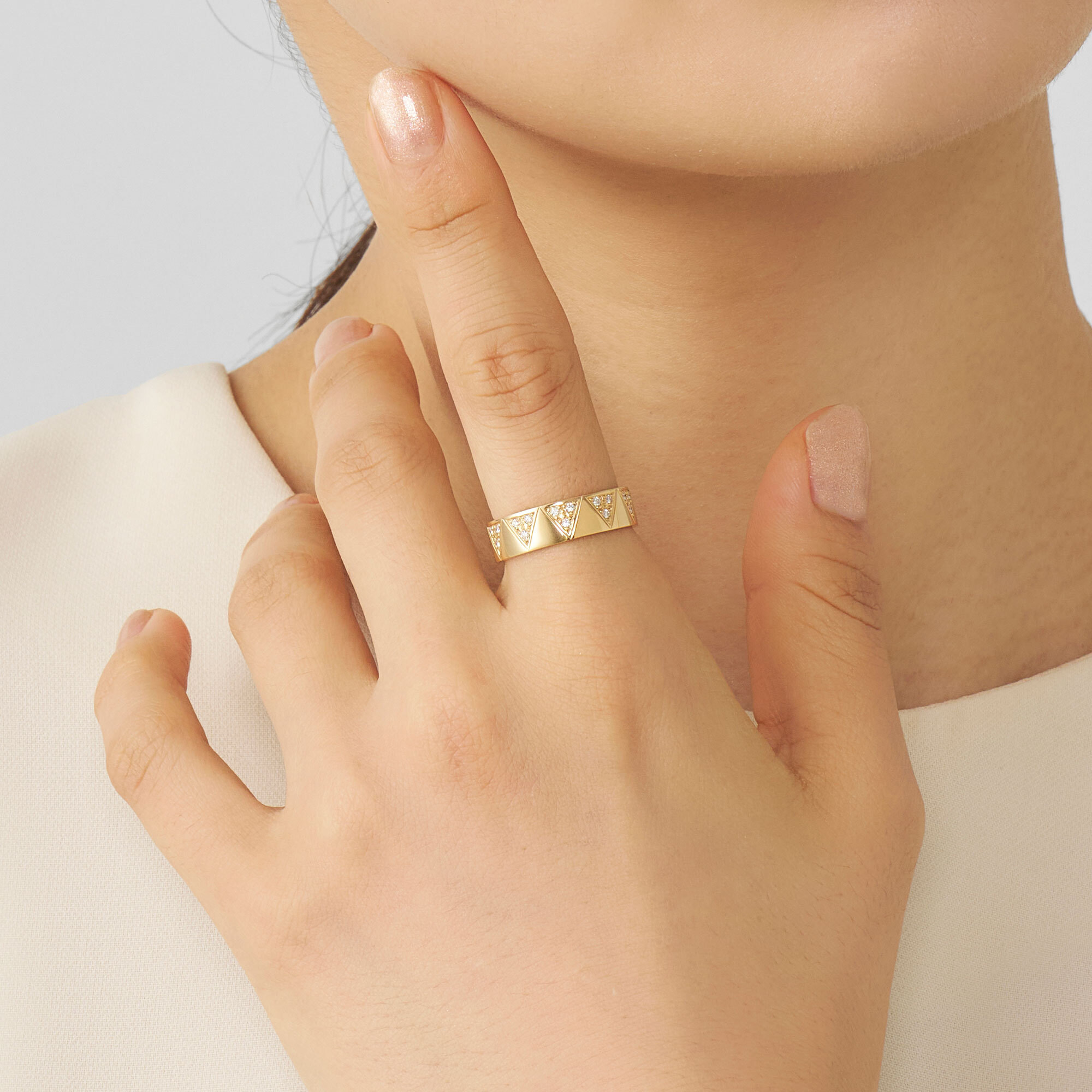 繰り返す三角形のパターンと煌めくダイヤモンドが、モダンな印象のリング。