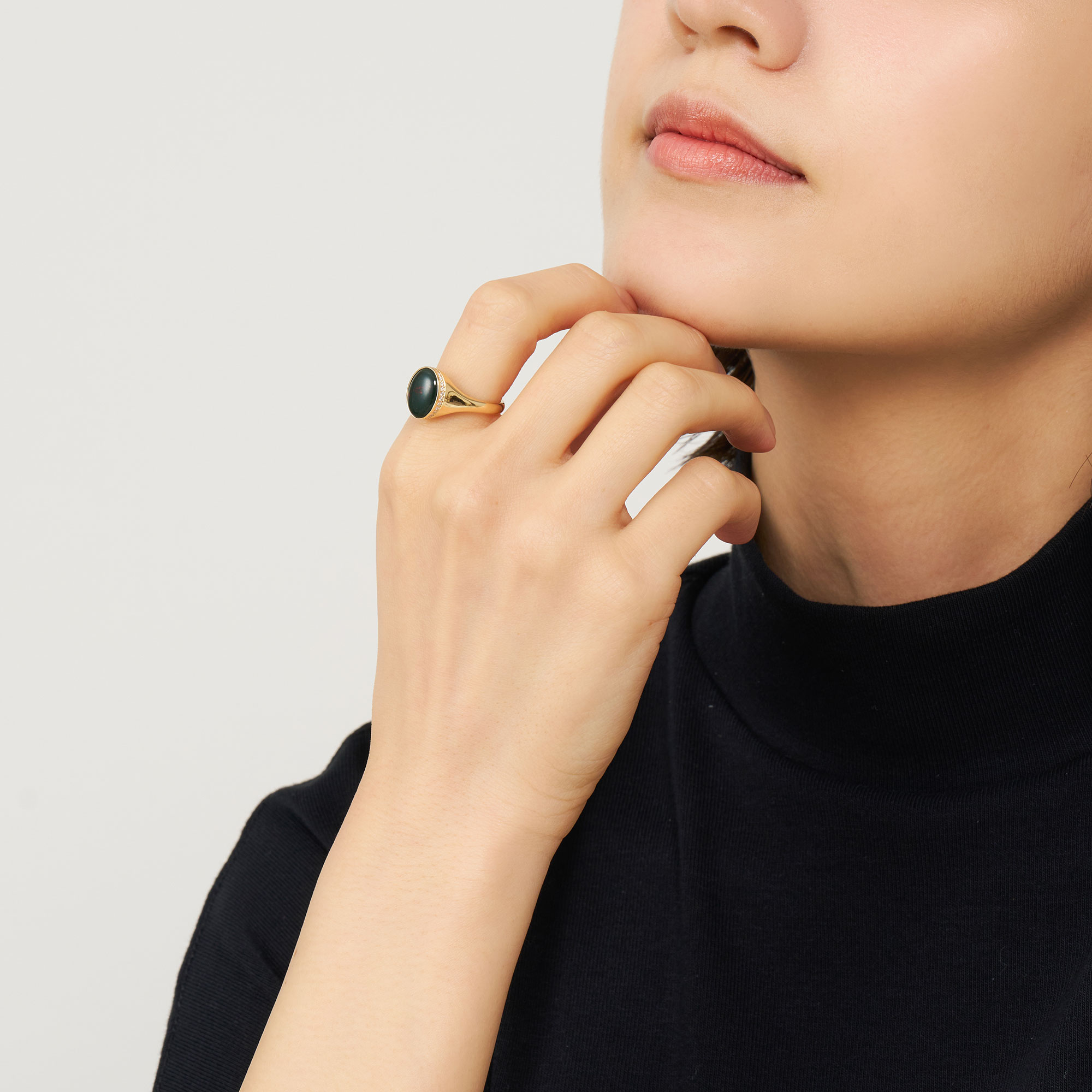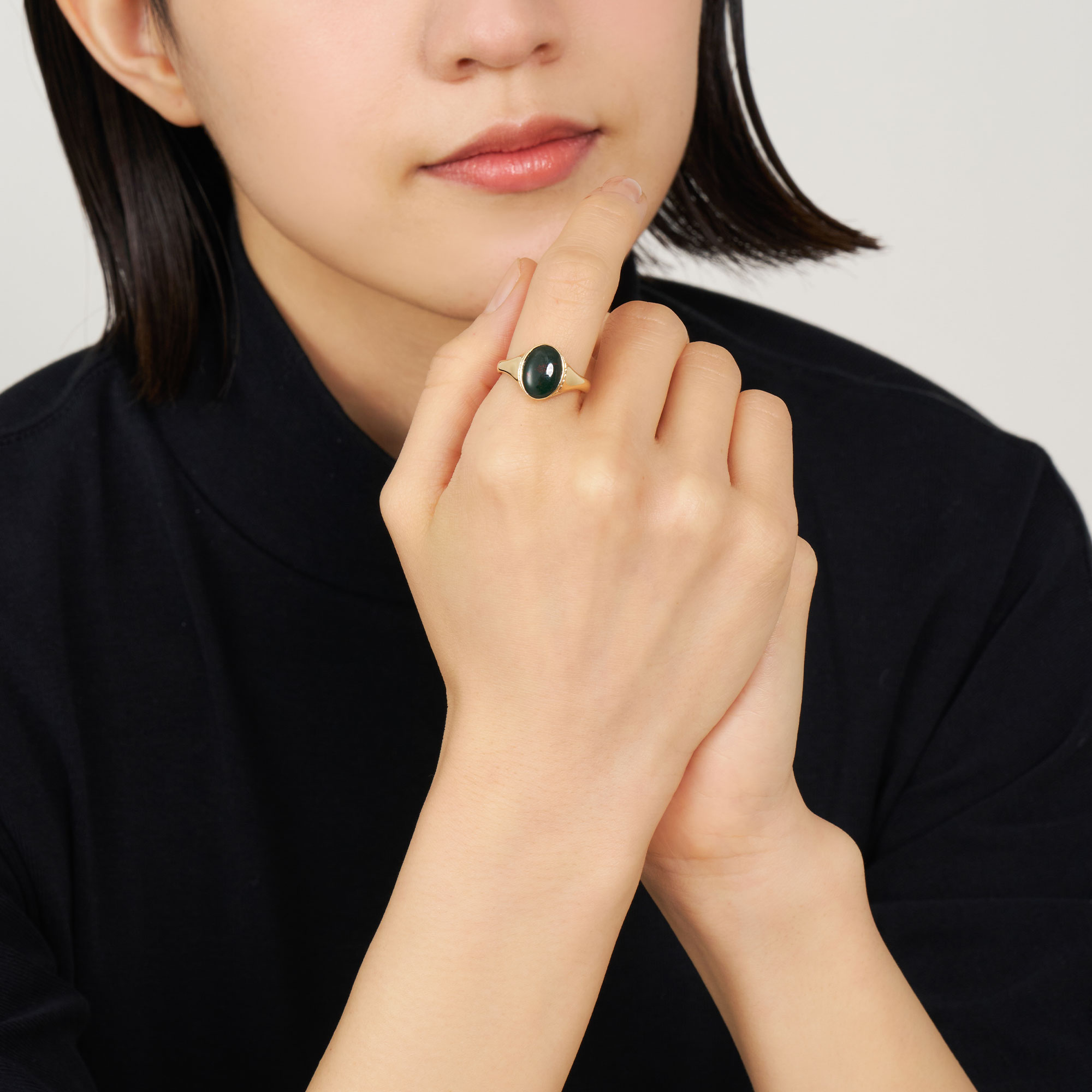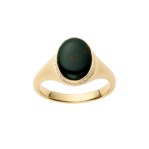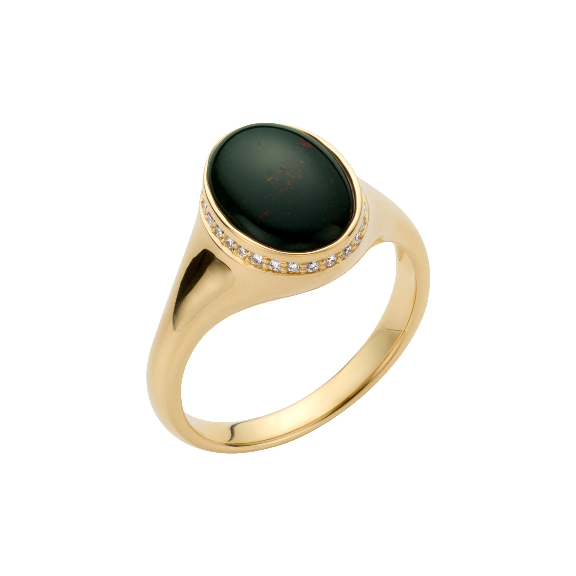シグネットリングの洗練されたフォルムに、色合いが鮮烈な印象を与えるブラッドストーンをあしらったリング。