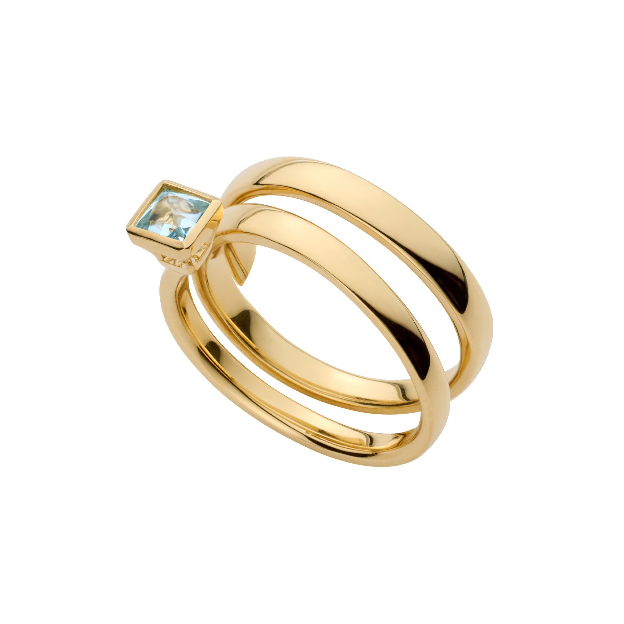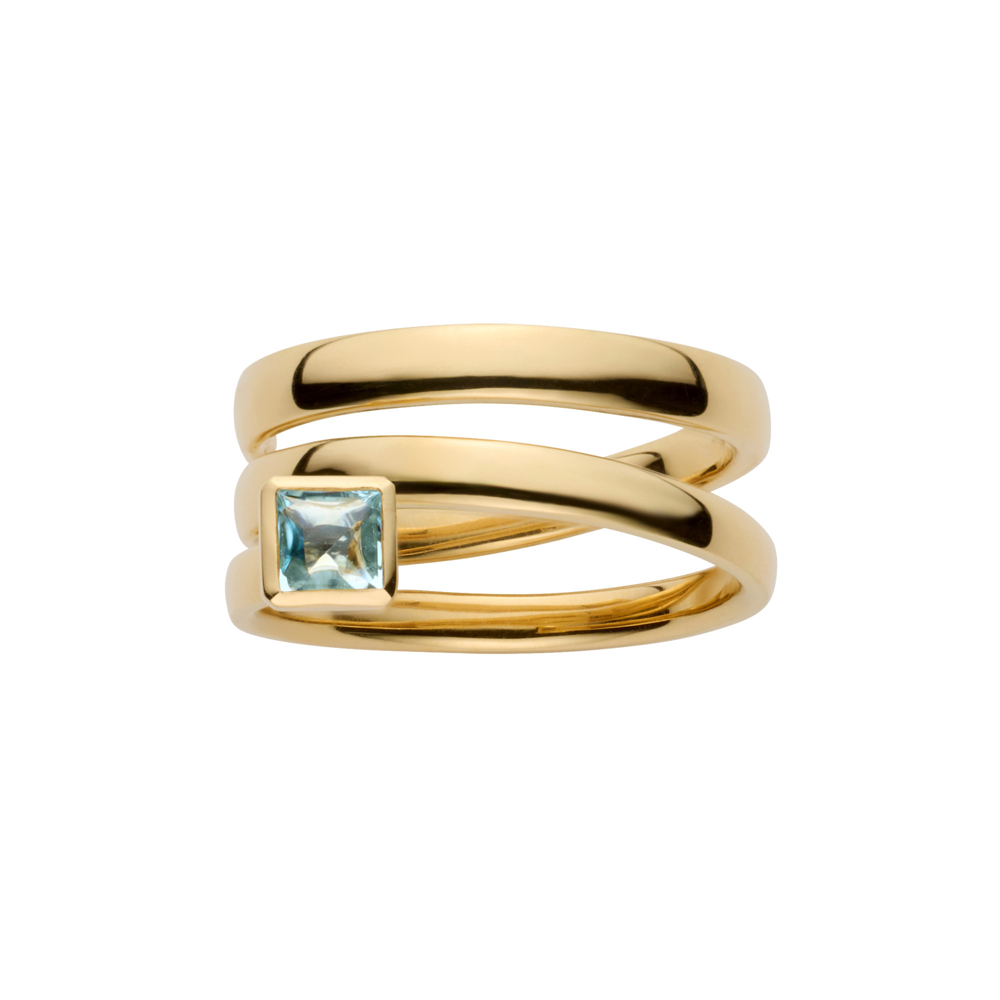 スクエアのシェイプと淡いブルーが爽やかなスカイブルートパーズは、表面の滑らかさがアームの艶感とリンクし、透明感が際立つバフトップカットをセレクト。