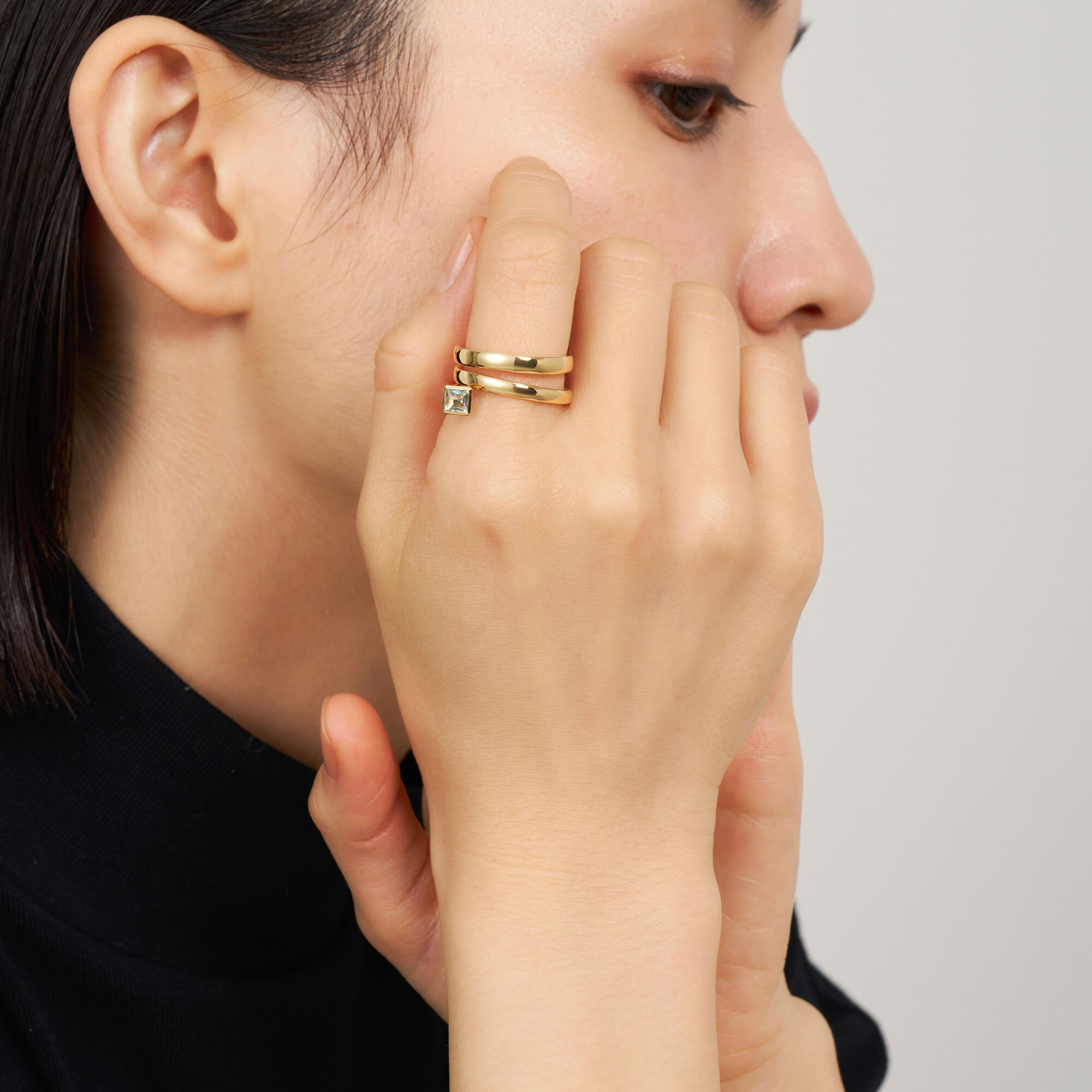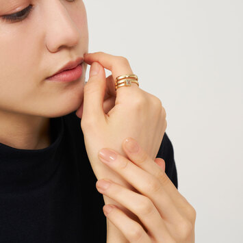 指に巻き付くイエローゴールドのアームとユニークな石の配置が印象的なリング。