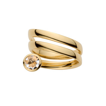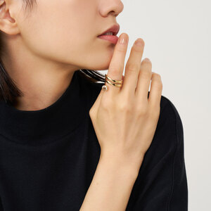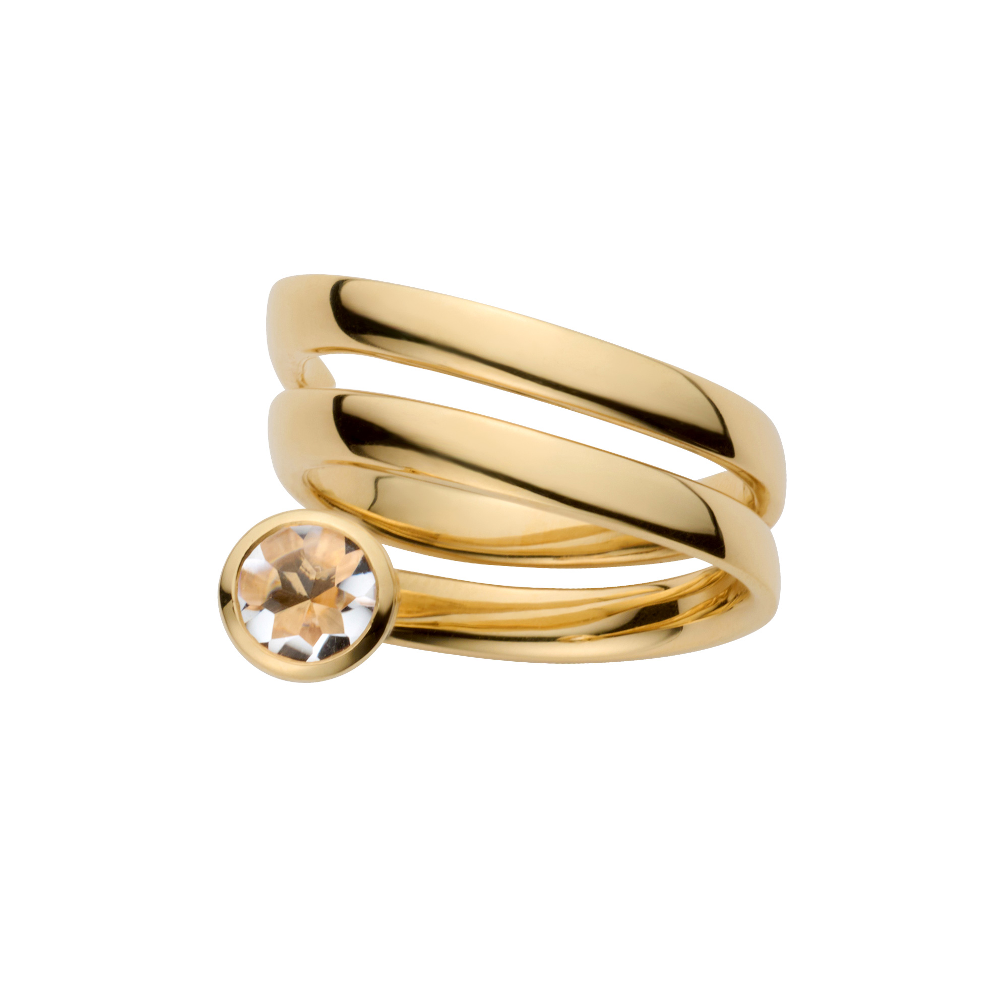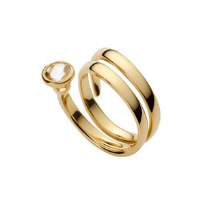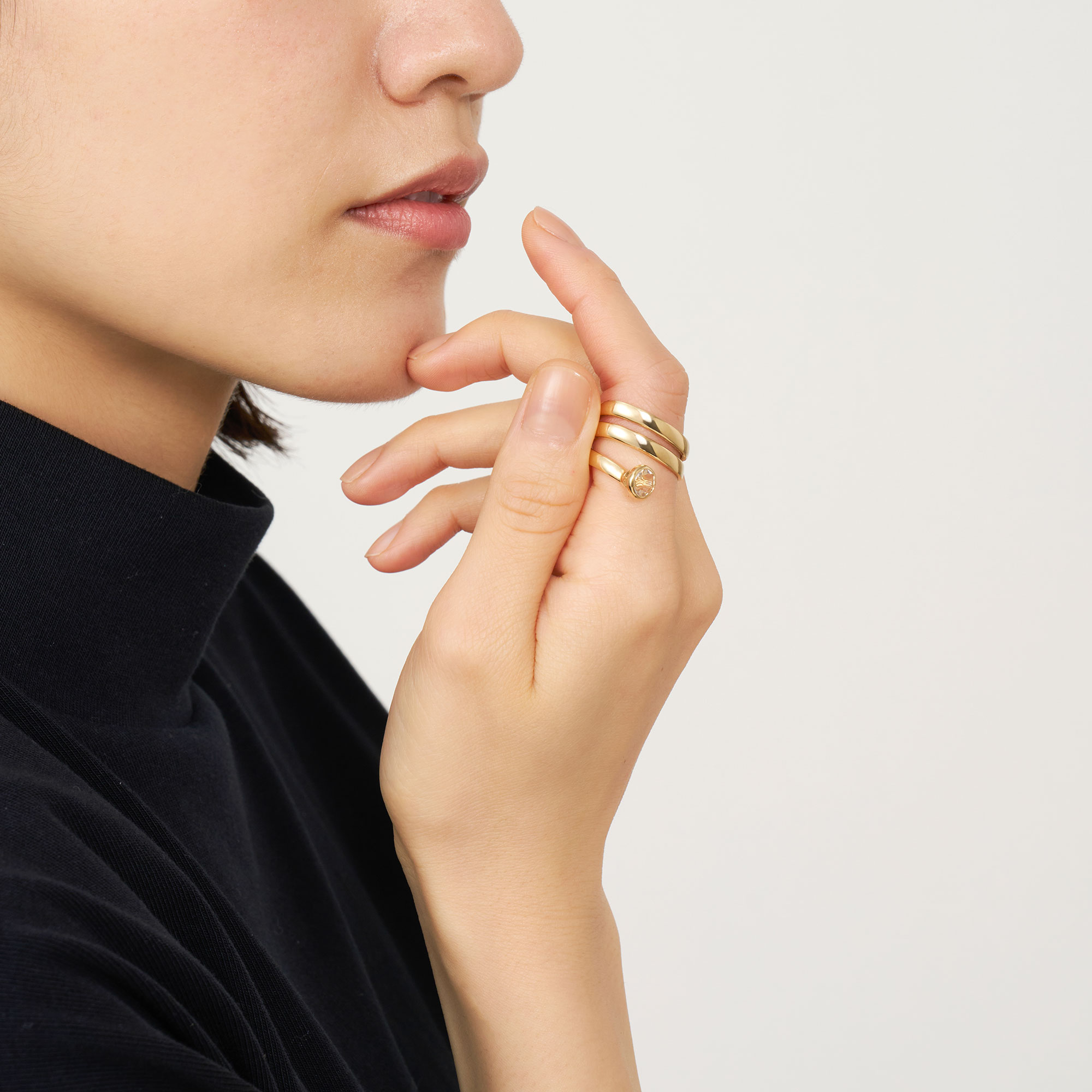 指に巻き付くイエローゴールドのアームとユニークな石の配置が印象的なリング。