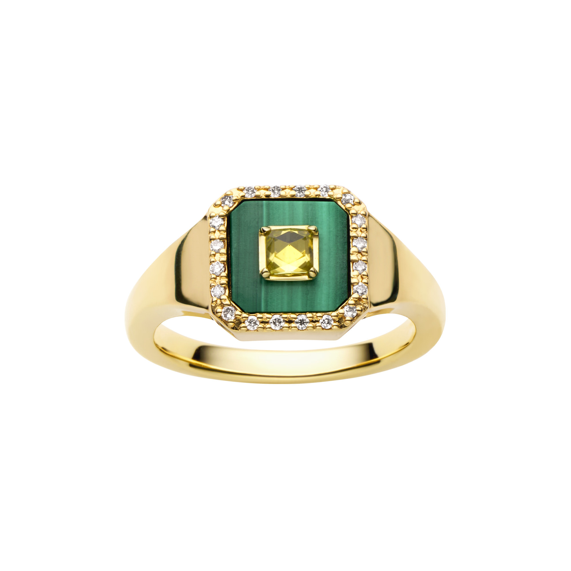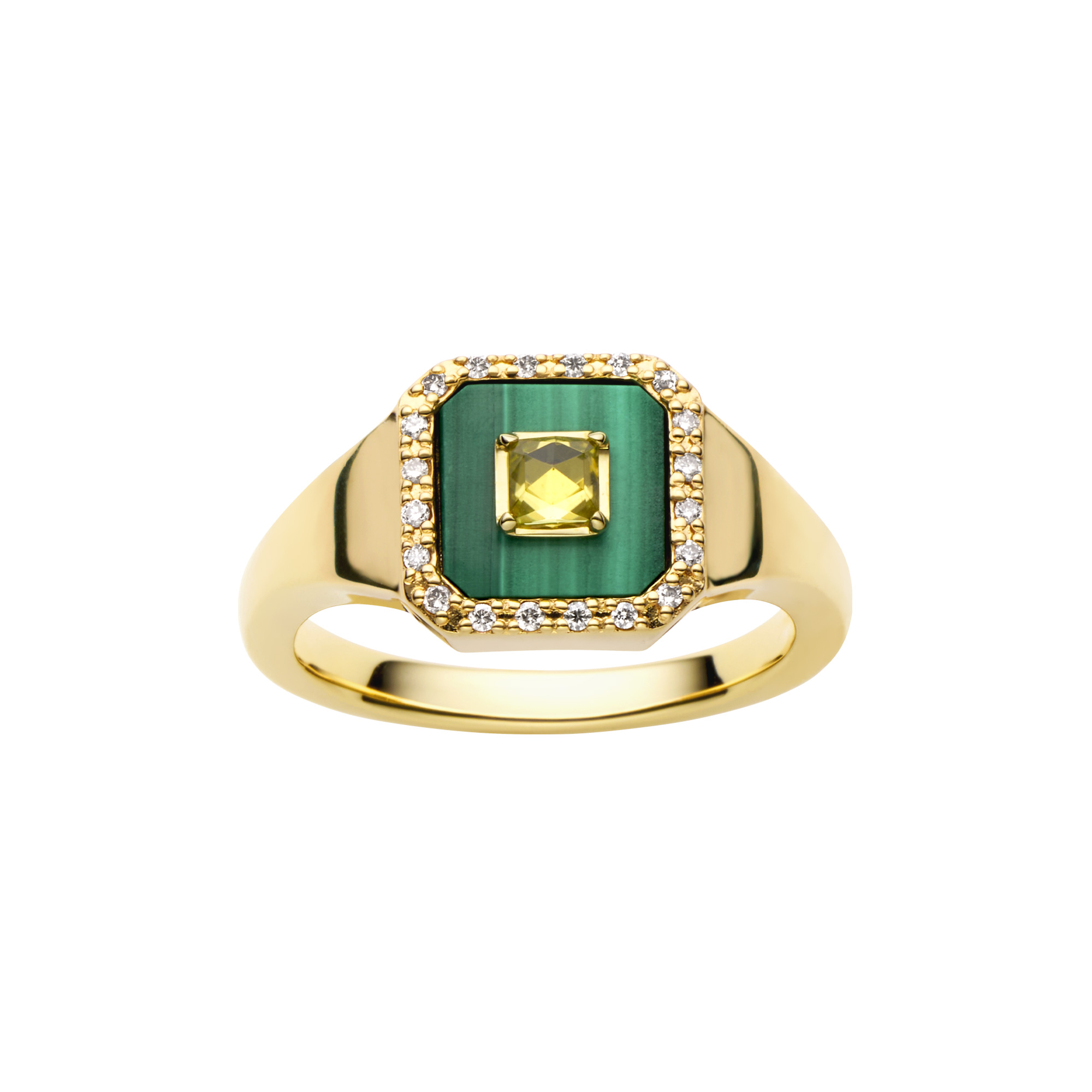 透明感のあるローズカットが、マラカイトの翠緑に輝きを添え、2種の魅力的な色石が互いに共鳴し、存在感をもたらします。