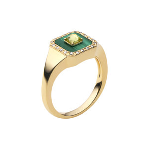 重なるグリーンの色合いとブラウンダイヤモンドの繊細なきらめきが印象的なリング。