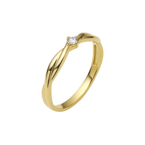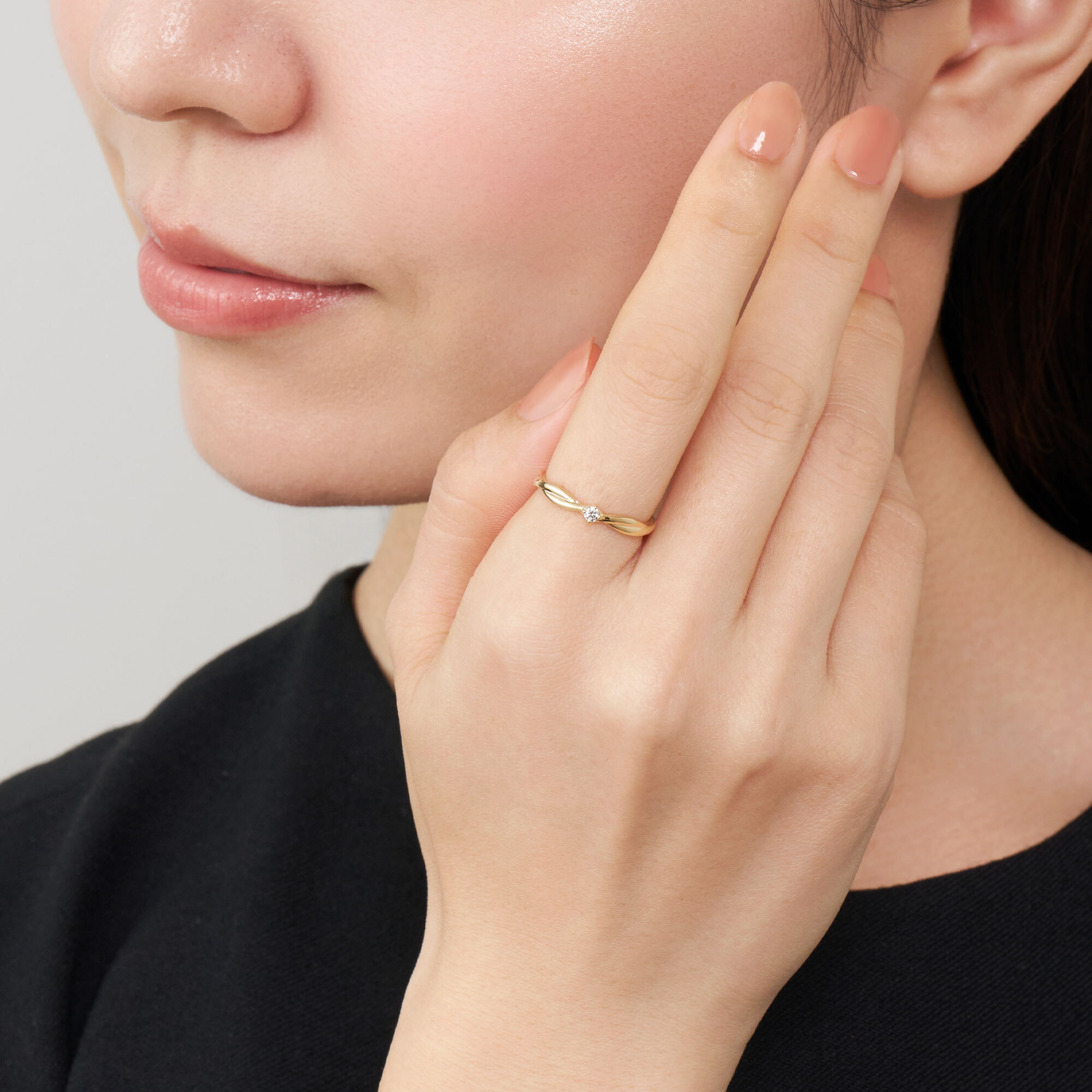優しくカーブを描きながらクロスする2本のラインに、一粒のダイヤモンドが輝くリング。