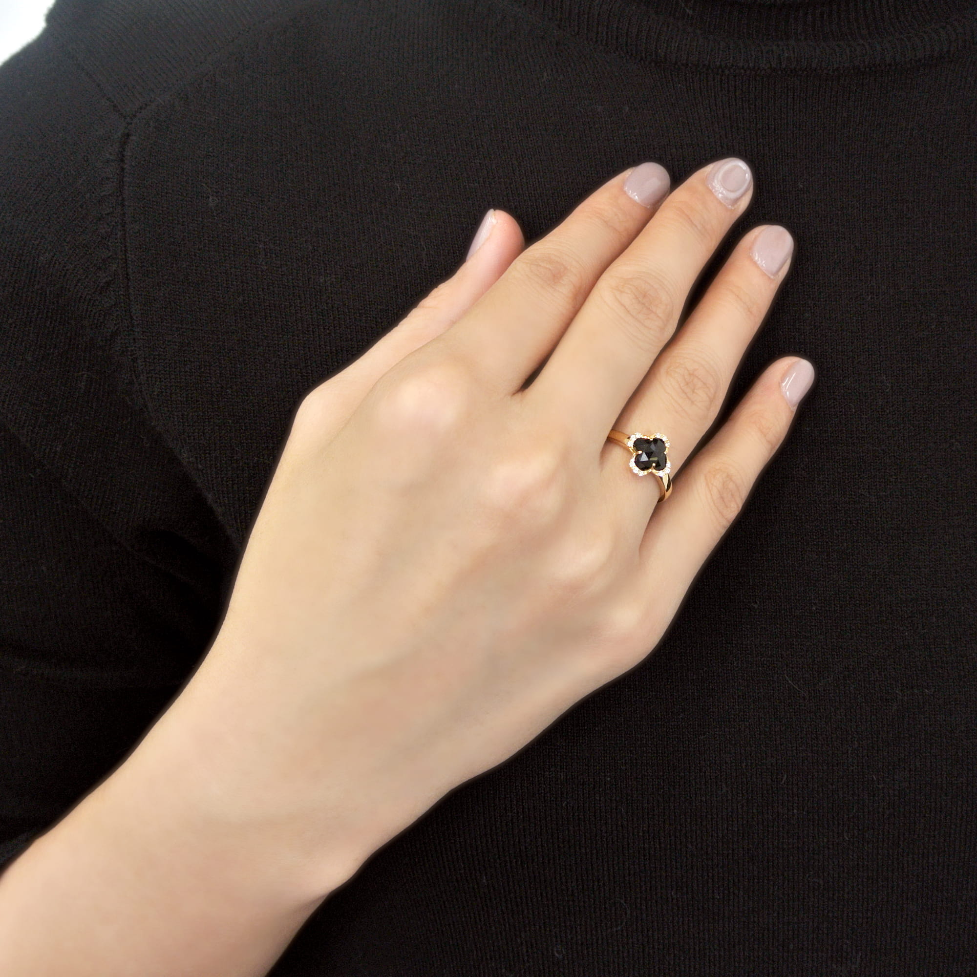 クローバー型にカットされたブラックカルセドニーの上に、ローズカットのクォーツを乗せてセッティング。